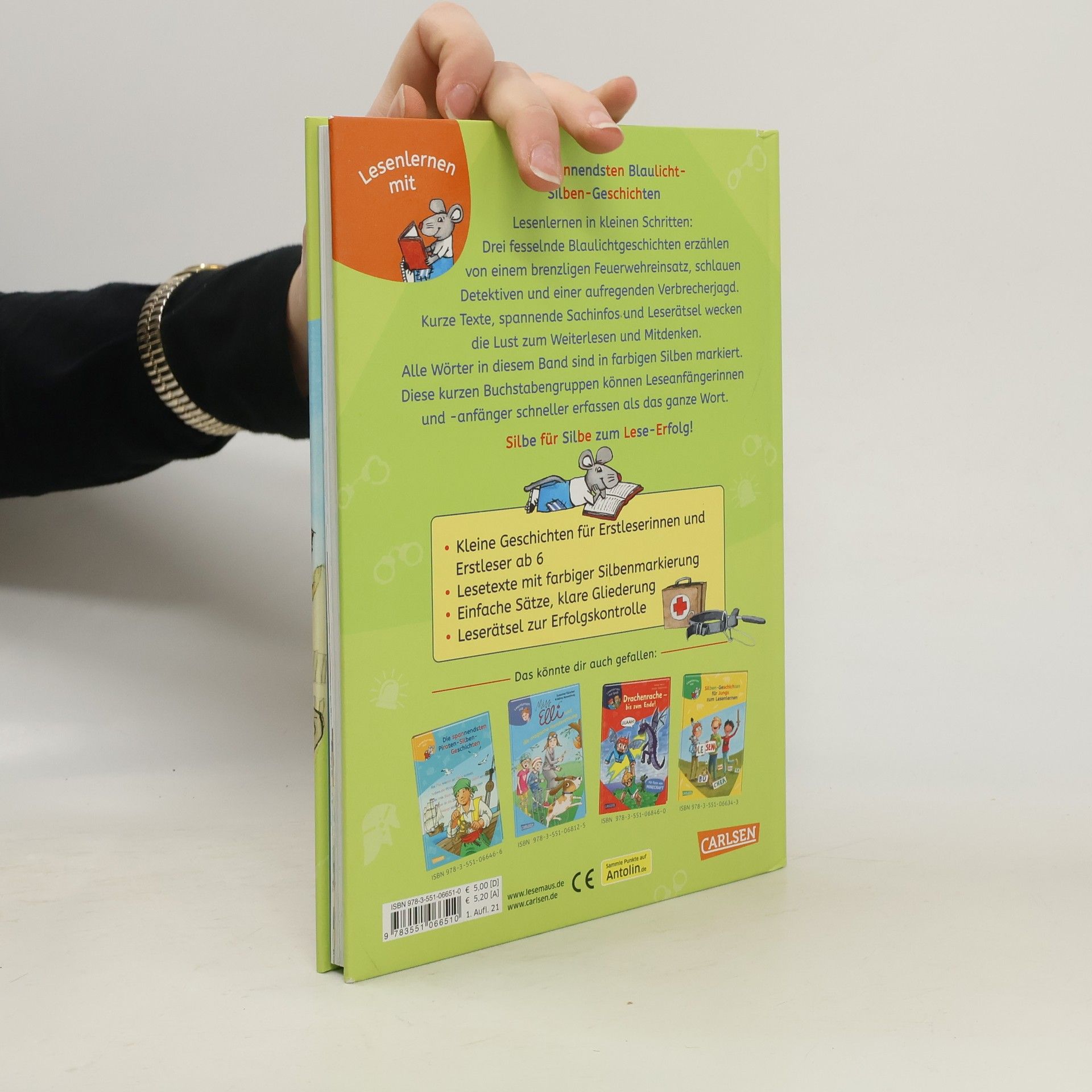 Drei fesselnde Blaulichtgeschichten erzählen von einem brenzligen Feuerwehreinsatz, schlauen Detektiven und einer aufregenden Verbrecherjagd. Alle Wörter in diesem Band sind in farbigen Silben markiert. Diese kurzen Buchstabengruppen können Leseanfänger*innen schneller erfassen als das ganze Wort. Kurze Texte, spannende Sachinfos und Leserätsel wecken die Lust zum Weiterlesen und Mitdenken. Enthält folgende Geschichten: Ein Fall für die Polizei Ein Fall für die Feuerwehr Ein Fall für die Kripo LESEMAUS zum LESENLERNEN – die Reihe für Erstleser! Spannende und leichte Geschichten für Jungs und Mädchen, lustige Leserätsel und kindgerechte Sachinfos motivieren Leseanfänger zum Weiterlesen und Mitdenken.