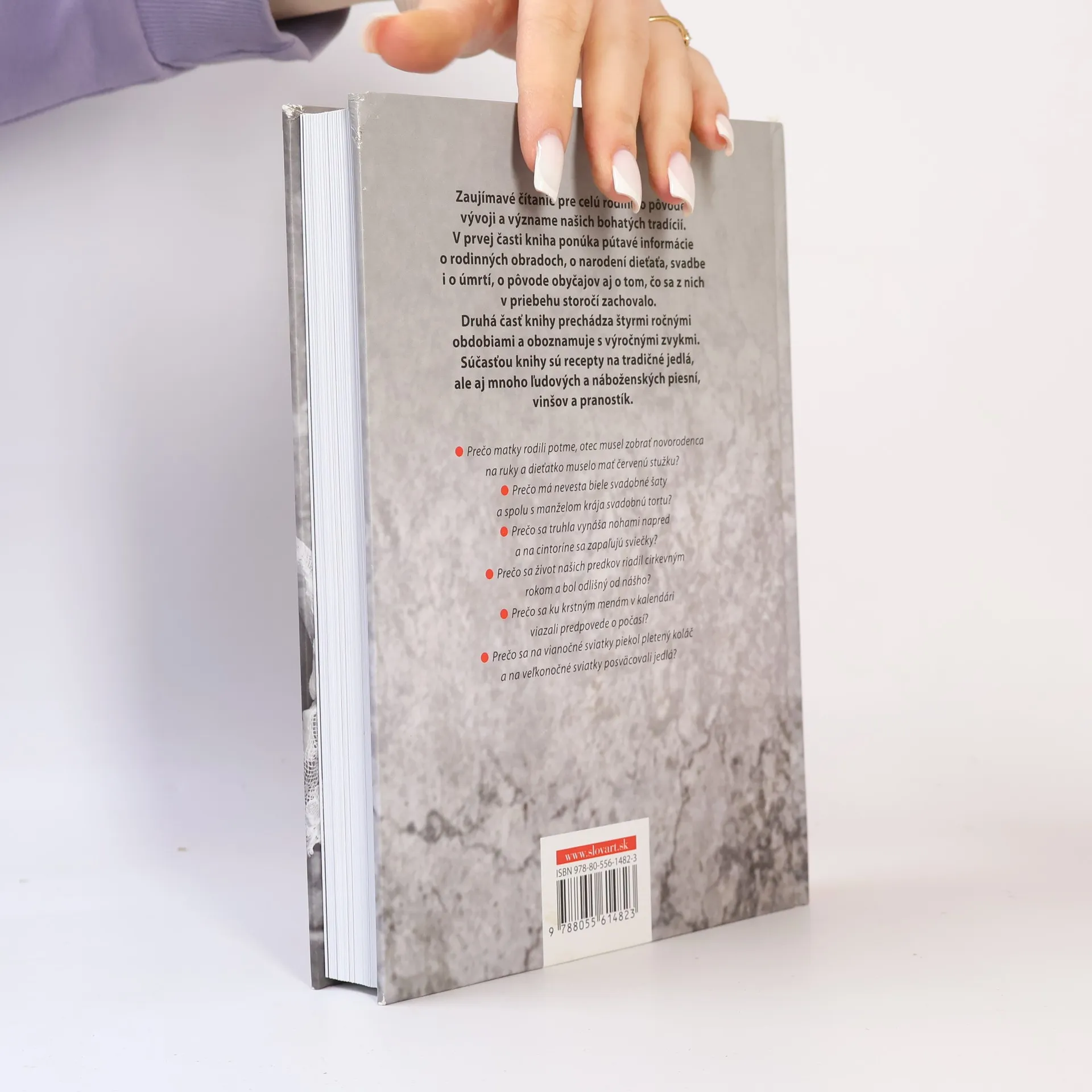 Kniha Tradície na Slovensku je zaujímavým čítaním pre celú rodinu o pôvode, vývoji a význame našich bohatých tradícií. V prvej časti ponúka pútavé informácie o rodinnom zvykosloví, o narodení dieťaťa, svadbe i o úmrtí, o pôvode zvykov a obradov aj o tom, čo sa z nich v priebehu storočí zachovalo. Druhá časť knihy prechádza štyrmi ročnými obdobiami a oboznamuje s výročnými zvykmi a obradmi. Súčasťou knihy je receptár s tradičnými jedlami, ale aj mnoho piesní, riekaniek a pranostík.