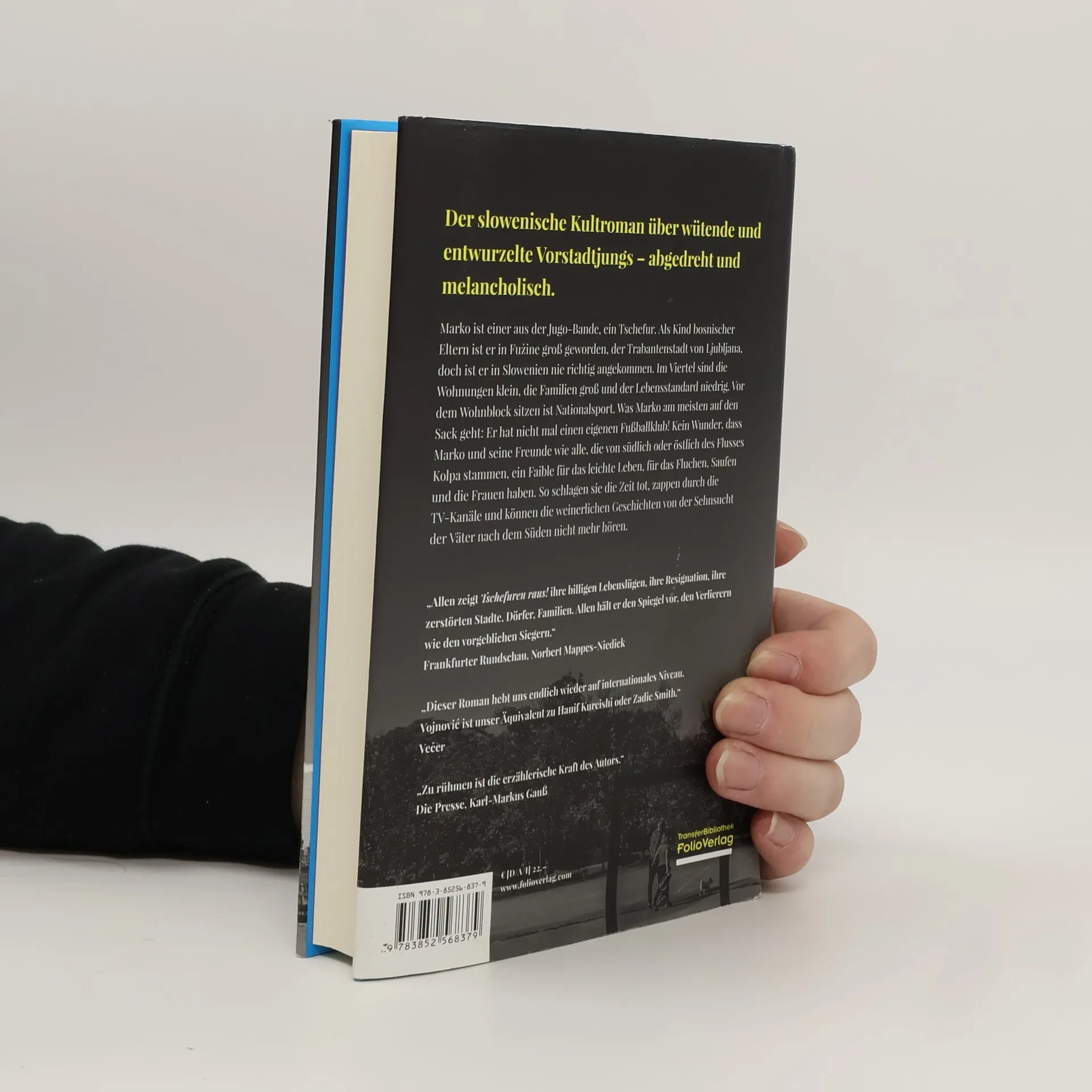 Der slowenische Kultroman über wütende und entwurzelte Vorstadtjungs – abgedreht und melancholisch. Marko ist einer aus der Jugo-Bande, ein Tschefur. Als Kind bosnischer Eltern ist er in Fužine groß geworden, der Trabantenstadt von Ljubljana, doch ist er in Slowenien nie richtig angekommen. Im Viertel sind die Wohnungen klein, die Familien groß und der Lebensstandard niedrig. Vor dem Wohnblock sitzen ist Nationalsport. Was Marko am meisten auf den Sack geht: Er hat nicht mal einen eigenen Fußballklub! Kein Wunder, dass Marko und seine Freunde wie alle, die von südlich oder östlich des Flusses Kolpa stammen, ein Faible für das leichte Leben, für das Fluchen, Saufen und die Frauen haben. So schlagen sie die Zeit tot, zappen durch die TV-Kanäle und können die weinerlichen Geschichten von der Sehnsucht der Väter nach dem Süden nicht mehr hören.