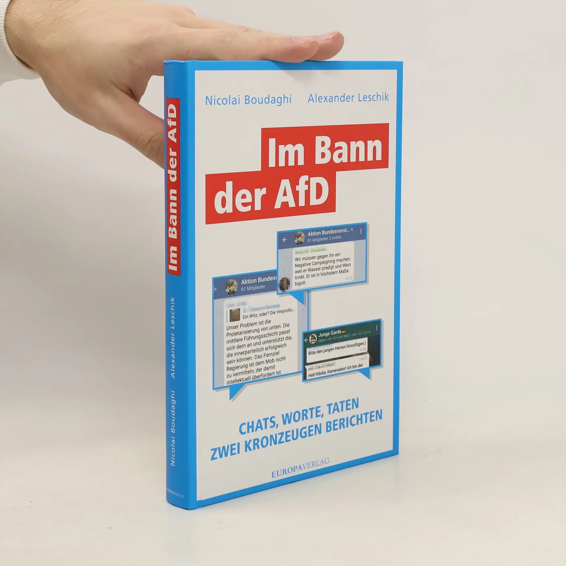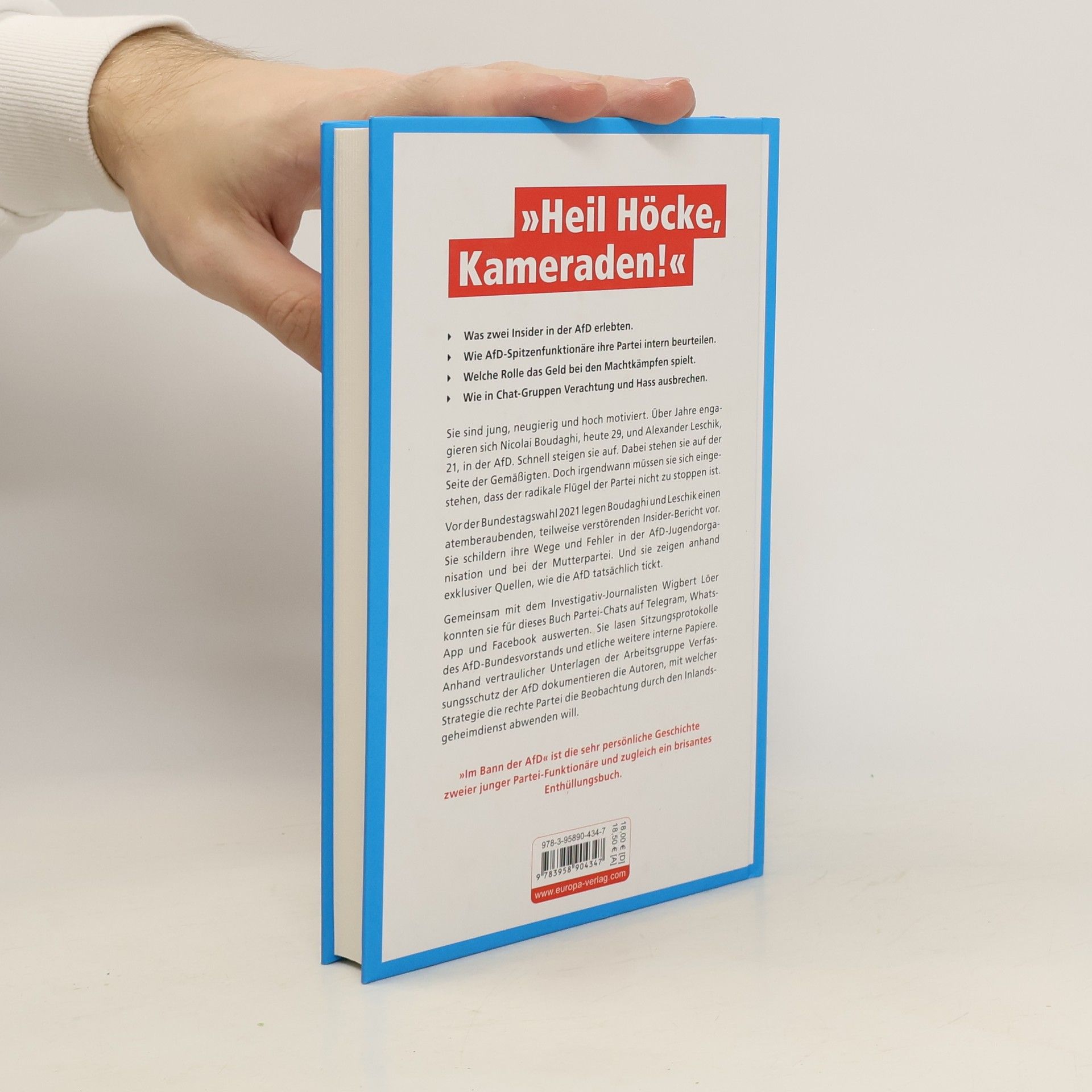 Sie sind jung, neugierig und hoch motiviert. Über Jahre engagieren sich Nicolai Boudaghi, heute 29, und Alexander Leschik, 21, in der AfD. Schnell steigen sie auf. Dabei stehen sie auf der Seite der Gemäßigten. Doch irgendwann müssen sie sich eingestehen, dass der radikale Flügel der Partei nicht zu stoppen ist. Vor der Bundestagswahl 2021 legen Boudaghi und Leschik einen atemberaubenden, teilweise verstörenden Insider-Bericht vor. Sie schildern ihre Wege und Fehler in der AfD-Jugendorganisation und bei der Mutterpartei. Und sie zeigen anhand exklusiver Quellen, wie die AfD tatsächlich tickt. Gemeinsam mit dem Investigativ-Journalisten und Bestseller-Autor Wigbert Löer konnten sie für dieses Buch Partei-Chats auf Telegram, Whatsapp und Facebook auswerten. Sie lasen Sitzungsprotokolle des AfD-Bundesvorstands und etliche weitere interne Papiere. So ist „Im Bann der AfD“ die sehr persönliche Geschichte zweier junger Partei-Funktionäre und zugleich ein brisantes Enthüllungsbuch.