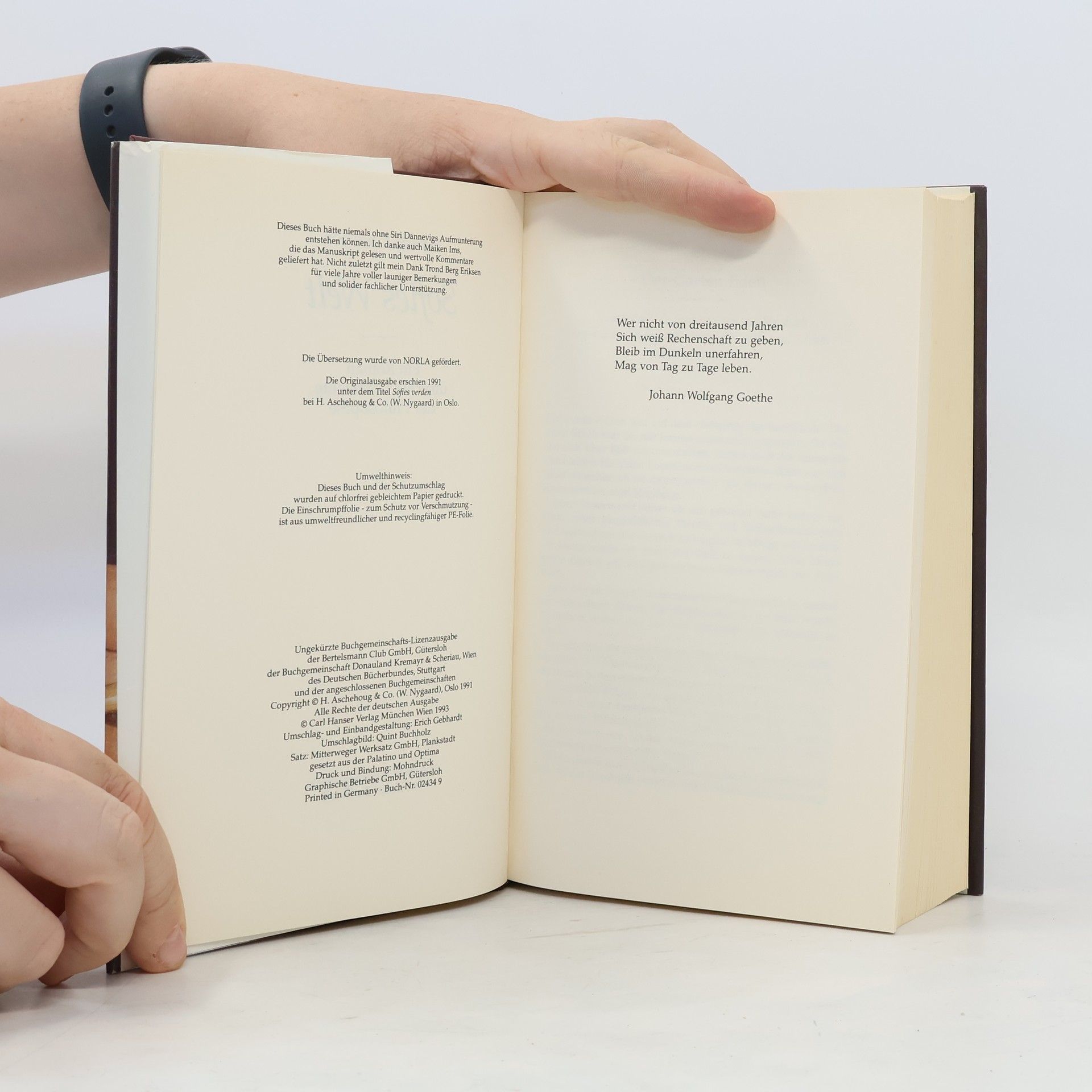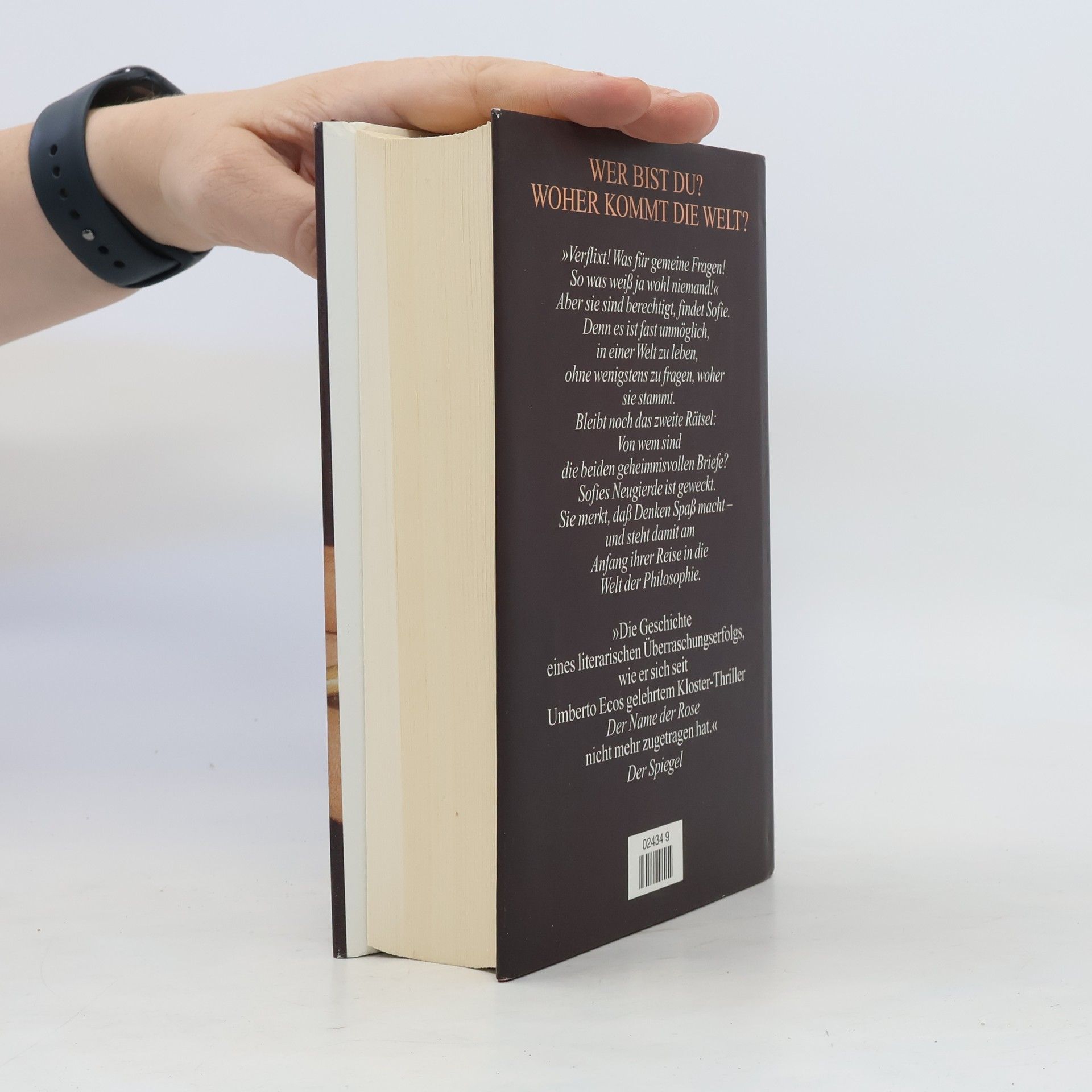 »Ein dickes Buch, mit spitzen Fingern angefaßt und mit Begeisterung zugeklappt: ein großer Wurf im wörtlichen wie übertragenen Sinn.« Die Zeit Mysteriöse Briefe landen im Briefkasten der 15jährigen Sofie Amundsen in Oslo. Was sollen diese Fragen: »Wer bist du?«, »Was ist ein Mensch?« und »Woher kommt die Welt?«. Sofie ist irritiert. Die Briefe werden ausführlicher und entführen sie in die abenteuerliche und geheimnisvolle Gedankenwelt der großen Philosophen. Ihr unbekannter Briefeschreiber erzählt Sofie die Geschichte Europas, der Antike, des Mittelalters und der Renaissance und dann nimmt die Geschichte eine unglaubliche Wendung.