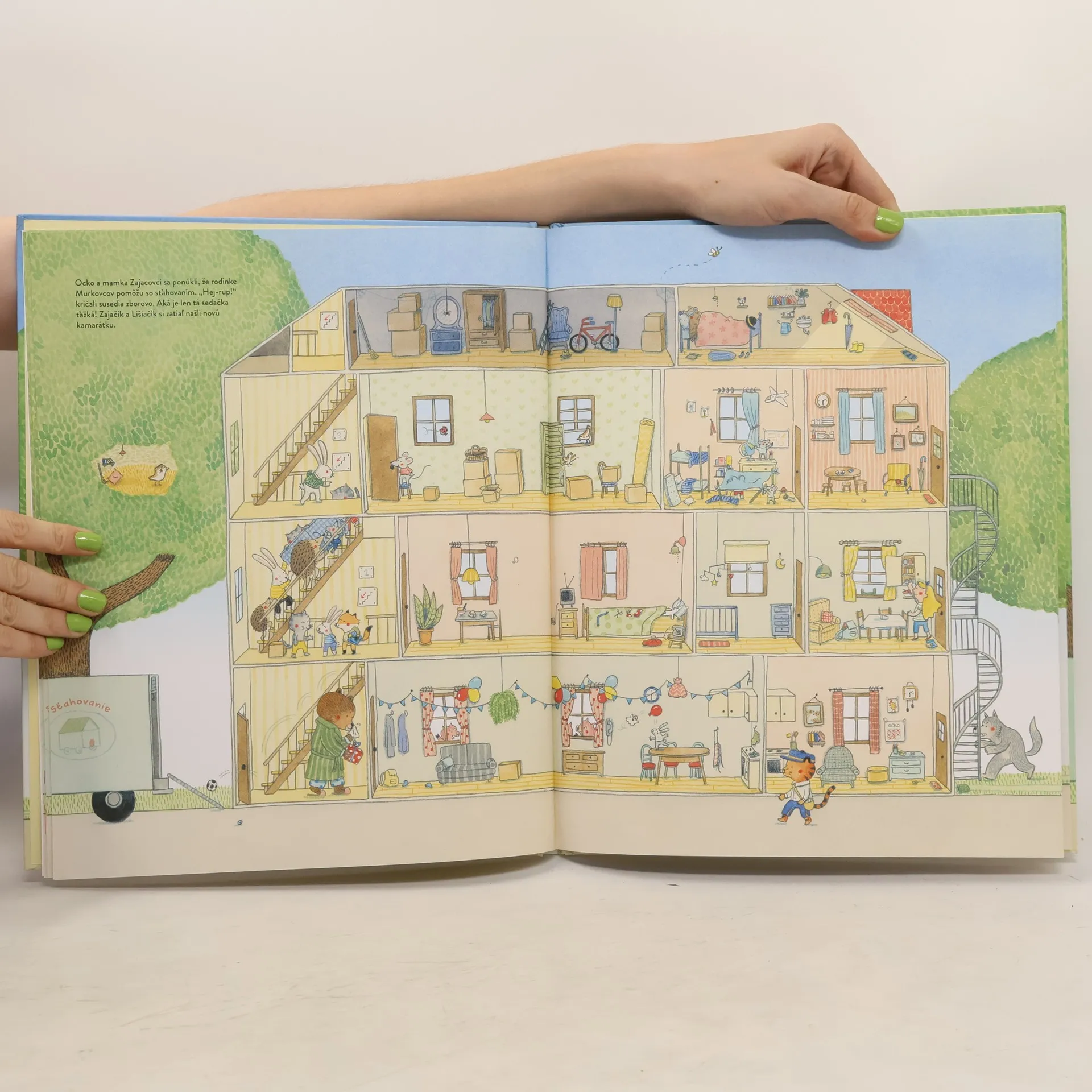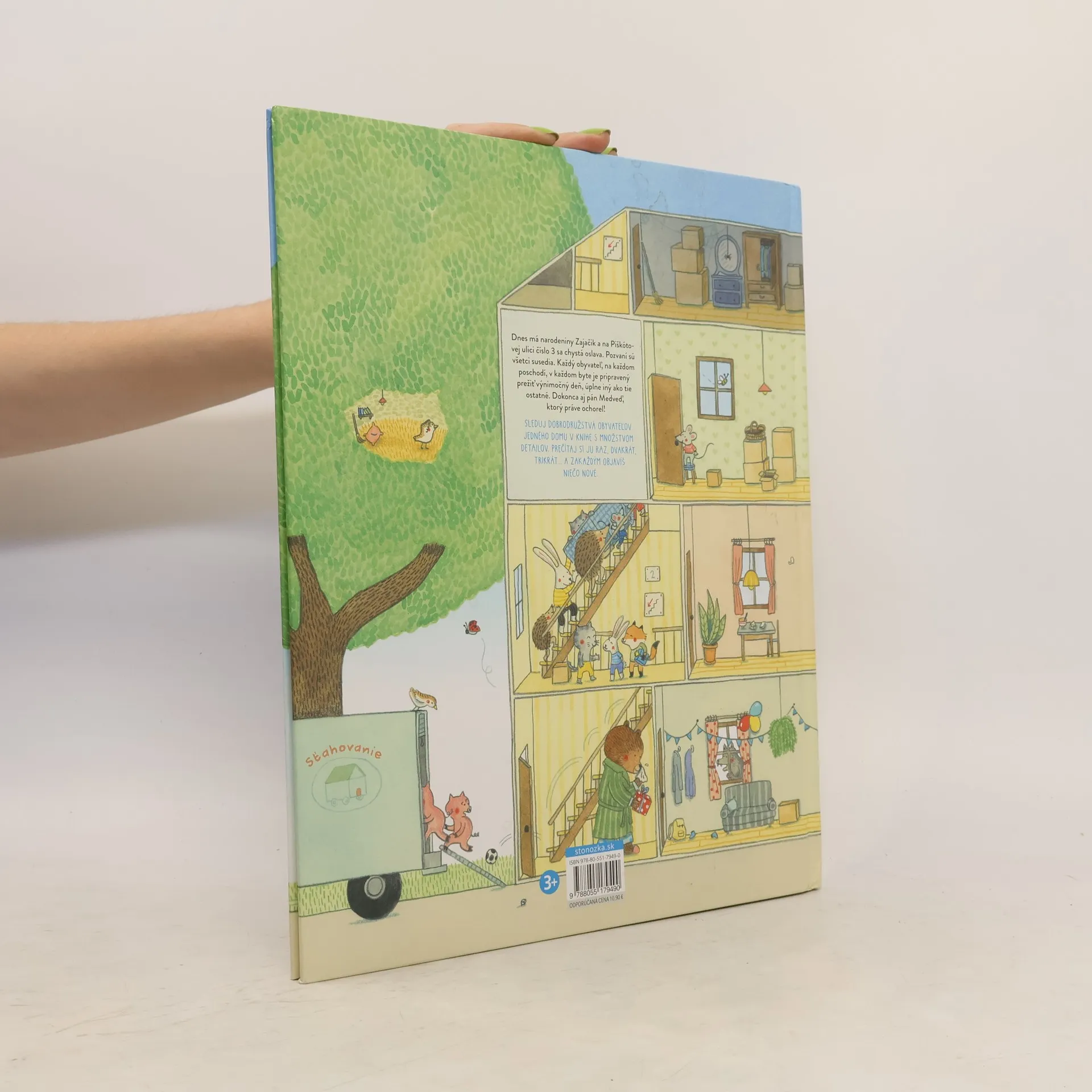 Všímaj si detaily a poskladaj z nich krásny príbeh o zvieratkách. Dnes má narodeniny Zajačik a na Piškótovej ulici číslo 3 sa chystá oslava. Pozvaní sú všetci susedia. Každý obyvateľ, na každom poschodí, v každom byte je pripravený prežiť výnimočný deň, úplne iný ako tie ostatné. Dokonca aj pán Medveď, ktorý práve ochorel! Sleduj dobrodružstvá obyvateľov jedného domu v knihe s množstvom detailov. Prečítaj si ju raz, dvakrát, trikrát... a zakaždým objavíš niečo nové. Pre deti od troch rokov. Z francúzskeho originálu preložila Alica Wursterová.