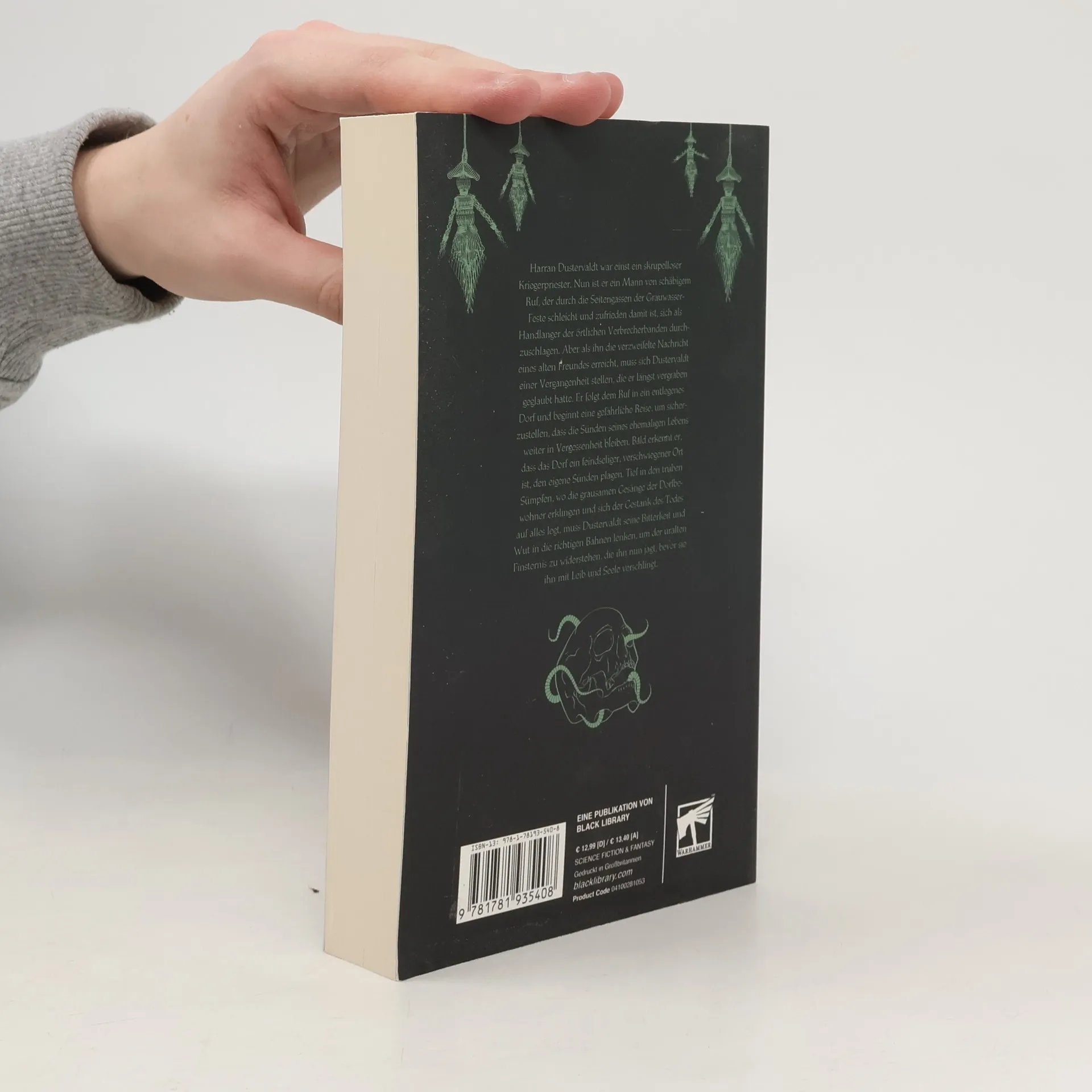 Harran Schwarzholz war einst ein skrupelloser Kriegerpriester. Nun ist er ein Mann von schäbigem Ruf, der durch die Seitengassen der Grauwasser-Feste schleicht und zufrieden damit ist, sich als Halsabschneider durchzuschlagen. Aber als ihn die verzweifelte Nachricht eines alten Freundes erreicht, muss sich Schwarzholz einer Vergangenheit stellen, die er längst vergraben geglaubt hatte. Er folgt dem Ruf in ein entlegenes Dorf und beginnt eine gefährliche Reise, um sicherzustellen, dass die Sünden seines ehemaligen Lebens weiter in Vergessenheit bleiben. Bald erkennt er, dass das Dorf ein feindseliger, verschwiegener Ort ist, den eigene Sünden plagen. Tief in den trüben Sümpfen, wo die grausamen Gesänge der Dorfbewohner erklingen und sich der Gestank des Todes auf alles legt, muss Schwarzholz seine Bitterkeit und Wut in die richtigen Bahnen lenken, um der uralten Finsternis zu widerstehen, die ihn nun jagt, bevor sie ihn mit Leib und Seele verschlingt.