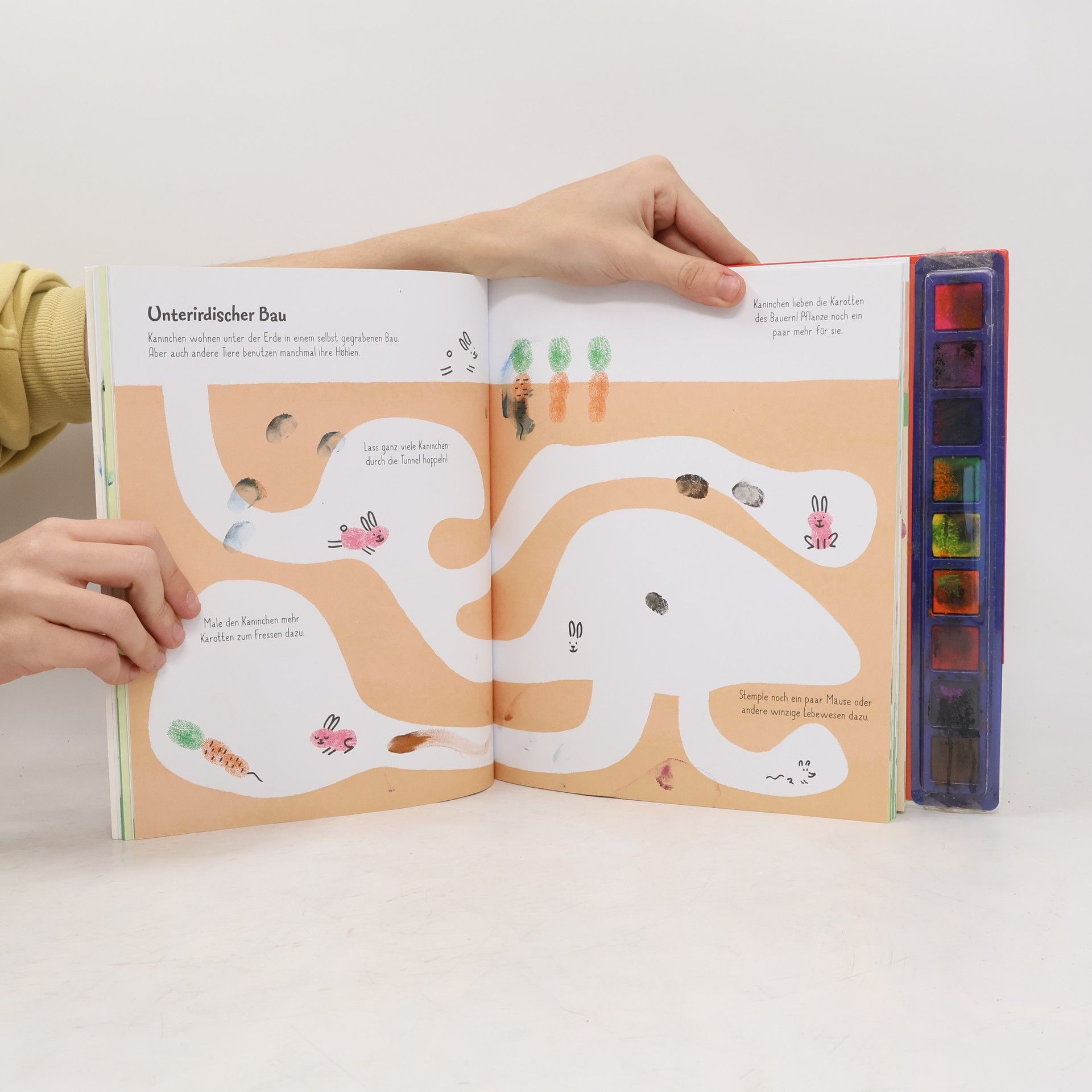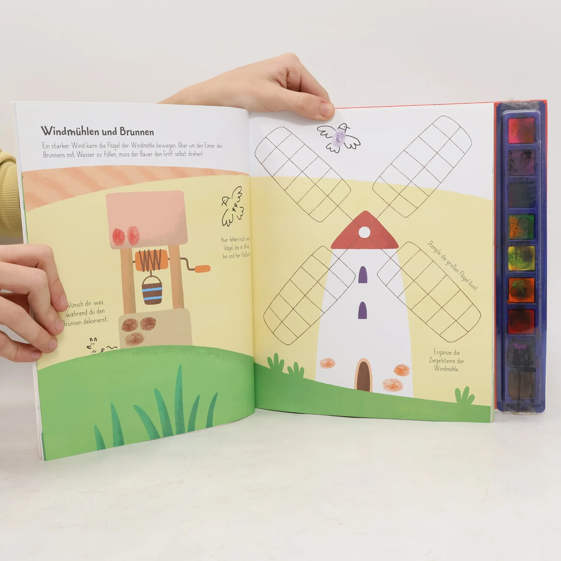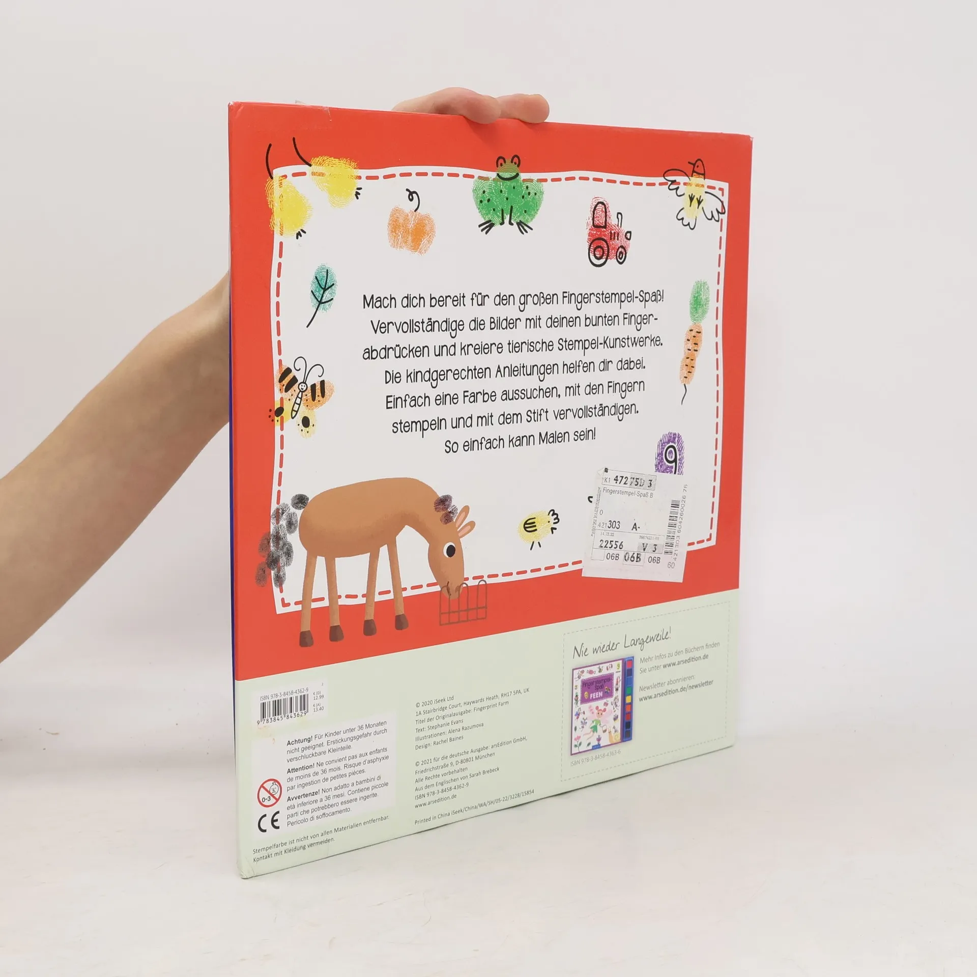 Fingerstempel-Kunstwerke Viele bunte Szenen in diesem Stempelbuch ab 4 warten darauf, mit Fingerabdrücken zum Leben erweckt zu werden. Kuh, Huhn, Schaf, Gemüse, Heu – all das geht ganz leicht. Die kindgerechten Anleitungen helfen dabei. Einfach eine Farbe der Stempelkissen aussuchen, mit den Fingern stempeln und mithilfe eines Stifts vervollständigen. So einfach kann Malen sein! Dicker Stempelspaß: 80 Seiten warten darauf, bunt bestempelt zu werden Für kreative Kinder: Auf jeder Seite gibt es bunte Szenen, Anleitungen, Ideen und Infos zu entdecken Mit Stempelkissen in 9 Farben: Mit dabei sind Stempelkissen in allen Lieblingsfarben, sodass kleine Künstler jederzeit loslegen können Leicht abwaschbare Fingerfarbe: Die bunte Tinte ist ganz leicht mit Wasser aus- und abwaschbar - so sind Flecken ruckzuck weg Perfekt als Geschenk: Ein super Mitbringsel, für den Kindergeburtstag oder einfach zwischendurch für Kinder ab 4 Jahren Malspaß ohne Pinsel Fingermalspaß ohne Kleckerei: Die deckenden Fingerfarben sind in Stempelkissen verpackt und immer einsatzbereit. Die Anleitungen und Anregungen helfen dabei, aus Fingerabdrücken alle möglichen Tiere und vieles mehr zu zaubern.