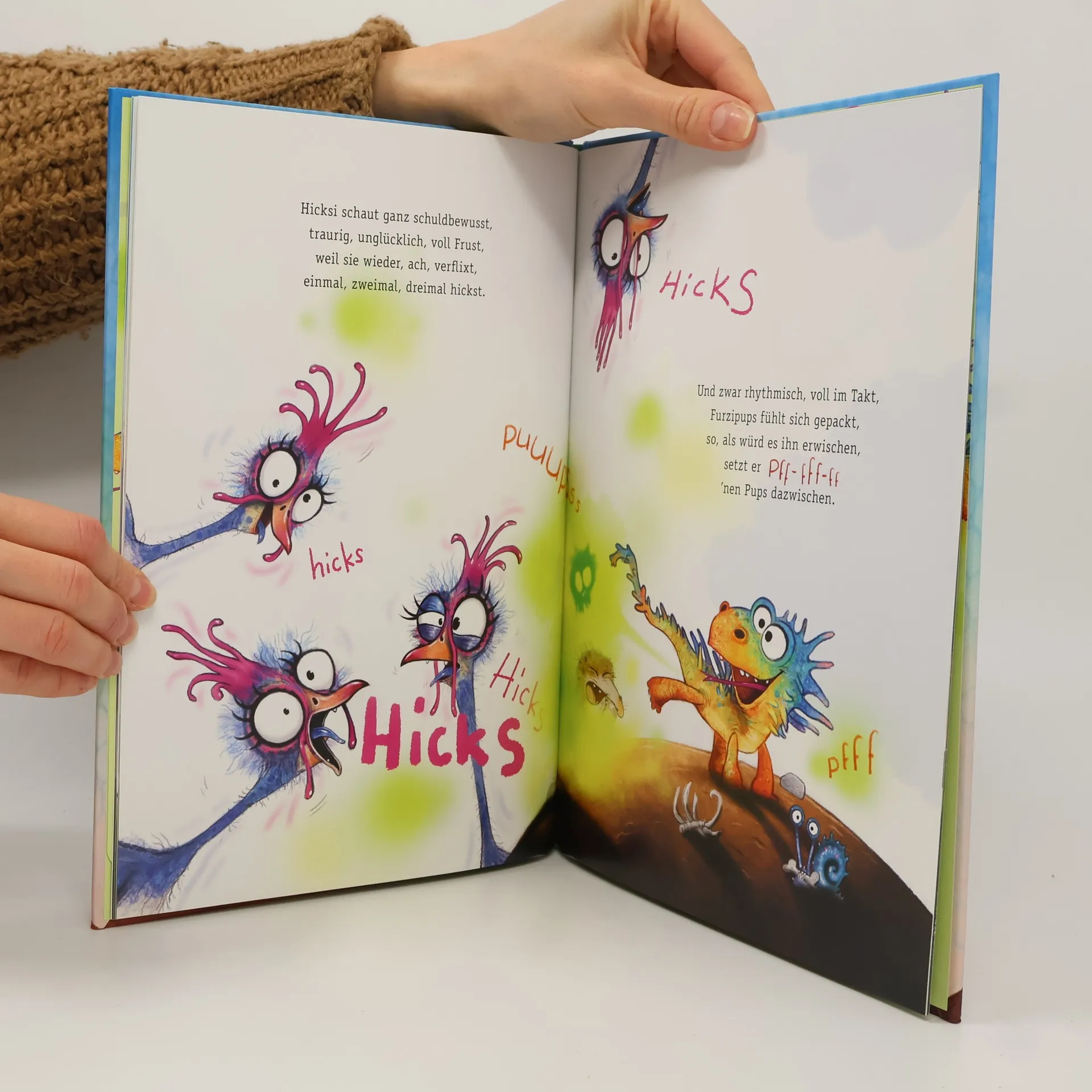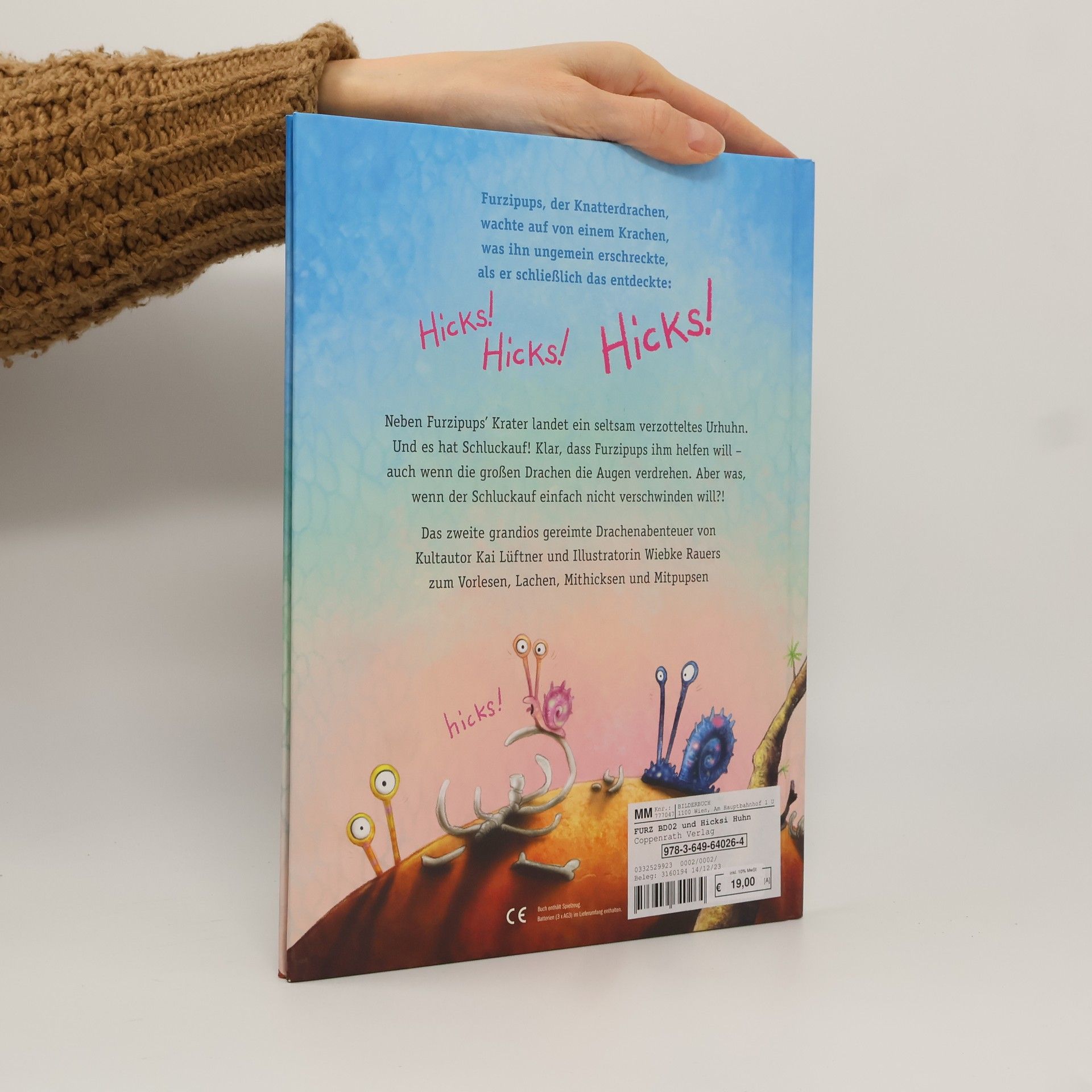 Mit den lustig gereimten Urzeit-Geschichten rund um Furzipups, den kleinen Knatterdrachen, werden nicht ganz salonfähige Geräusche zum absoluten Spaßfaktor für Klein und Groß! Furzipups möchte gerne mit den großen Drachen mithalten und furchterregend Feuer spucken. Doch statt Feuer kriegt er nur eines zuverlässig hin: gewaltig donnernde Pupse! Im zweiten Band der Kinderbuchreihe ab 3 Jahren kommt es zu einer interessanten Begegnung: "Furzipups, der Knatterdrachen, wachte auf von einem Krachen, was ihn ungemein erschreckte, als er schließlich das entdeckte… Hicks! Hick-HICKS!“ …Neben Furzipups’ Krater landet nämlich eines Morgens ein seltsam verzotteltes Urhuhn. Und es hat…Schluckauf! Klar, dass Furzipups helfen will – auch wenn die großen Drachen die Augen verdrehen. Aber was, wenn der Schluckauf einfach nicht verschwinden will?! Auch beim zweiten grandios gereimten Drachen-Abenteuer von Kultautor und Songwriter Kai Lüftner mit urkomischen Zeichnungen von Wiebke Rauers darf laut gelacht, lustig gepupst und fröhlich mitgehickst werden! Ein Hicks-Button auf dem Cover macht den Geräusche-Spaß perfekt. Ein besonderes Vorlesebuch zu wichtigen Themen, die Kinder bewegen: Freundschaft Hilfsbereitschaft Anderssein Viel Spaß beim Lesen und Gemeinsam-Freuen!