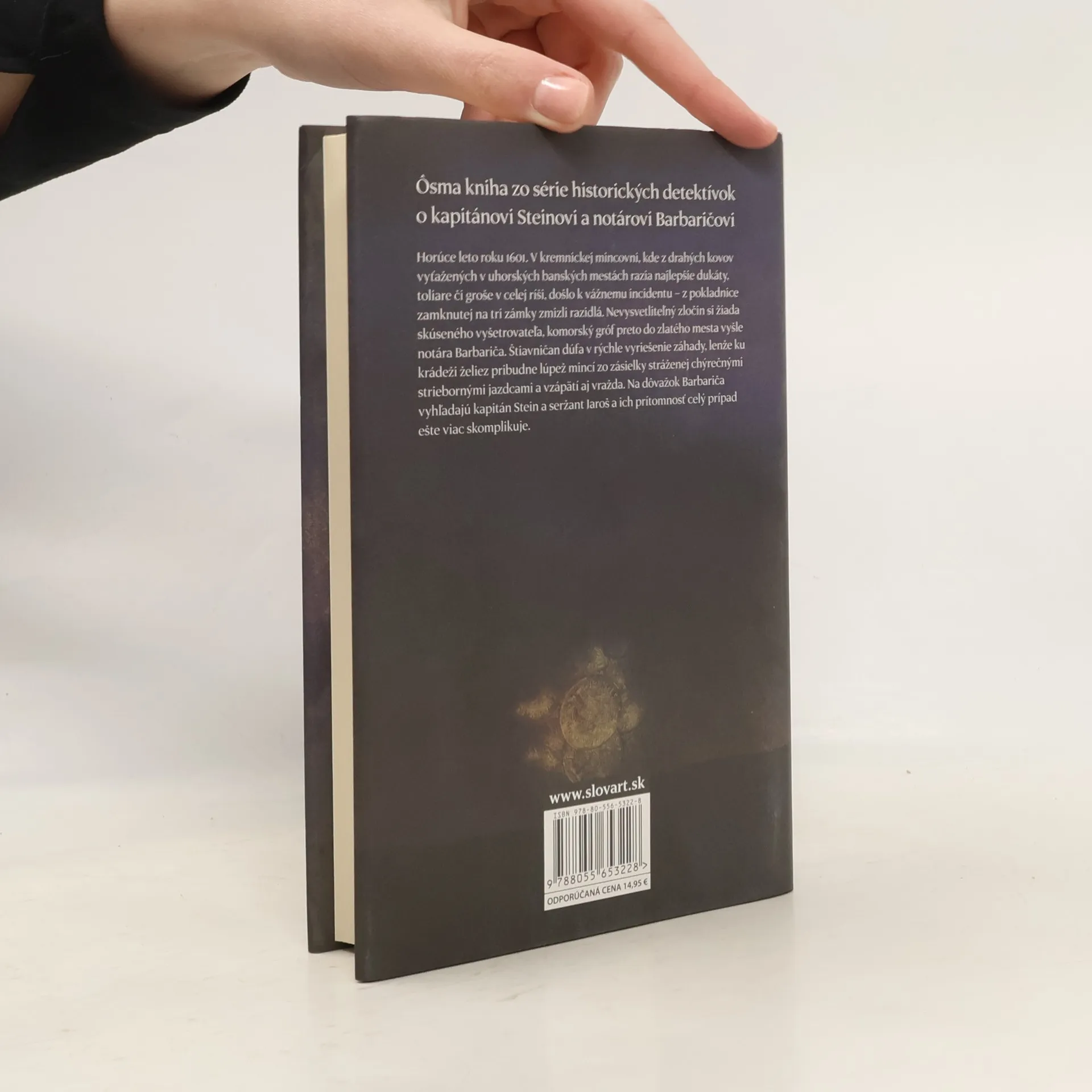 Ôsma kniha z cyklu historických detektívok o kapitánovi Steinovi a notárovi Barbaričovi. Horúce leto roku 1601. V kremnickej mincovni, kde z drahých kovov vyťažených v uhorských banských mestách razia najlepšie dukáty, toliare či groše v celej ríši, došlo k vážnemu incidentu - z pokladnice zamknutej na tri zámky zmizli razidlá. Nevysvetliteľný zločin si žiada skúseného vyšetrovateľa, komorský gróf preto do zlatého mesta vyšle notára Barbariča. Štiavničan dúfa v rýchle vyriešenie záhady, lenže ku krádeži želiez pribudne lúpež mincí zo zásielky stráženej chýrnymi striebornými jazdcami a vzápätí aj prvá vražda. Na dôvažok Barbariča vyhľadajú kapitán Stein a seržant Jaroš a ich prítomnosť celý prípad ešte viac skomplikuje.