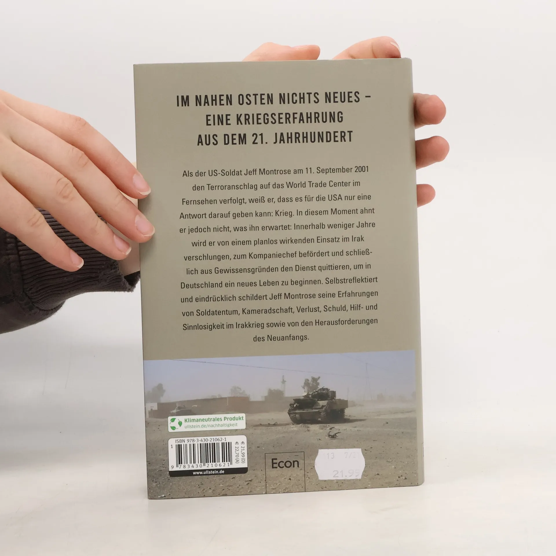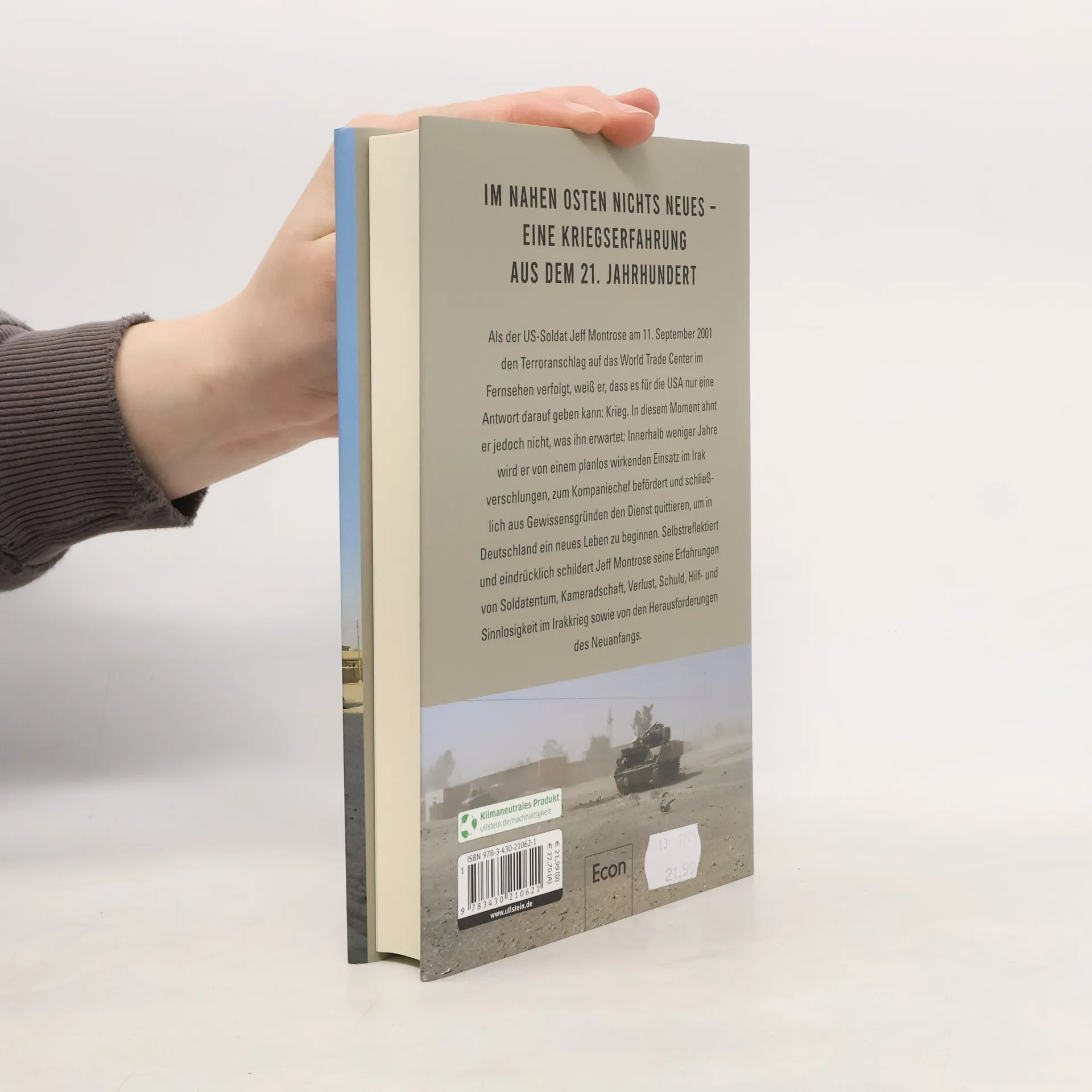 Als der US-Soldat Jeff Montrose am 11. September 2001 den Terroranschlag auf das World Trade Center im Fernsehen verfolgt, weiß er, dass es für die USA nur eine Antwort darauf geben kann: Krieg. In diesem Moment ahnt er noch nicht, was ihn erwartet: dass er innerhalb weniger Jahre von einem planlos wirkenden Einsatz verschlungen, zum Kompaniechef befördert, letztendlich aus Gewissensgründen die Army verlassen und schließlich in Deutschland ein neues Leben beginnen wird. Jeff Montrose beschreibt sehr bewegend und reflektiert seine Erfahrungen als Kampfsoldat im Irak. Er erzählt von seiner Hilflosigkeit gegenüber einem meist unsichtbaren Feind, der unabänderlichen Verrohung der Soldaten, seinen getöteten Kameraden, seinen Albträumen und seinem schweren Weg zurück in die Zivilgesellschaft. Ein schonungsloser Einblick in das Leben als Kampfsoldat und zugleich ein fundiertes Hinterfragen von Sinn und Zweck militärischer Auslandseinsätze.