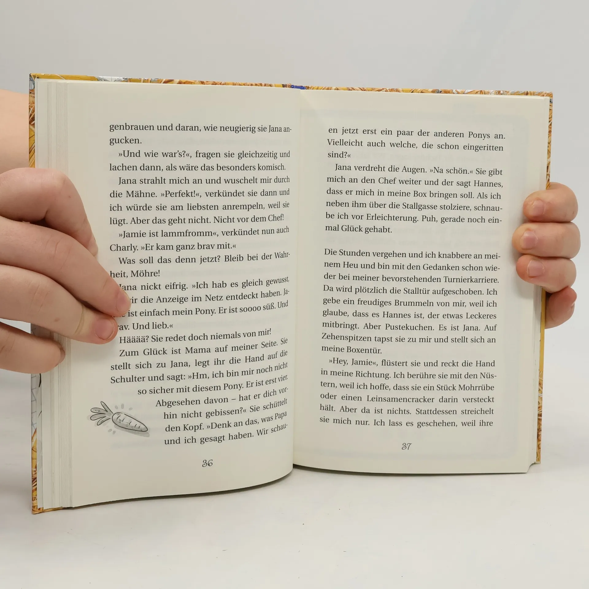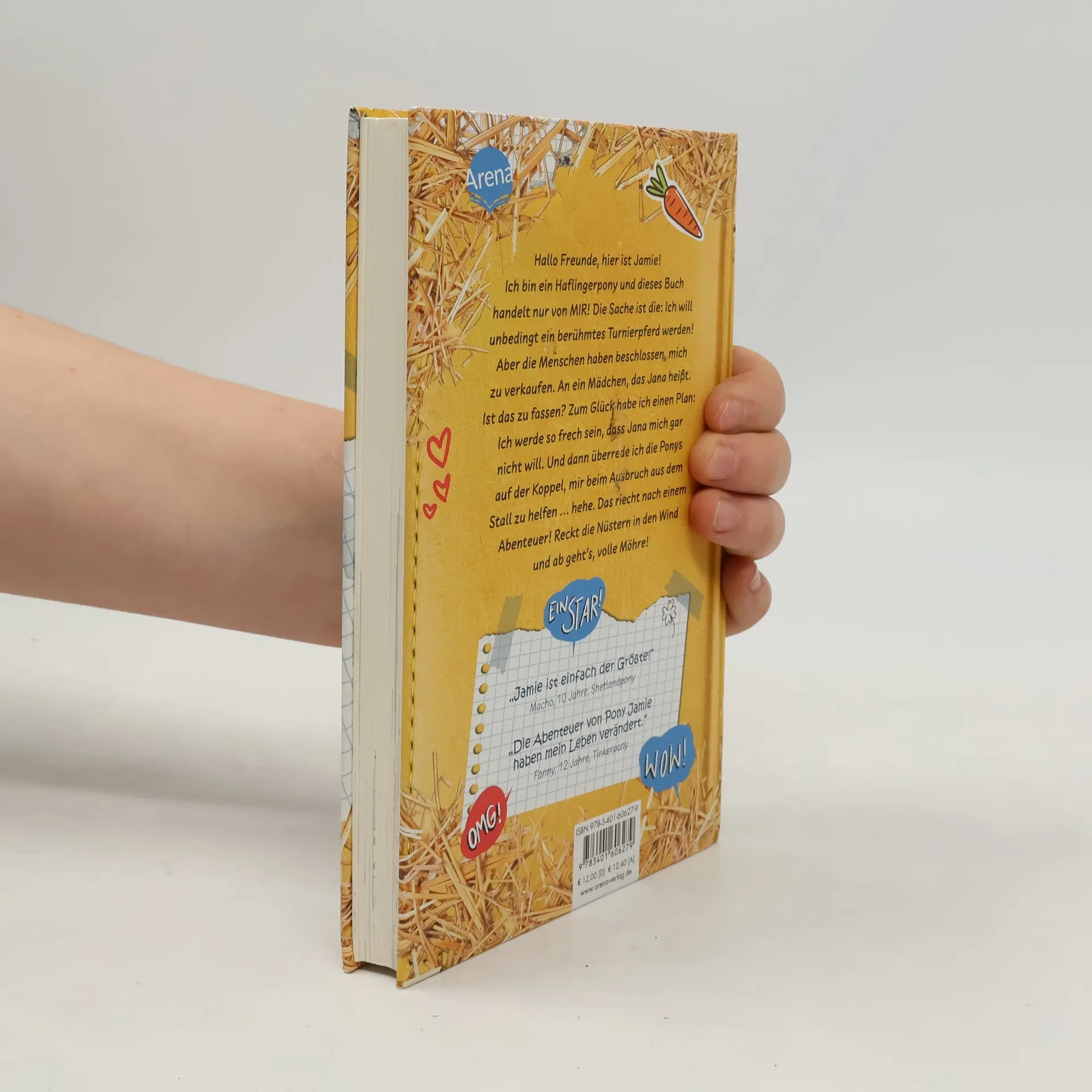 Hier kommt Pony Jamie - Held, Menschenflüsterer und der König der Pferdekoppel! Hallo Möhrenfreunde! Mein Name ist Jamie und ich bin ein berühmtes Dressurpferd. Also, zumindest bald, wenn die Menschen endlich erkennen, welches Talent in mir schlummert. In der Zwischenzeit muss ich noch das kleine Missverständnis klären, dass ich "aussortiert“ wurde, weil ich "zu groß“ sei. Statt in die Sportmannschaft des Gestüts aufgenommen zu werden, soll ich nämlich verkauft werden. Aber nicht mit mir! Auf mich warten große Aufgaben, Leute. Und daran kann mich auch nicht dieses seltsame Mädchen hindern. Jana glaubt nämlich, ein Pferdeflüsterer zu sein. Aber sie weiß ja gar nicht, mit wem sie es zu tun hat. Denn ich - ich bin der größte Menschenflüsterer aller Zeiten!
