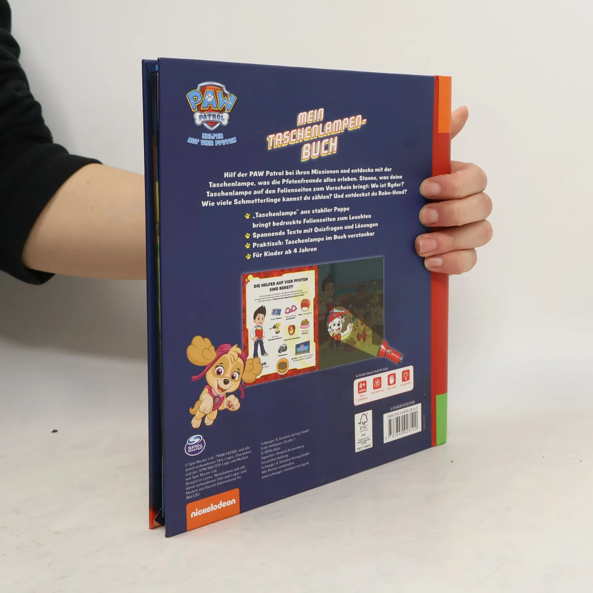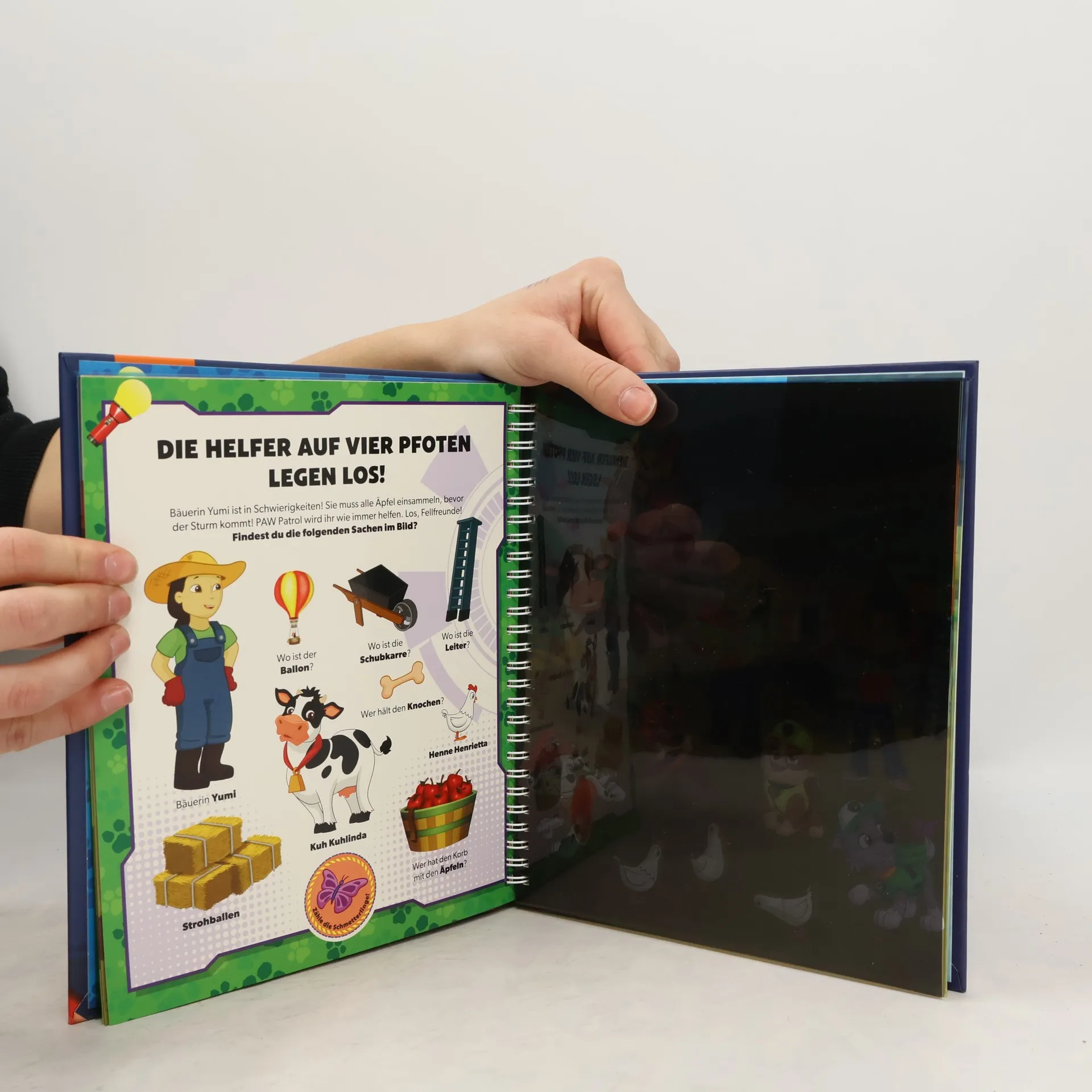 Mit PAW Patrol bunte Folienseiten zum Leuchten bringen und ihre Einsätze miterleben! Ein Muss für alle PAW Patrol-Fans Mitmachbuch zur beliebten Fernsehserie PAW Patrol Mit der stabilen Papp-Taschenlampe die Einsätze der PAW Patrol entdecken Bäuerin Yumi braucht Hilfe auf dem Bauernhof! Und was ist am Strand passiert? Die PAW Patrol ist bereit für ihre nächsten Pfotenmissionen! Begleite Chase und die Fellfreunde auf ihren Abenteuern und entdecke Ryder, Robo-Hund oder das Feuerwehrfahrzeug auf den bunten Folienseiten. Auf jeder Seite sind kleine Texte und viele Suchaufgaben. So macht das Entdecken auf den Folienseiten mit der Taschenlampe aus Pappe noch mehr Spaß! Wo ist der Gänseschwarm? Wie viele Schmetterlinge sind im Bild? Und was hat Everest gefunden? Ein spannendes Quiz am Ende testet das Wissen über die PAW Patrol. Auf den detailreichen, bunten Mitmachseiten gibt es für Kinder ab 4 Jahren viel zu entdecken, das fördert die Wahrnehmung, Feinmotorik und Konzentration! Die stabile Taschenlampe ist ganz einfach für ihren nächsten Einsatz mit der PAW Patrol im Buch verstaubar.