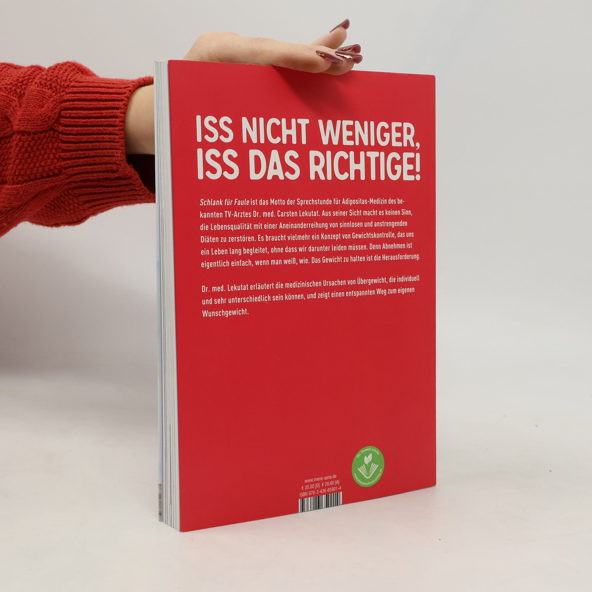 Dauerhaft schlank sein ist möglich – medizinisch erprobt und ohne große Anstrengung „Iss nicht weniger, iss das Richtige“ ist das Motto der Sprechstunde für Adipositas-Medizin des bekannten TV-Arztes Dr. med. Carsten Lekutat.Aus seiner Sicht macht es keinen Sinn, die Lebensqualität mit einer Aneinanderreihung von sinnlosen und anstrengenden Diäten zu zerstören. Es braucht viel mehr ein Konzept von Gewichtskontrolle, das uns lebenslang begleitet, ohne dass wir darunter leiden müssen. Denn Abnehmen ist eigentlich einfach, wenn man weiß, wie es geht. Das Gewicht zu halten ist die Herausforderung.Dr. med. Lekutat erläutert die medizinischen Ursachen von Übergewicht, die individuell und sehr unterschiedlich sein können. Neben Hormonen, Stoffwechsel, Bewegungsmangel, Psyche und Schlaf spielt natürlich auch die Ernährung eine entscheidende Rolle. Nach der Diagnostik zeigt er ganz konkret, wie Abnehmen mit schlauer Gewichtskontrolle dauerhaft gelingt. "Ich weiß, wie Sie sich fühlen: Ich hatte auch einige Kilos zu viel auf der Waage. Ganze 23 Kilogramm trennten mich von meinem Wunschgewicht! Aber ich habe sie verloren – dauerhaft. Und das ohne Diäten und ohne Qualen. Und wenn Sie jetzt glauben, das ist wieder so ein weiterer Diät-Ratgeber, dann liegen Sie falsch. Denn Diäten sind das Falscheste, was Sie machen können, wenn Sie Gewicht verlieren und danach dauerhaft schlank bleiben wollen." Dr. med. Carsten Lekutat
