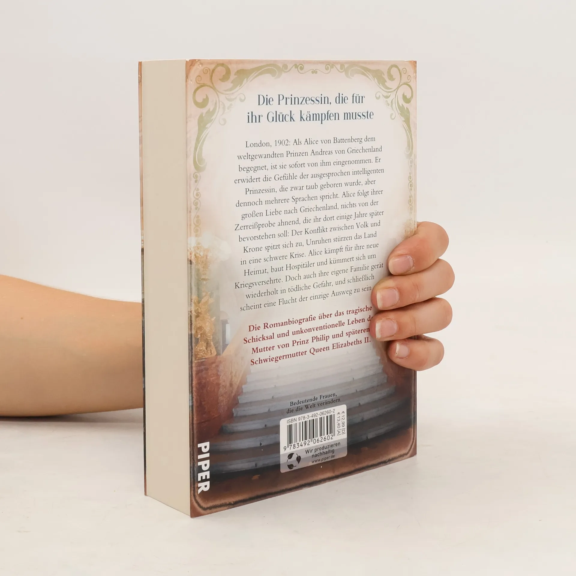 Die Prinzessin, die für ihr Glück kämpfen musste – das tragische und unkonventionelle Leben der Mutter von Prinz Philip und späteren Schwiegermutter der Queen Elizabeth. Ein privater Blick hinter die Kulissen des englischen Königshauses!London, 1902: Als Alice von Battenberg dem weltgewandten Prinzen Andreas von Griechenland begegnet, ist sie sofort von ihm eingenommen. Er erwidert die Gefühle der ausgesprochen intelligenten Prinzessin, die zwar taub geboren wurde, aber in mehreren Sprachen Lippen lesen kann. Alice folgt ihrer großen Liebe nach Griechenland, nichts von der Zerreißprobe ahnend, die ihr dort einige Jahre später bevorstehen soll: Der Konflikt zwischen Volk und Krone spitzt sich zu, Unruhen stürzen das Land in eine schwere Krise. Alice kämpft für ihre neue Heimat, baut Hospitäler und kümmert sich um Kriegsversehrte. Doch die Lage verschärft sich, ihre Familie gerät wiederholt in tödliche Gefahr, und letztendlich scheint eine Flucht der einzige Ausweg zu sein …