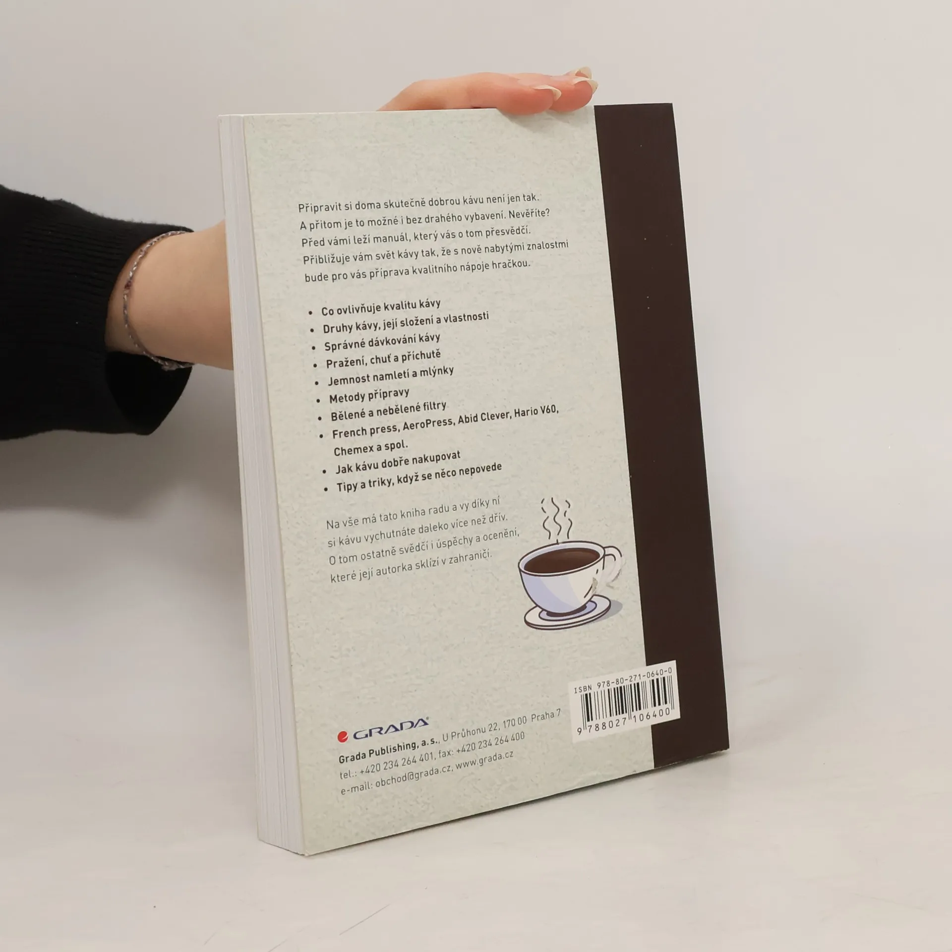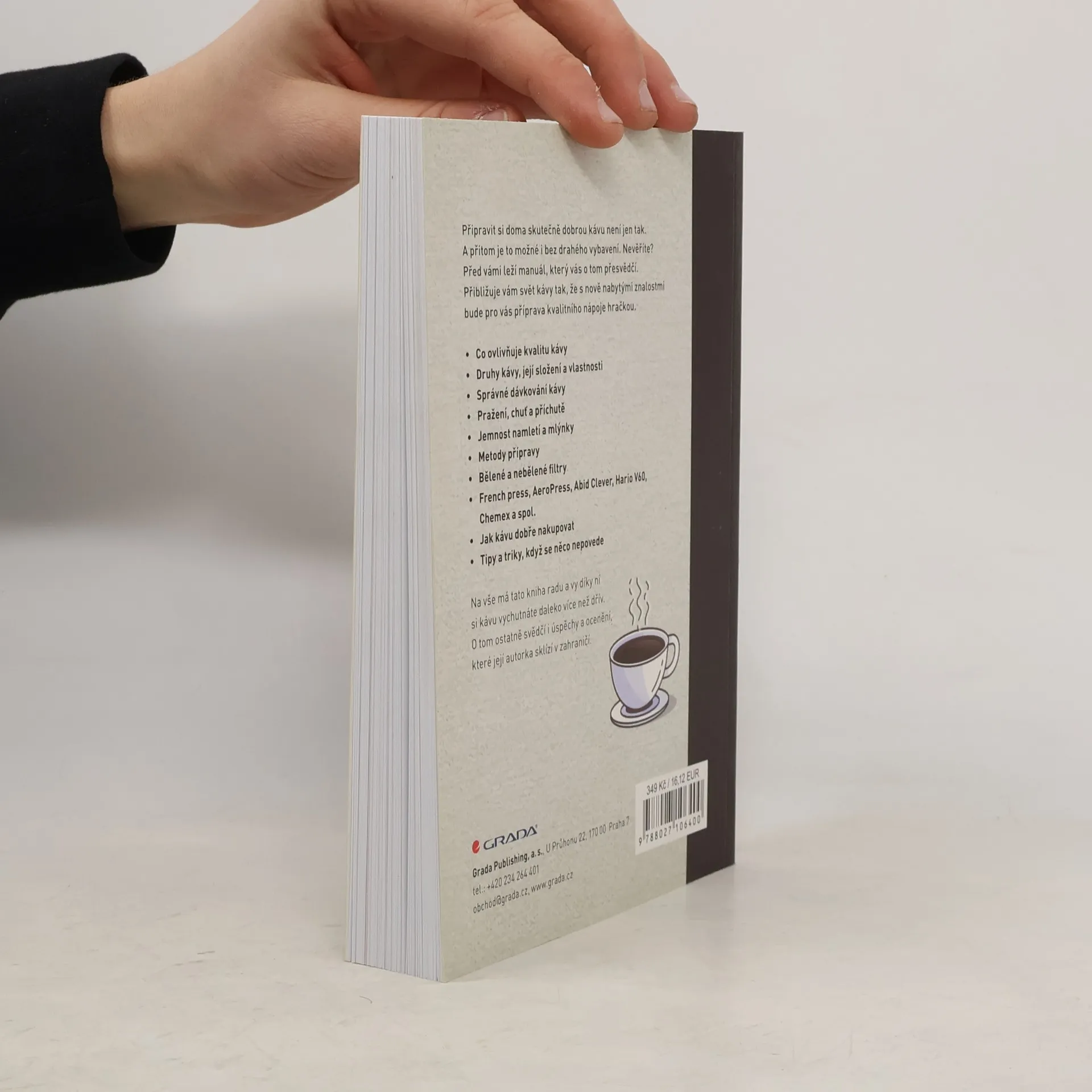 Autorka si s vysvětlováním, co všechno příprava chutné kávy obnáší, co je k tomu zapotřebí, dala neskutečnou práci a její výsledek stojí opravdu za to. O tom ostatně svědčí ohlasy a ocenění, které za knihu dostává. Dozvíte se například, co vše ovlivňuje kvalitu kávy, její sílu, hořkost, a naučíte se kávu správně kupovat, mlít, dávkovat, zalévat. Poučíte se o různých druzích kávy, které si můžete uvařit, a postupně se vyznáte v celé hitparádě nejrůznějších mlýnků, kávovarů, filtrů, konvic a dalších pomůcek, které nabízí náš trh. A nejen vyznat, vy se je naučíte i správně používat! Poznáte, jaké druhy kávy se pěstují, čím se od sebe navzájem odlišují, odkud se dovážejí. Budete umět rozlišovat jejich vlastnosti, aroma, chutě a příchutě. A na závěr se naučíte všelijaké triky, když se něco nepovede, uvařená káva je příliš slabá, nebo naopak příliš hořká, nebo se vám prostě povedlo koupit nekvalitní produkt. Na vše má tato kniha radu a vy díky ní budete mít požitek z pití kávy daleko větší než dříve.