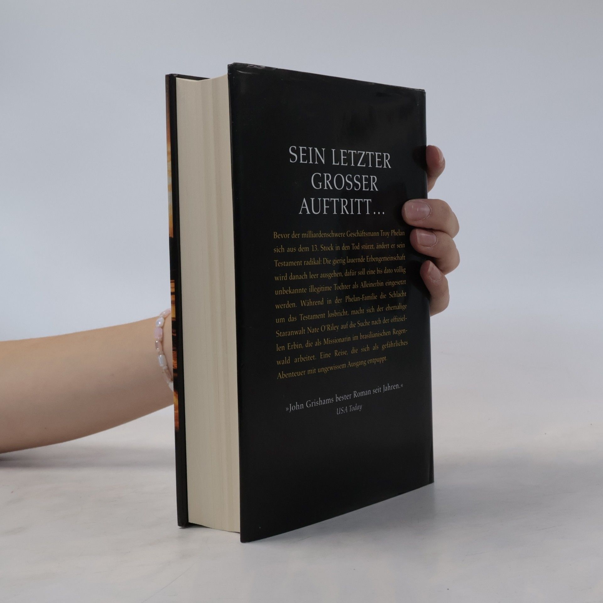 Ein milliardenschwerer, lebensmüder Geschäftsmann, eine gierig lauernde Erbengemeinschaft, die im brasilianischen Regenwald arbeitende Missionarin Rachel und ein ehemaliger Staranwalt, der es noch einmal wissen will - das sind die Akteure im Testament. Es geht um Geld, Macht und Ehre, und es geht um Leben und Tod.