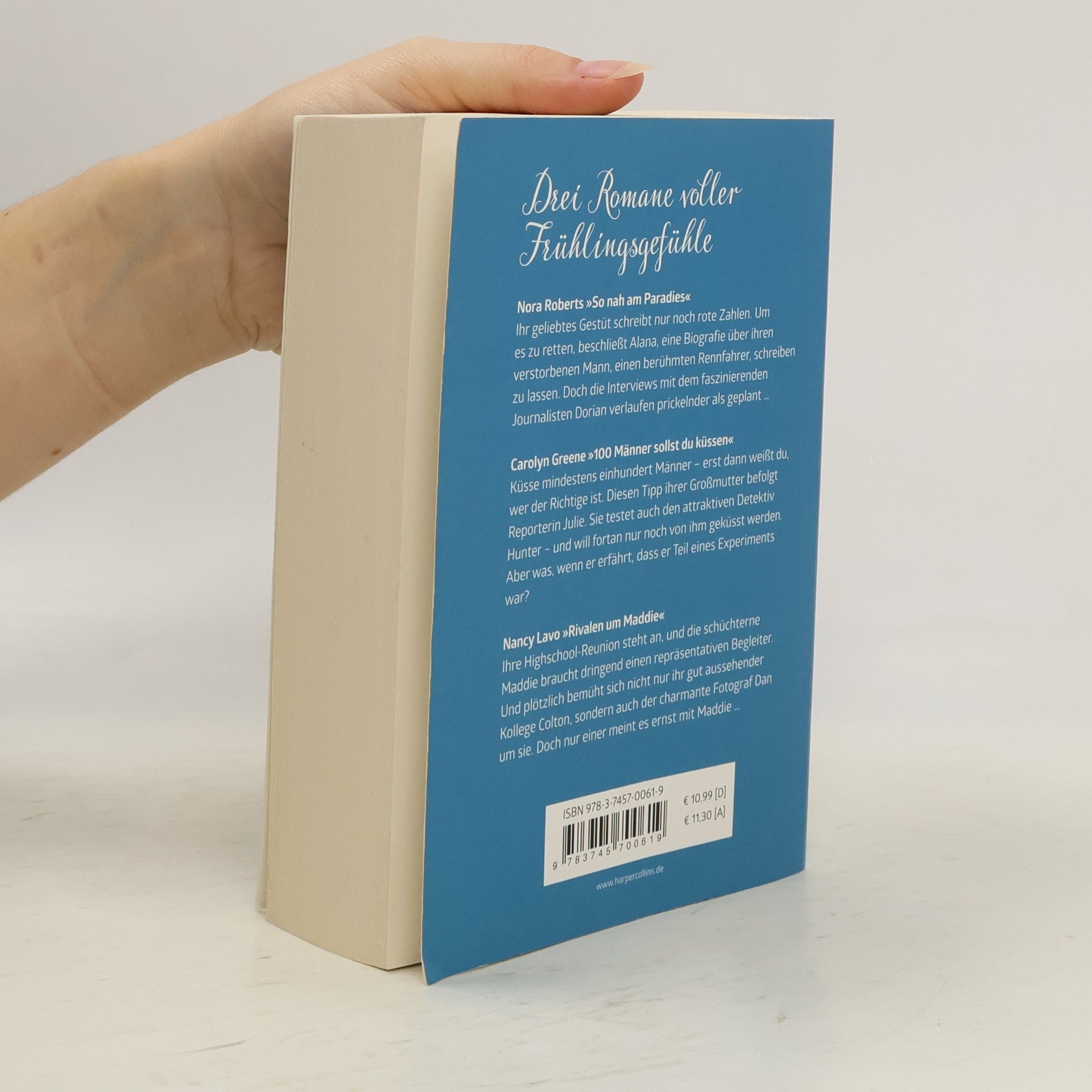 Nora Roberts - So nah am Paradies Ihr geliebtes Gestüt schreibt nur noch rote Zahlen. Um es zu retten, beschließt Alana, eine Biografie über ihren verstorbenen Mann, einen berühmten Rennfahrer, schreiben zu lassen. Doch die Interviews mit dem faszinierenden Journalisten Dorian verlaufen prickelnder als geplant … Carolyn Green - 100 Männer sollst du küssen Küsse mindestens einhundert Männer, erst dann weißt du, wer der Richtige ist. Diesen Tipp ihrer Großmutter befolgt Reporterin Julie. Sie testet auch den attraktiven Detektiv Hunter - und will fortan nur noch von ihm geküsst werden. Aber was, wenn er erfährt, dass er Teil eines Experiments war? Nancy Lavo - Rivalen um Maddie Ihre Highschool-Reunion steht an, und die schüchterne Maddie braucht dringend einen repräsentativen Begleiter. Und plötzlich bemüht sich nicht nur ihr gutaussehender Kollege Colton, sondern auch der charmante Fotograf Dan um sie. Doch nur einer meint es ernst mit Maddie …
