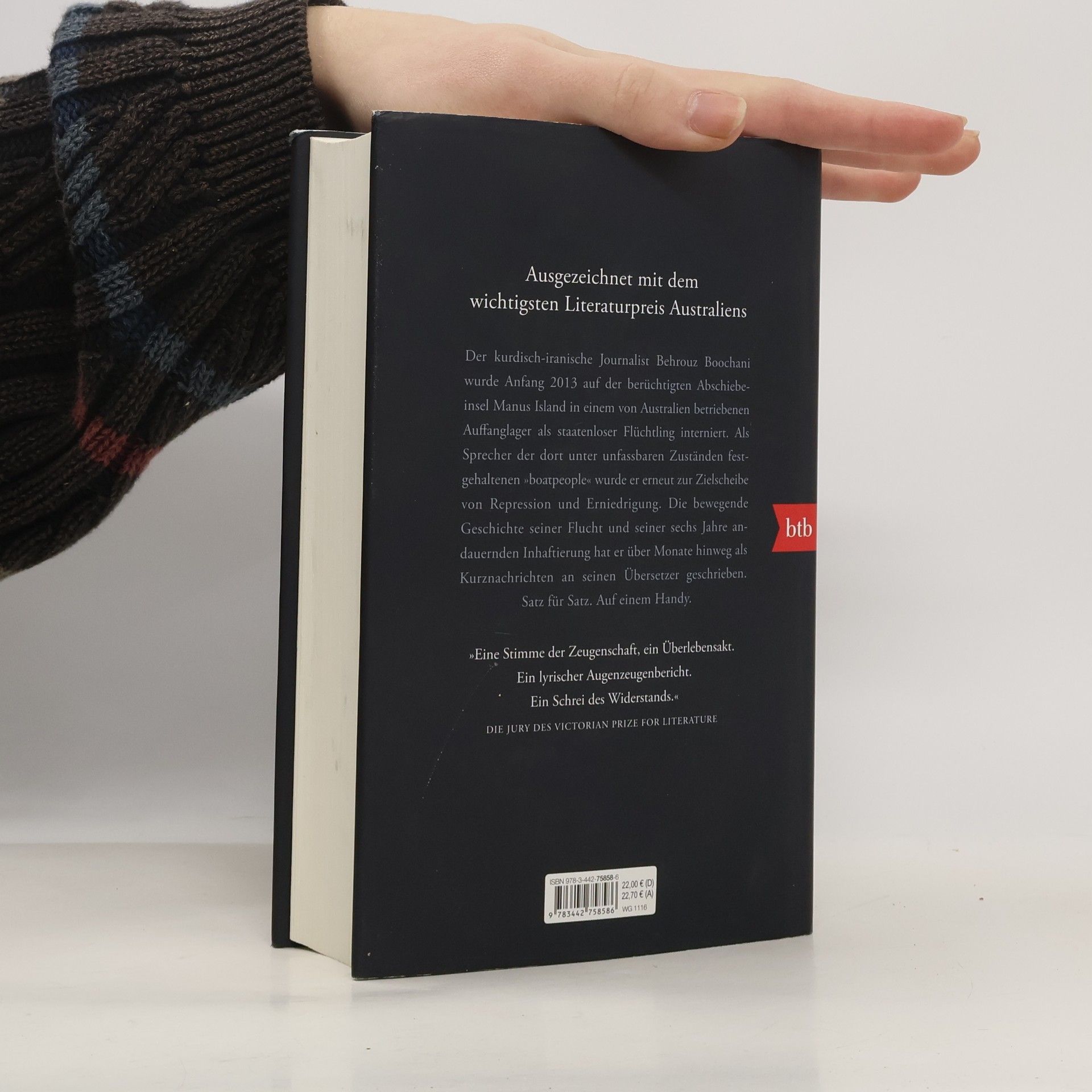 »Die zornige Stimme der Internierten« – Süddeutsche Zeitung Der kurdisch-iranische Journalist Behrouz Boochani wurde Anfang 2013 auf der berüchtigten Abschiebeinsel Manus Island in einem von Australien betriebenen Auffanglager als staatenloser Flüchtling interniert. Bald wurde er als Sprecher der unter unfassbaren Zuständen festgehaltenen »Boatpeople« erneut zur Zielscheibe von Repression und Erniedrigung. Die bewegende Geschichte seiner Flucht und seiner über sechs Jahre andauernden Inhaftierung hat er über Monate hinweg als Kurznachrichtengewitter an seinen Übersetzer geschrieben. Satz für Satz. Auf einem Handy. »Woher bin ich gekommen? Aus dem Land der Flüsse, dem Land der Wasserfälle, dem Land der uralten Gesänge, dem Land der Berge [...]. Die Leute rannten in die Berge, um den Kriegsflugzeugen zu entkommen, und sie fanden Asyl in ihren Walnusswäldern [...]. Haben Kurden noch irgendwelche anderen Freunde, außer den Bergen?«