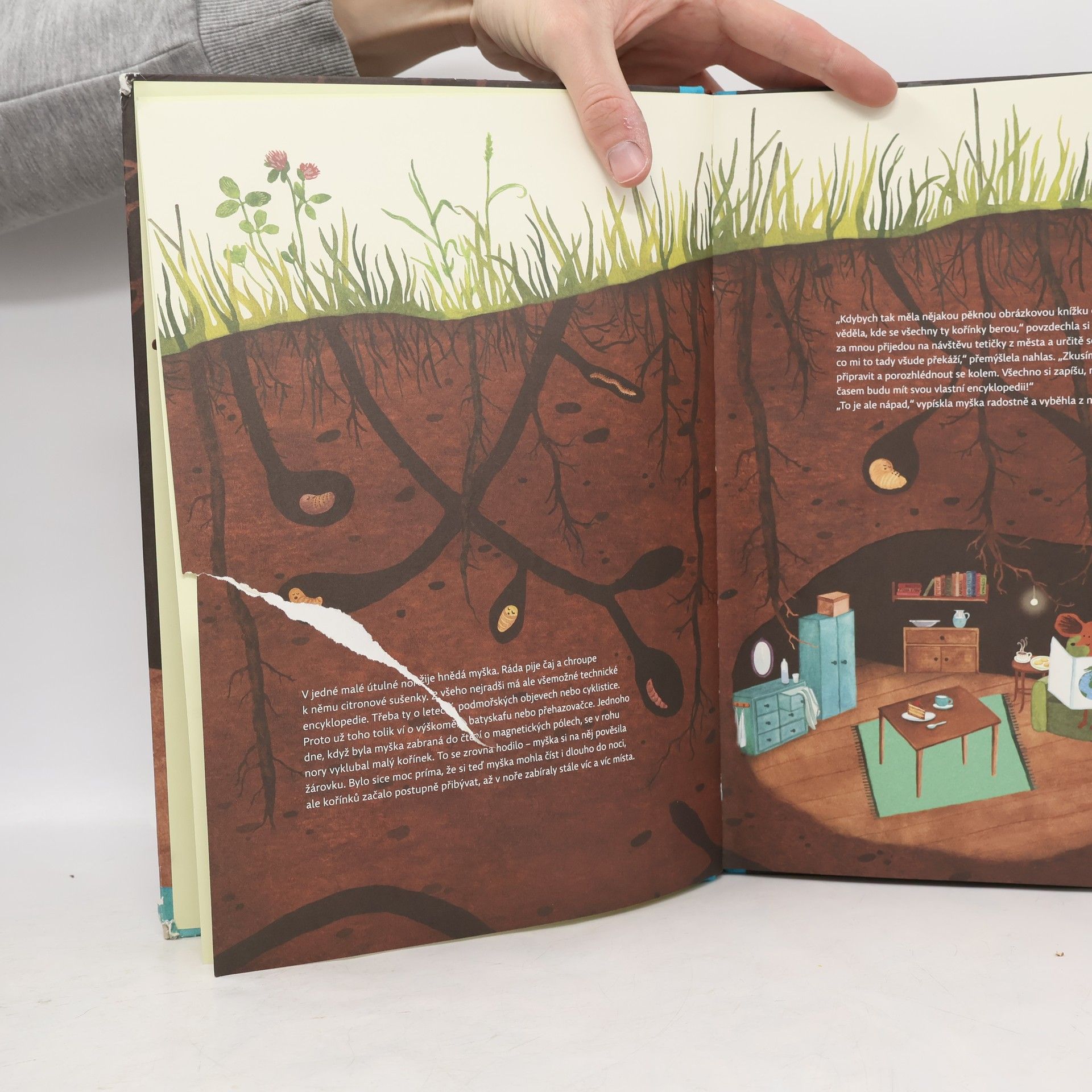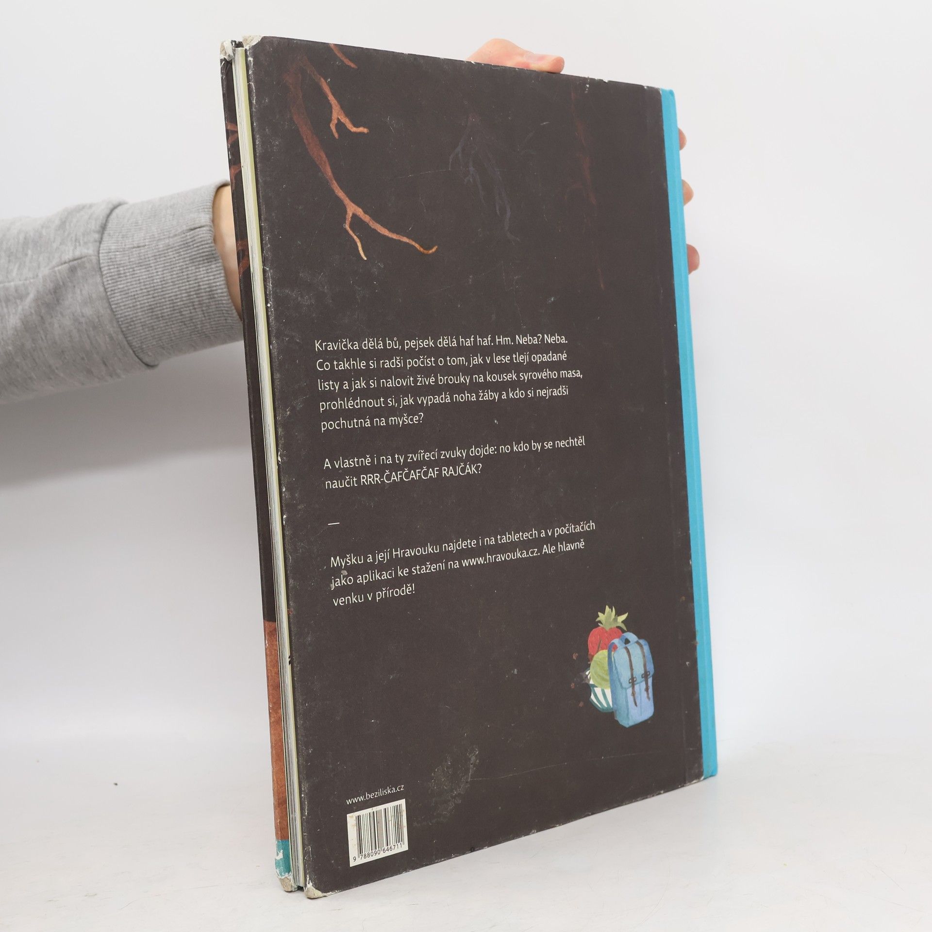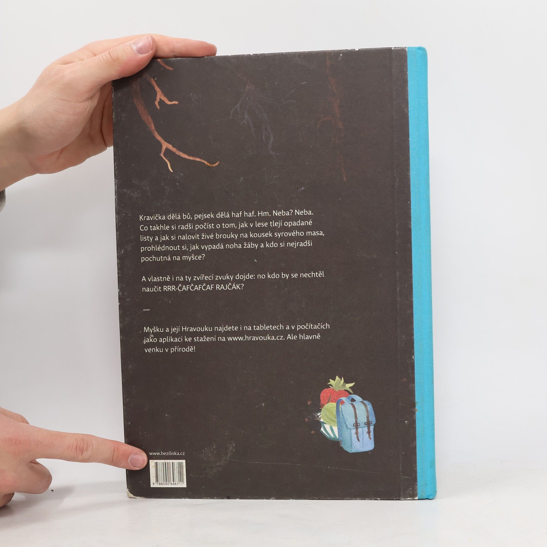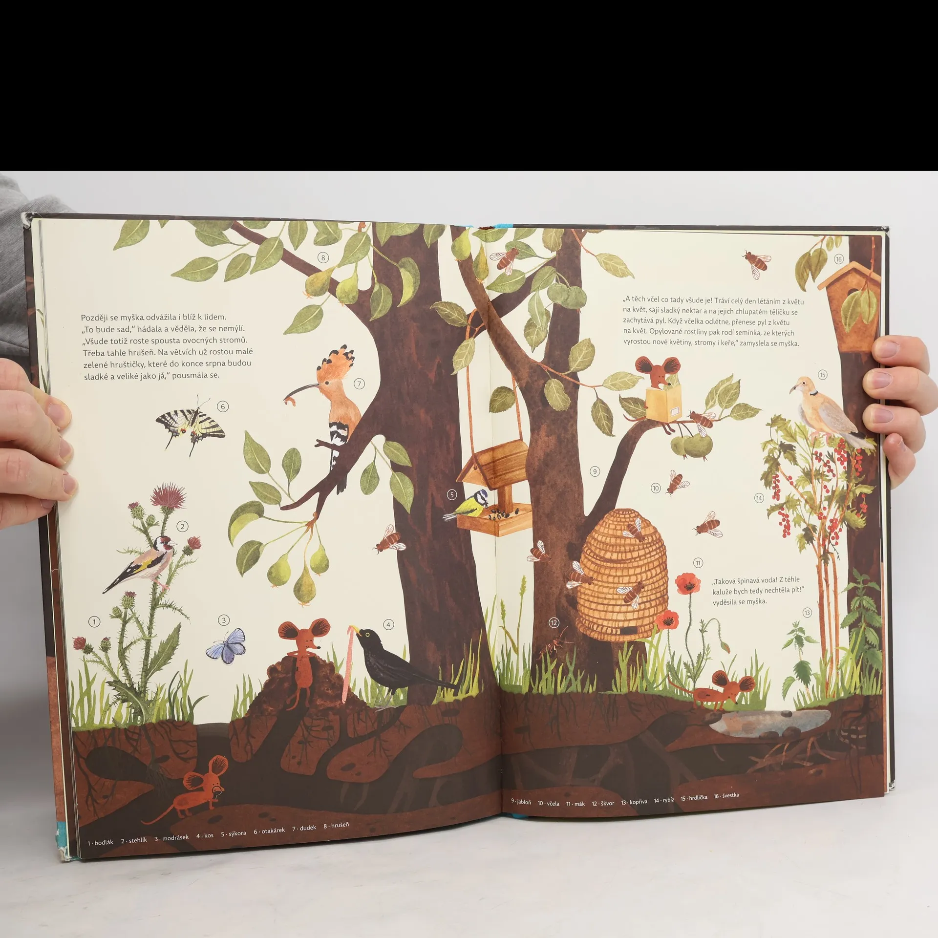 Kravička dělá bů, pejsek dělá haf haf. Hm. Neba? Neba. Co takhle si radši počíst o tom, jak v lese tlejí opadané listy, prohlédnout si, jak vypadá noha žáby a kdo si nejradši pochutná na myšce? Právě myška žijící v podzemní noře je vypravěčkou, průzkumnicí lesa, sadu i rybníčka: obkresluje tvary pecek, ohryzává mrkve v zemi a přemýšlí jak rozdělit plody na ovoce a zeleninu, zkoumá stáří lesa podle letokruhů a loví živé brouky na kousek syrového masa. Všechno pak pečlivě zapisuje do svého sešitu a radí, jak si vyrobit herbář nebo udělat zahradní jezírko. První vydání.