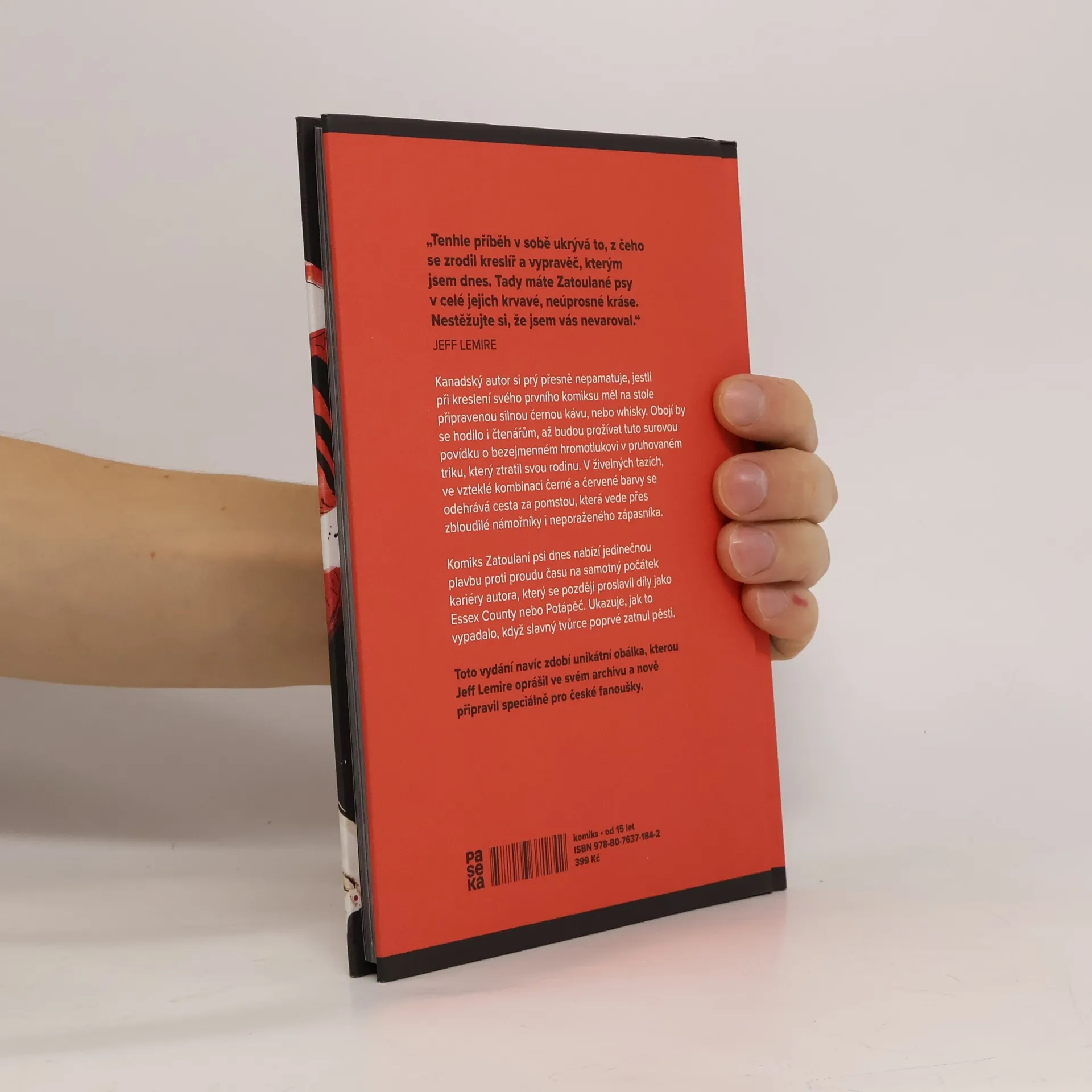 Kanadský autor Jeff Lemire si prý přesně nepamatuje, jestli při kreslení svého prvního komiksu měl na stole připravenou silnou černou kávu, nebo whisky. Obojí by se hodilo i čtenářům, až budou prožívat tuto surovou povídku o bezejmenném hromotlukovi v pruhovaném triku, který ztratil svou rodinu. V živelných tazích, ve vzteklé kombinaci červené a černé barvy se odehrává cesta za pomstou, která vede přes zbloudilé námořníky i neporaženého zápasníka. Komisk Toulaví psi dnes nabízí jedinečnou plavbu proti proudu času na samotný začátek kariéry autora, který se později proslavil díly jako Essex Country nebo Potápěč. Ukazuje, jak to vypadalo, když slavný tvůrce poprvé zatnul pěsti.