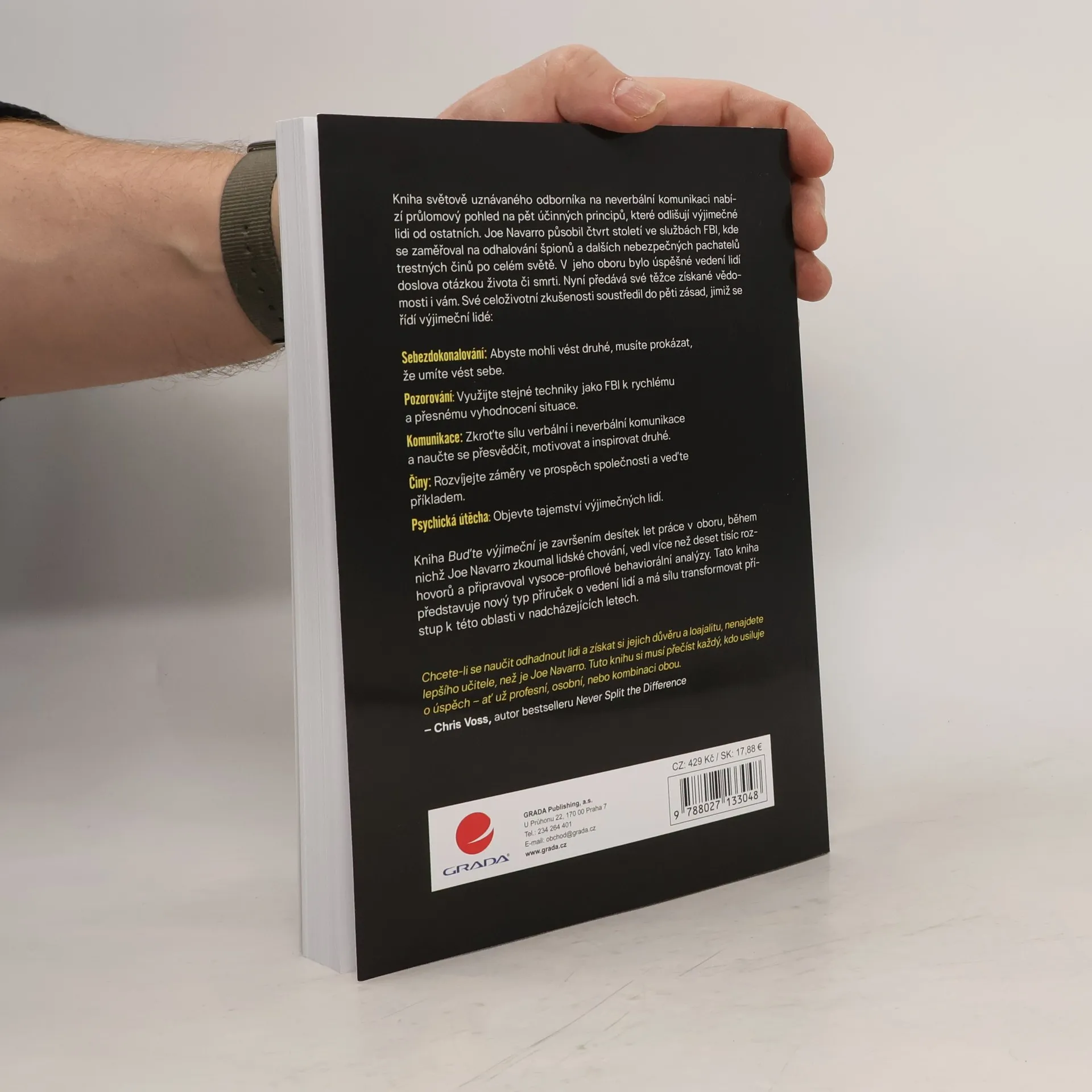 Kniha světově uznávaného odborníka na neverbální komunikaci nabízí průlomový pohled na pět účinných principů, které odlišují výjimečné lidi od ostatních. Joe Navarro působil čtvrt století ve službách FBI, kde se zaměřoval na odhalování špionů a dalších nebezpečných pachatelů trestných činů po celém světě. V jeho oboru bylo úspěšné vedení lidí doslova otázkou života či smrti. Nyní předává své těžce získané vědomosti i vám. Své celoživotní zkušenosti soustředil do pěti zásad, jimiž se řídí výjimeční lidé: Sebezdokonalování: Abyste mohli vést druhé, musíte prokázat, že umíte vést sebe. Pozorování: Využijte stejné techniky jako FBI k rychlému a přesnému vyhodnocení situace. Komunikace: Zkroťte sílu verbální i neverbální komunikace a naučte se přesvědčit, motivovat a inspirovat druhé. Činy: Rozvíjejte záměry ve prospěch společnosti a veďte příkladem. Psychická útěcha: Objevte tajemství výjimečných lidí. Kniha „Buďte výjimeční“ je završením desítek let práce v oboru, během nichž Joe Navarro zkoumal lidské chování, vedl více než deset tisíc rozhovorů a připravoval vysoce-profilové behaviorální analýzy. Tato kniha představuje nový typ příruček o vedení lidí a má sílu transformovat přístup k této oblasti v nadcházejících letech.