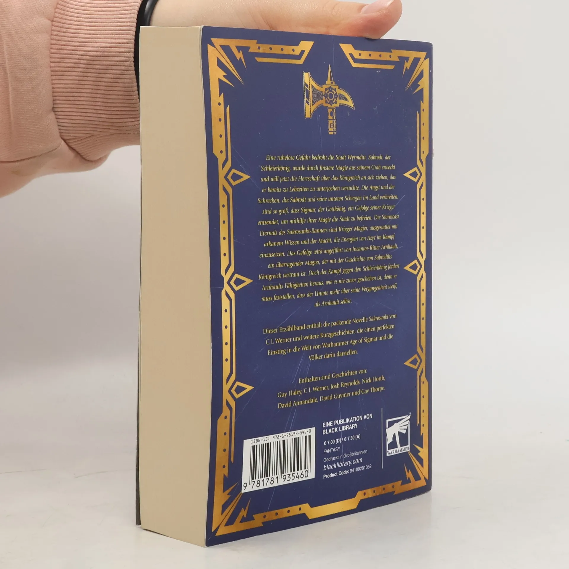 Eine ruhelose Gefahr bedroht die Stadt Wyrmditt. Sabrodt, der Schleierkönig, wurde durch finstere Magie aus seinem Grab erweckt und will jetzt die Herrschaft über das Königreich an sich ziehen, das er bereits zu Lebzeiten zu unterjochen versuchte. Die Angst und der Schrecken, die Sabrodt und seine untoten Schergen im Land verbreiten, sind so groß, dass Sigmar, der Gottkönig, ein Gefolge seiner Krieger entsendet, um mithilfe ihrer Magie die Stadt zu befreien. Die Stormcast Eternals des Sakrosankt-Banners sind Krieger-Magier, ausgestattet mit arkanem Wissen und der Macht, die Energien von Azyr im Kampf einzusetzen. Das Gefolge wird angeführt von Incantor-Ritter Arnhault, ein überragender Magier, der mit der Geschichte von Sabrodths Königreich vertraut ist. Doch der Kampf gegen den Schleierkönig fordert Arnhaults Fähigkeiten heraus, wie es nie zuvor geschehen ist, denn er muss feststellen, dass der Untote mehr über seine Vergangenheit weiß, als Arnhault selbst. Dieser Erzählband enthält die packende Novelle Sakrosankt von C L Werner und weitere Kurzgeschichten, die einen perfekten Einstieg in die Welt von Warhammer Age of Sigmar und die Völker darin darstellen. Enthalten sind Geschichten von C L Werner, Josh Reynolds, Nick Horth, David Annandale, Guy Haley, David Guymer und Gav Thorpe.