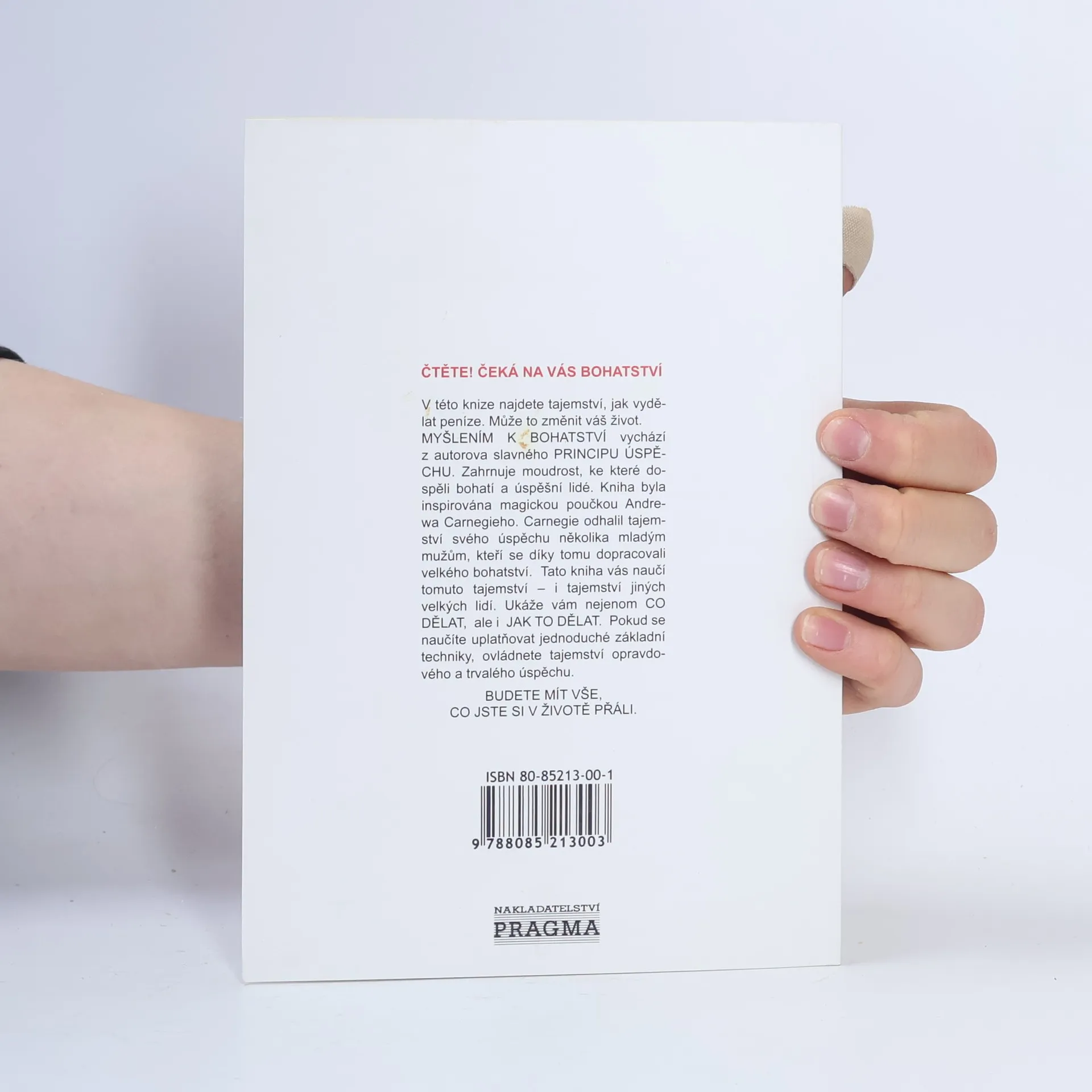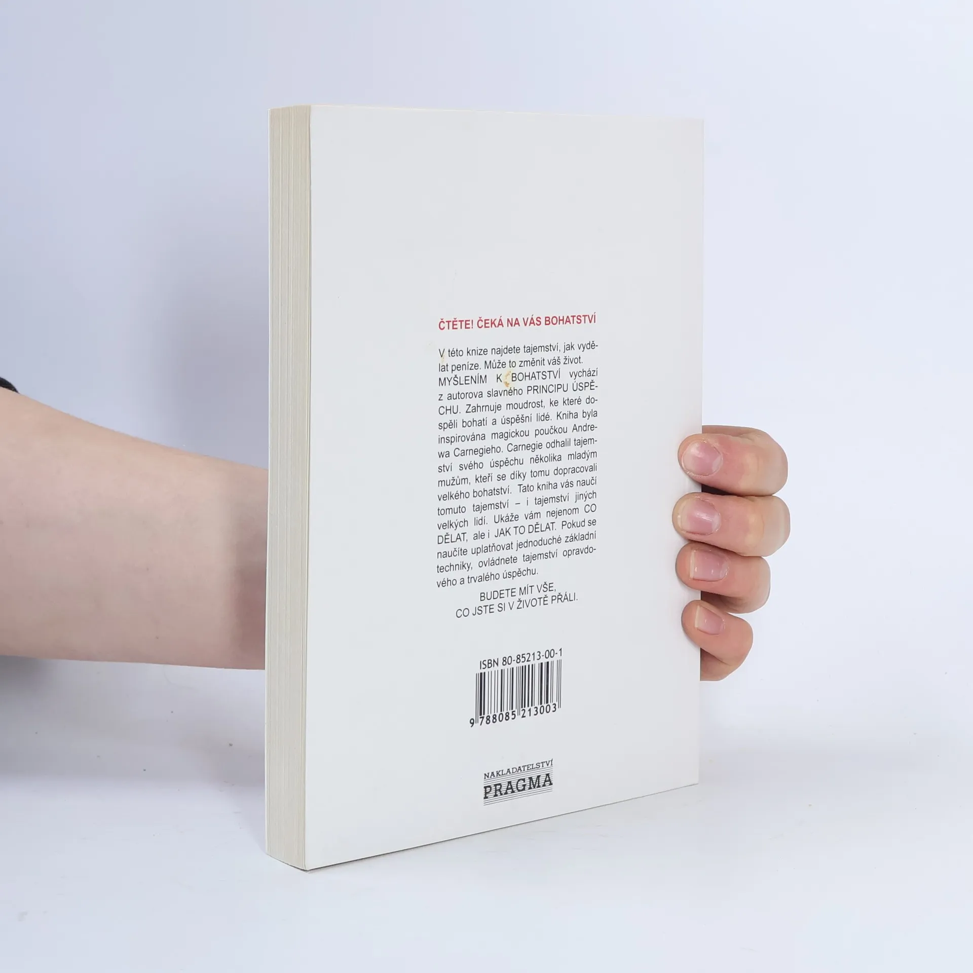 První vydání amerického bestselleru. Kniha nás naučí rozvíjet všechny dobré vlastnosti jako je vůle, rozhodnost, vytrvalost a pevný charakter. Je to návod na bohatství nejenom materiální, ale především bohatství vnitřní. Poukazuje na naše skryté kvality, na náš talent a podává návod, jak ho využít. Dozvíte se, jak si vytvořit správný okruh spolupracovníků, jak podnikat, jak začít, jak vytrvalostí dovést své záměry k úspěšnému konci. Všechno materiální má začátek v myšlence, to je základní idea této knihy od Napoleona Hilla. V této knize najdete tajemství, jak vydělat peníze. Může to změnit váš život. MYŠLENÍM K BOHATSTVÍ vychází z autorova slavného PRINCIPU ÚSPĚCHU. Zahrnuje moudrost, ke které dospěli bohatí a úspěšní lidé. Kniha byla inspirována magickou poučkou Andrewa Carnegieho. Carnegie odhalil tajemství svého úspěchu několika mladým mužům, kteří se díky tomu dopracovali velkého bohatství. Tato kniha vás naučí tomuto tajemství — i tajemství jiných velkých lidí. Ukáže vám nejenom CO DĚLAT, ale i JAK TO DĚLAT. Pokud se naučíte uplatňovat jednoduché základní techniky, ovládnete tajemství opravdového a trvalého úspěchu. BUDETE MÍT VŠE, CO JSTE SI V ŽIVOTĚ PŘÁLI.