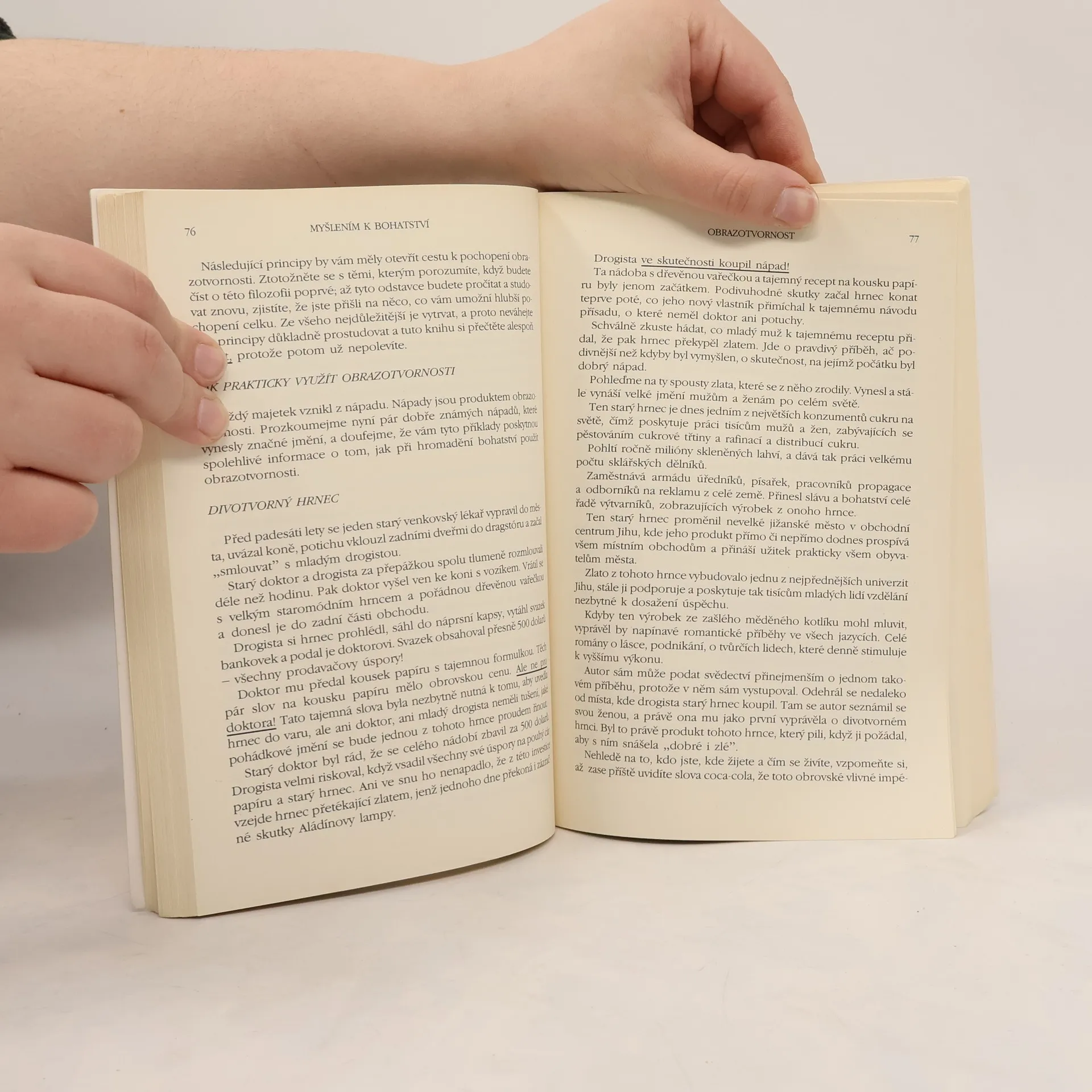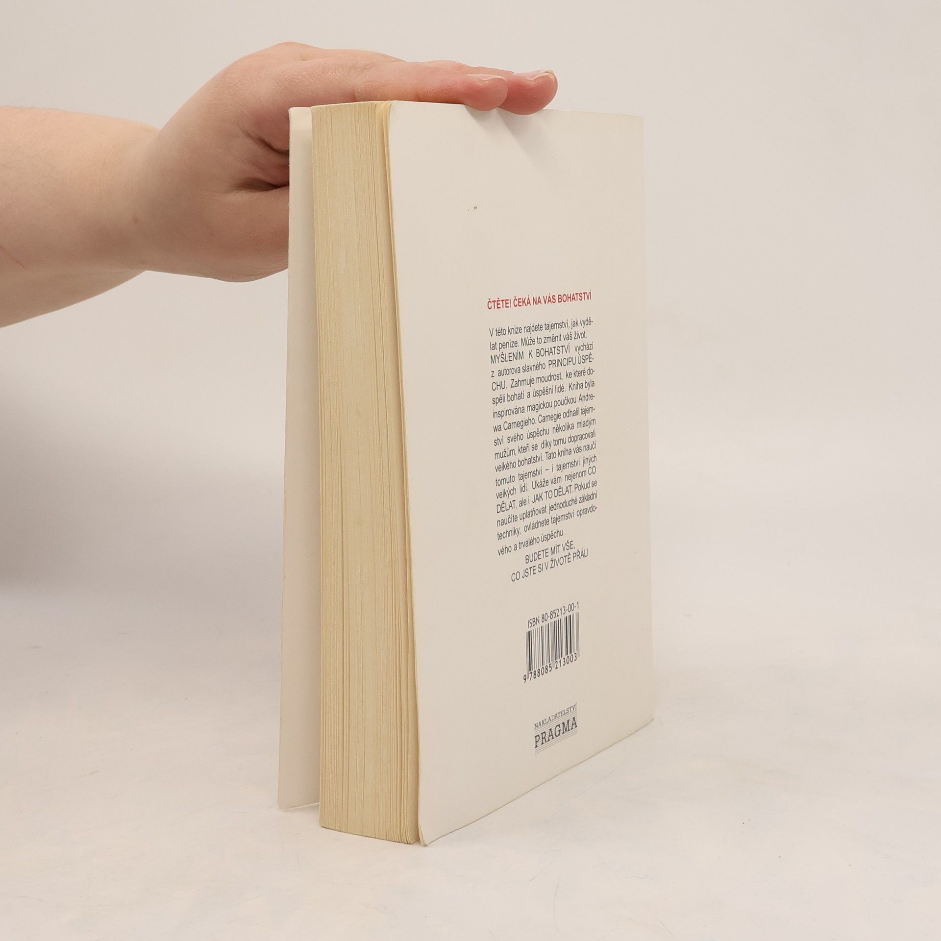 První vydání amerického bestselleru. Kniha nás naučí rozvíjet všechny dobré vlastnosti jako je vůle, rozhodnost, vytrvalost a pevný charakter. Je to návod na bohatství nejenom materiální, ale především bohatství vnitřní. Poukazuje na naše skryté kvality, na náš talent a podává návod, jak ho využít. Dozvíte se, jak si vytvořit správný okruh spolupracovníků, jak podnikat, jak začít, jak vytrvalostí dovést své záměry k úspěšnému konci. Všechno materiální má začátek v myšlence, to je základní idea této knihy od Napoleona Hilla. V této knize najdete tajemství, jak vydělat peníze. Může to změnit váš život. MYŠLENÍM K BOHATSTVÍ vychází z autorova slavného PRINCIPU ÚSPĚCHU. Zahrnuje moudrost, ke které dospěli bohatí a úspěšní lidé. Kniha byla inspirována magickou poučkou Andrewa Carnegieho. Carnegie odhalil tajemství svého úspěchu několika mladým mužům, kteří se díky tomu dopracovali velkého bohatství. Tato kniha vás naučí tomuto tajemství — i tajemství jiných velkých lidí. Ukáže vám nejenom CO DĚLAT, ale i JAK TO DĚLAT. Pokud se naučíte uplatňovat jednoduché základní techniky, ovládnete tajemství opravdového a trvalého úspěchu. BUDETE MÍT VŠE, CO JSTE SI V ŽIVOTĚ PŘÁLI.
