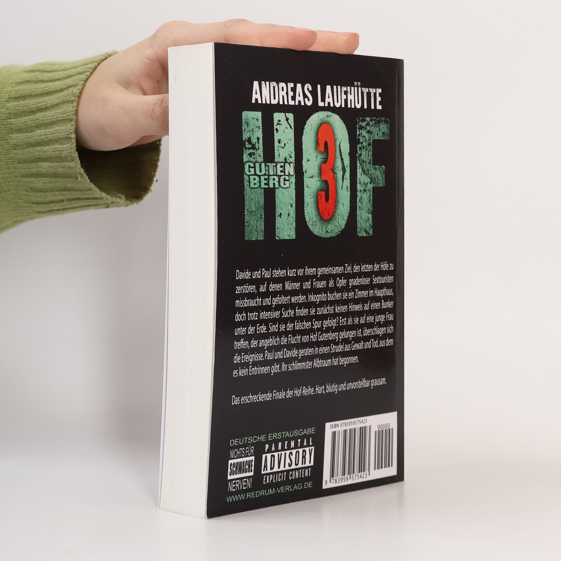 Davide und Paul stehen kurz vor ihrem gemeinsamen Ziel, den letzten der Höfe zu zerstören, auf denen Männer und Frauen als Opfer gnadenloser Sextouristen missbraucht und gefoltert werden. Inkognito buchen sie ein Zimmer im Haupthaus, doch trotz intensiver Suche finden sie zunächst keinen Hinweis auf einen Bunker unter der Erde. Sind sie der falschen Spur gefolgt? Erst als sie auf eine junge Frau treffen, der angeblich die Flucht von Hof Gutenberg gelungen ist, überschlagen sich die Ereignisse. Paul und Davide geraten in einen Strudel aus Gewalt und Tod, aus dem es kein Entrinnen gibt. Ihr schlimmster Albtraum hat begonnen. Das erschreckende Finale der Hof-Reihe. Hart, blutig und unvorstellbar grausam.