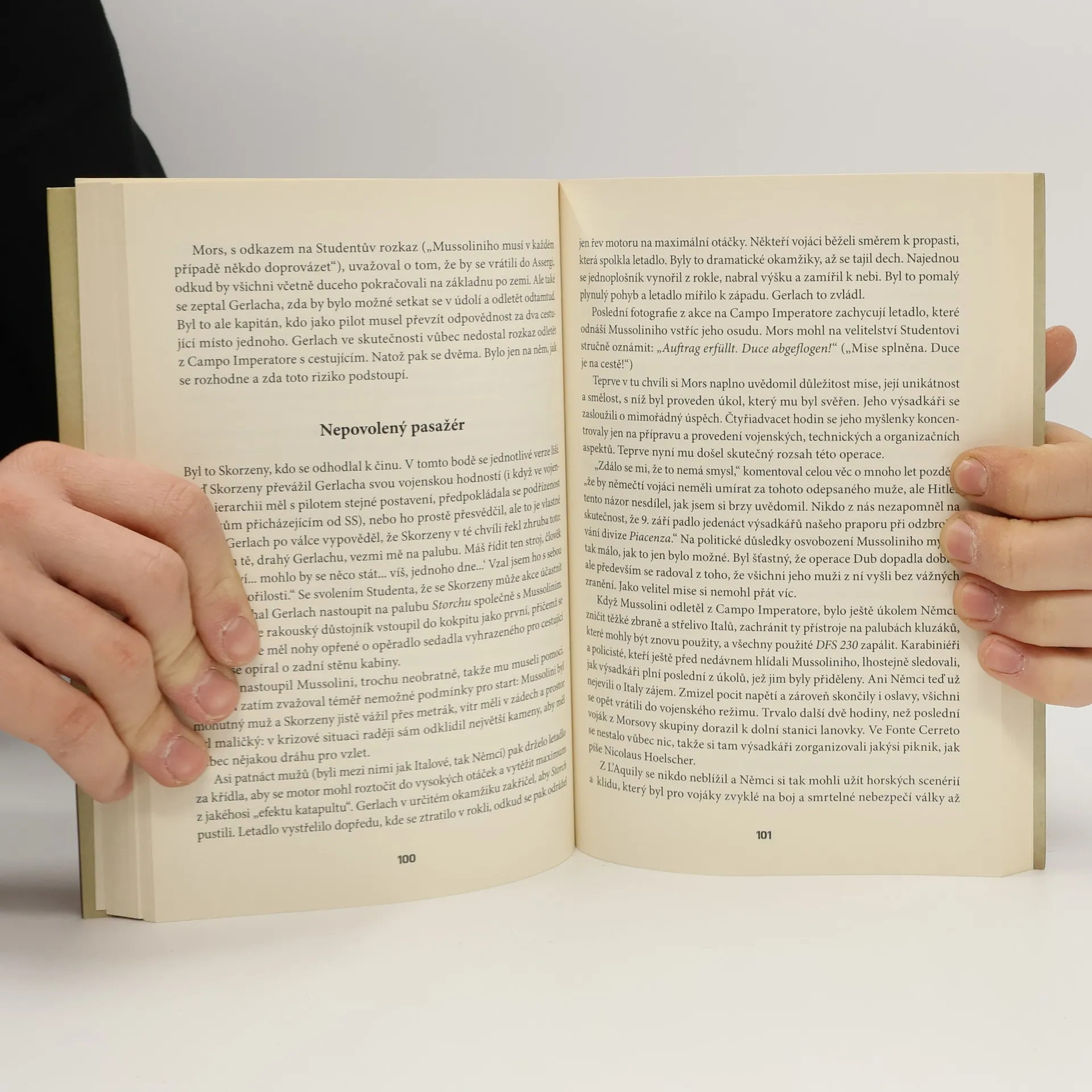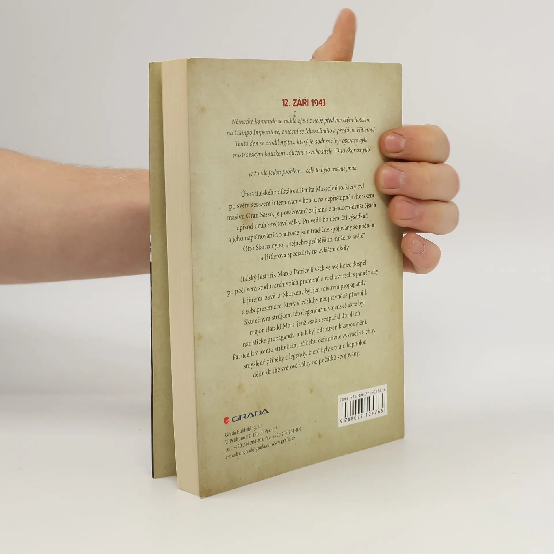 Únos italského diktátora Benita Mussoliniho, internovaného v hotelu Campo Imperatore na nepřístupném horském masívu Gran Sasso, je považován za jednu z nejdobrodružnějších epizod druhé světové války. Italové považovali toto místo za nedobytné, avšak Němcům se podařilo zorganizovat složitou operaci, během níž italští policisté a vojáci jen bezradně sledovali, jak na hotel přistávají německé kluzáky plné výsadkářů. Ti rychle obsadili hotel, posadili Mussoliniho do letadla a odletěli s ním. Hlavní postavou této vojenské operace byl Otto Skorzeny, elitní člen SS a specialista na zvláštní úkoly, označovaný jako „nejnebezpečnější muž na světě“. Italský historik Marco Patricelli, na základě pečlivého studia archivních materiálů a osobních setkání, dospěl k závěru, že Skorzeny si neoprávněně přisvojil zásluhy za Mussoliniho únos a stal se hrdinou v očích Hitlera, který chtěl akci prezentovat jako ukázku schopností německých vojáků. Skorzenyho role však byla jiná. Operaci, o níž se stále hovoří na vojenských akademiích, připravili generál Kurt Student a major Harald Mors, který plánoval detaily a velel akci na místě. Patricelli čtenářům předkládá strhující příběh plný politických intrik, špionáže a vojenských operací, rekonstruující události, které se odehrály 12. září na Gran Sassu.