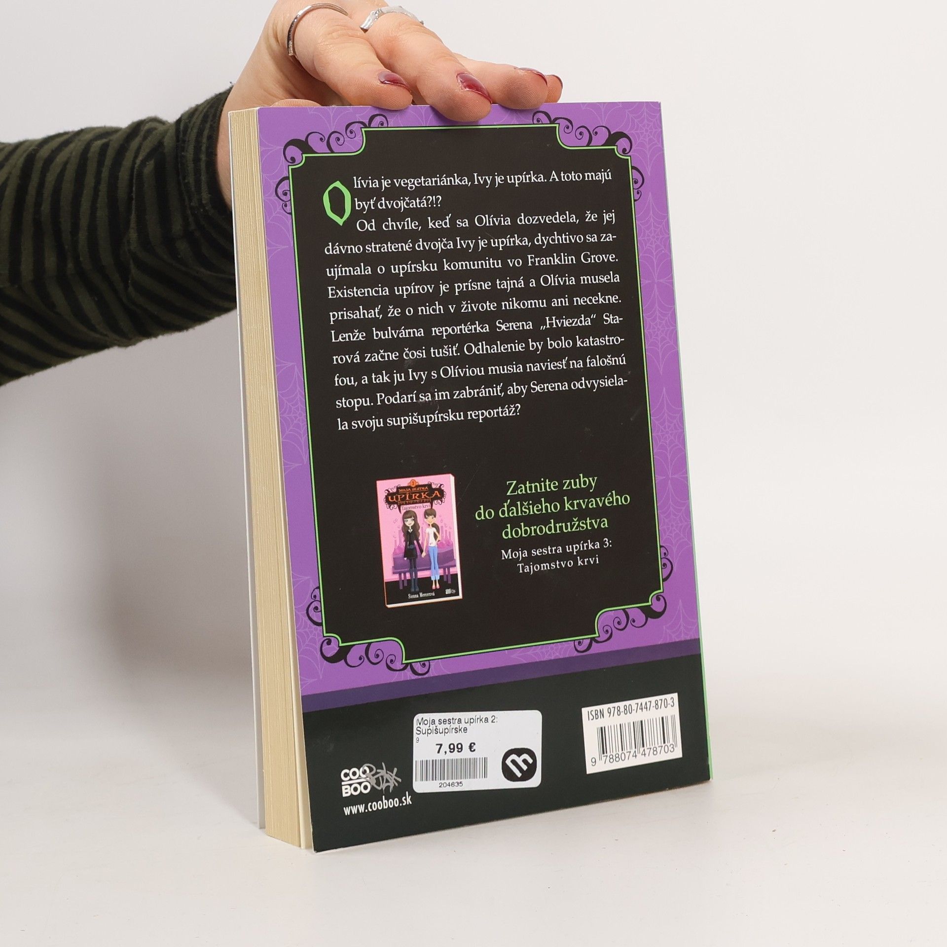 Sú Olívia a Ivy naozaj dvojčatá? Nie. Ivy je totiž upírka... Druhé pokračovanie obľúbenej série!Olívia je vegetariánka. Ivy je upírka. A sú dvojčatá?!? Odkedy Olívia zistila, že jej dávno stratená sestra Ivy je upírka, so záujmom počúvala všetko, čo jej Ivy rozprávala o upírskej komunite vo Franklin Grove. Je to prísne tajné a Olívia sľúbila, že to nikdy nikomu nepovie. Ale zvedavá bulvárna reportérka Serena „Hviezda“ Starová všade sliedi. Postupne sa dostáva bližšie k pravde a len Ivy a Olívia ju dokážu zmiasť a priviesť na falošnú stopu. Je to supišupírska senzácia, ktorá nesmie vyjsť najavo!