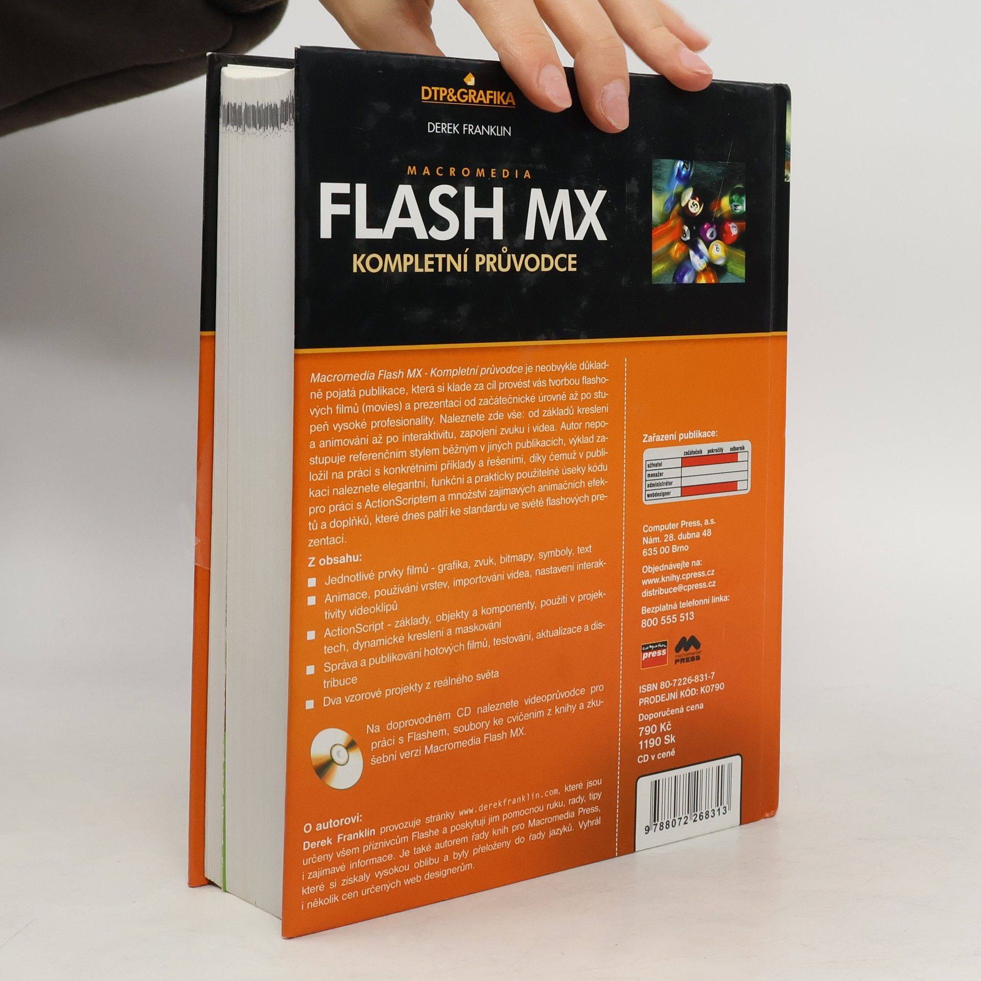 Výklad obsáhlé příručky je založen na práci s konkrétními příklady a řešeními, díky čemuž obsahuje funkční a prakticky použitelné úseky kódu pro práci s ActionScriptem a množství zajímavých animačních efektů a doplňků, které patří ke standardu ve světě flashových prezentací. Nalezneme zde jak základy kreslení a animování, tak interaktivitu, tedy zapojení zvuku i videa. Doprovodné CD obsahuje videoprůvodce pro práci s Flashem, soubory ke cvičením z knihy a zkušební verzi Macromedia Flash MX. Publikaci mohou využít jak uživatelé včetně začátečníků, tak webdesigneři.