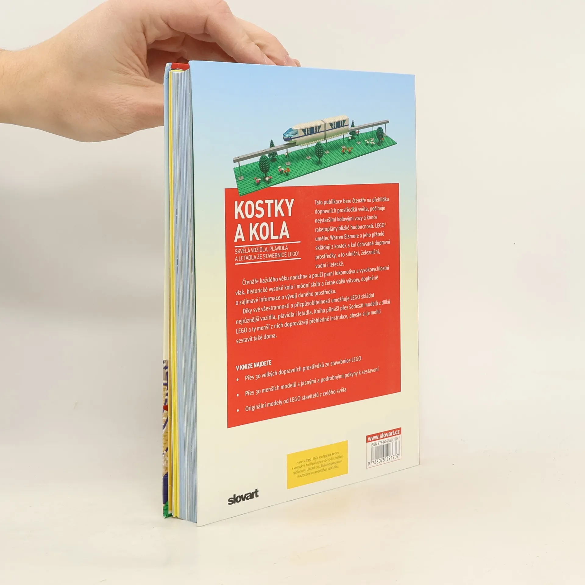 Díky své všestrannosti a přizpůsobitelnosti umožňuje LEGO skládat nejrůznější vozidla, plavidla i letadla. Kostky a kola přinášejí přes šedesát modelů z dílků LEGO a ty menší z nich doprovázejí přehledné instrukce, abyste si je mohli sestavit také doma. Čtenáře každého věku nadchne a poučí parní lokomotiva a vysokorychlostní vlak, historické vysoké kolo i módní skútr a četné další výtvory, doplněné o zajímavé informace o vývoji daného prostředku.