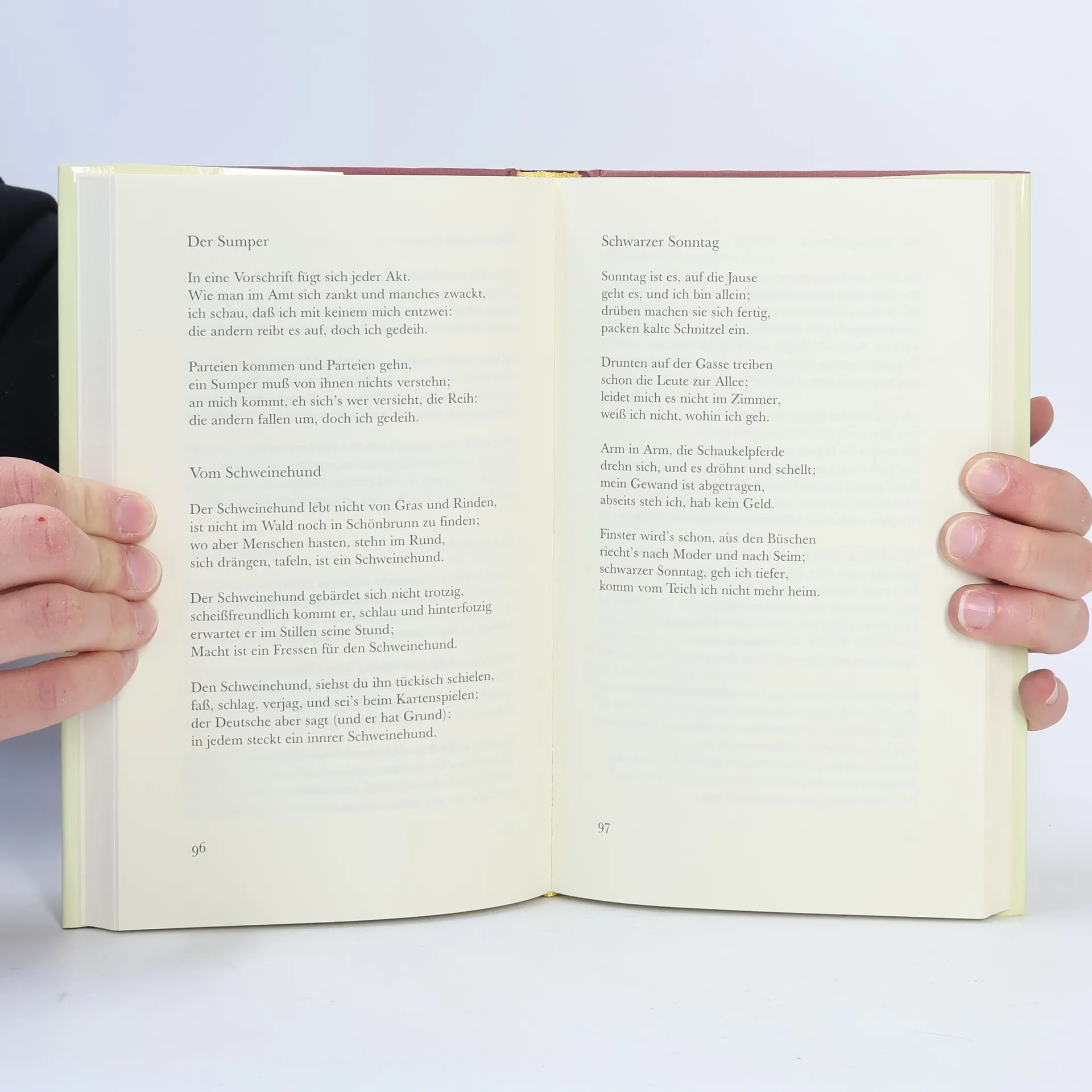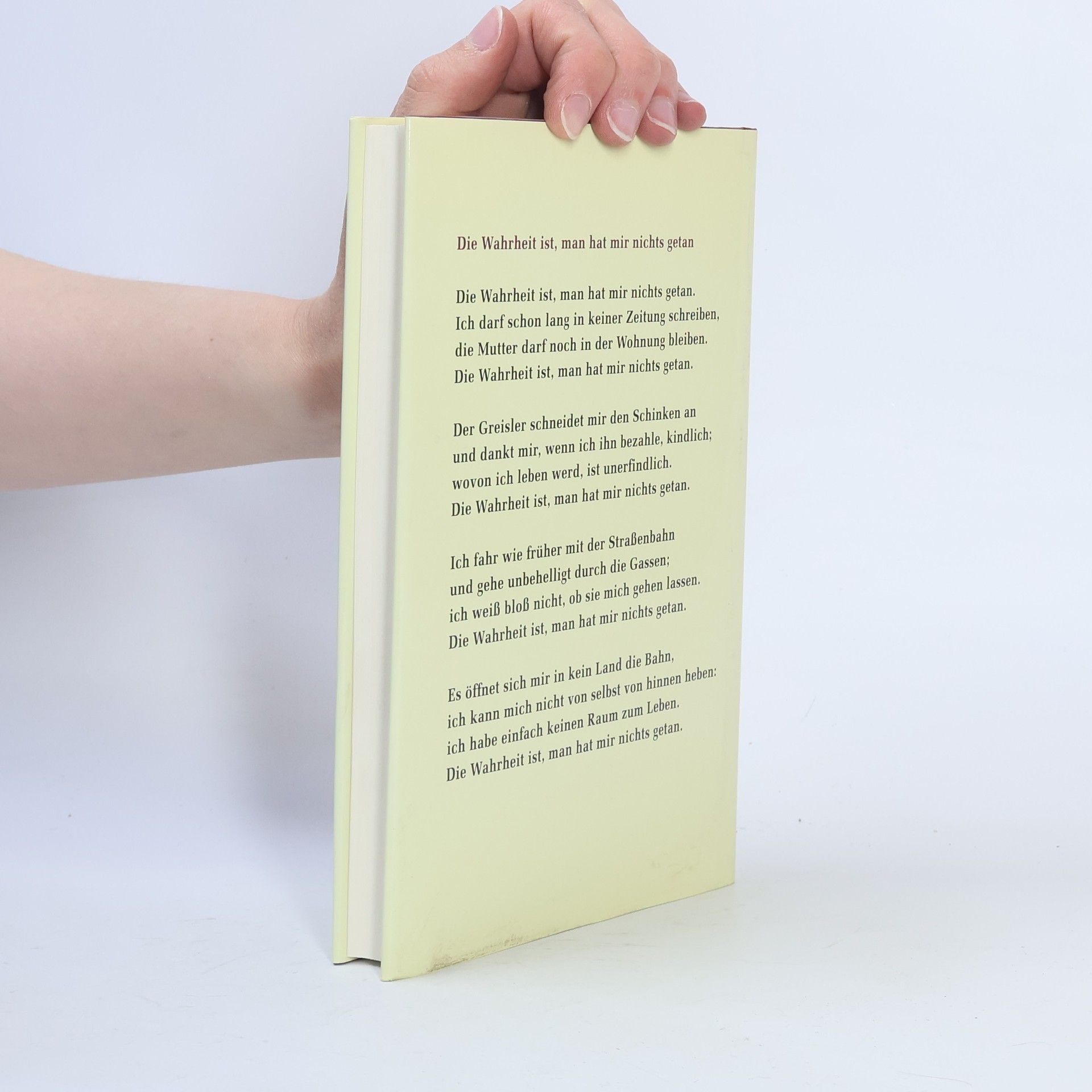 Die Wahrheit ist, man hat mir nichts getan. Ich darf schon lang in keiner Zeitung schreiben, die Mutter darf noch in der Wohnung bleiben. Die Wahrheit ist, man hat mir nichts getan. Die Greisler schneidet mir den Schinken an und dankt mir, wenn ich ihn bezahle, kindlich; wovon ich leben werd, ist unerfindlich. Die Wahrheit ist, man hat mir nicht getan. Ich fahr wie früher mit der Straßenbahn und gehe unbehelligt durch die Gassen; ich weiß bloß nicht, ob sie mich gehen lassen. Die Wahrheit ist, man hat mir nichts getan. Es öffnet sich mir kein Land die Bahn, ich kann mich nicht von selbst von hinnen heben: ich habe einfach keinen Raum zum Leben. Die Wahrheit ist, man hat mir nichts getan