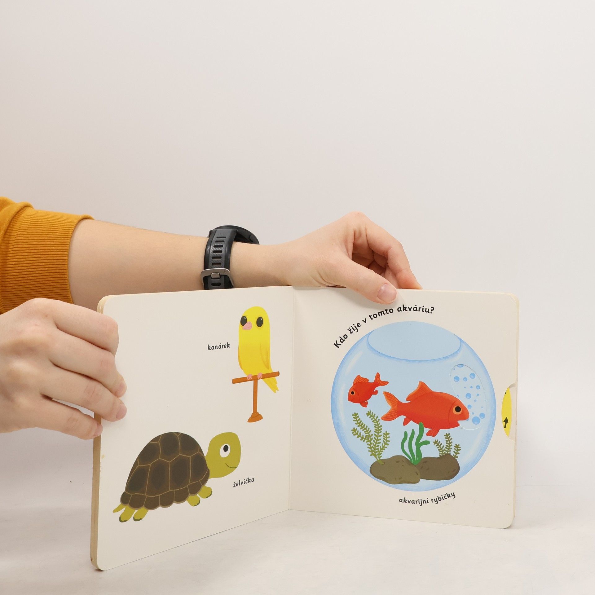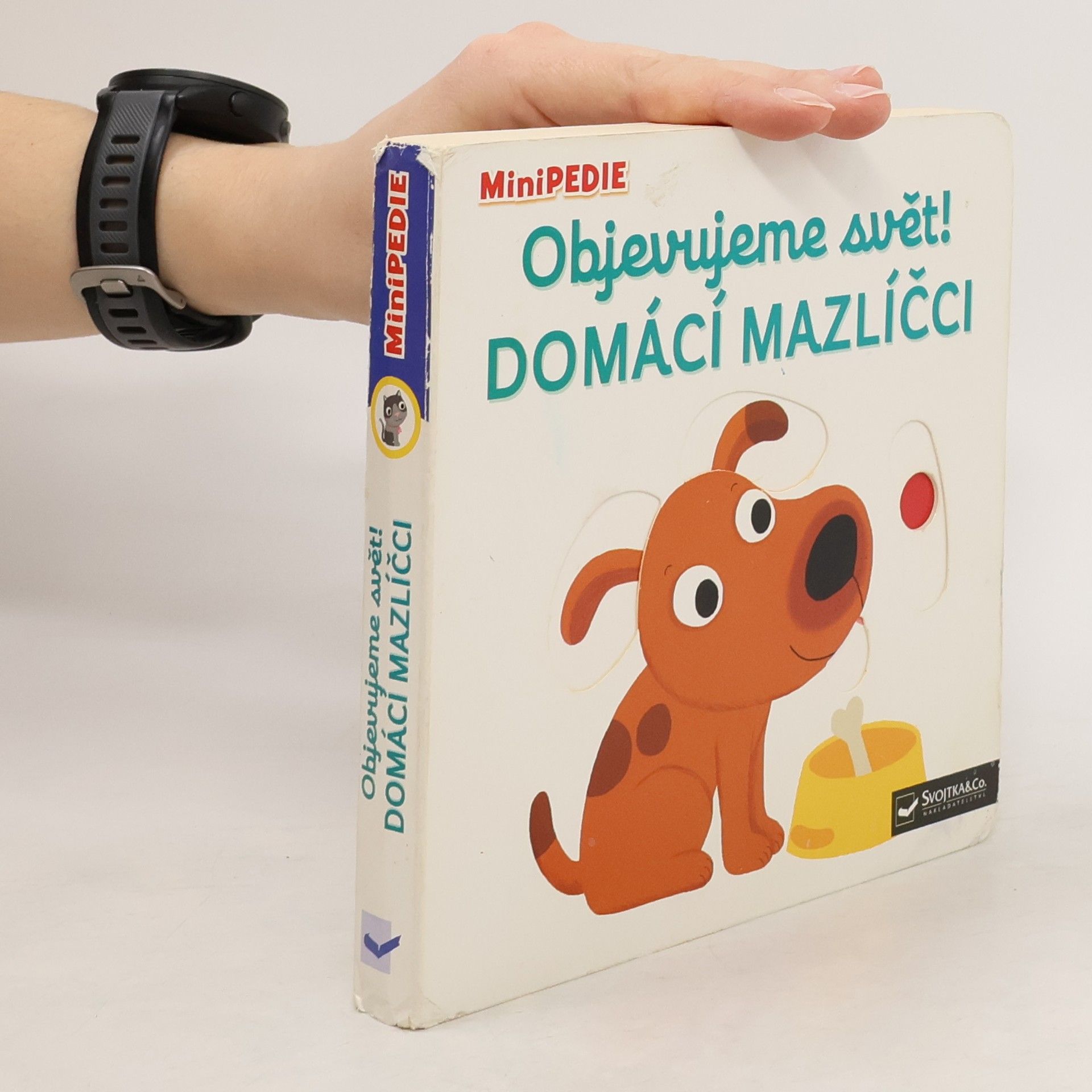 Objevovat svět zvířátek a domácích mazlíčků je s tímto leporelem tak zábavné! Kdo si hraje s klubíčkem vlny? Kdo žije v tomto akváriu? Kdo si hraje v psí boudě? Kdo běhá v kolečku? Pojmenuj zvířátka a ukaž, které máš nejraději! Stačí jen vložit prstík do správného otvoru, lehce posunout nebo otočit ve směru šipky a hned bude váš malý objevitel nebo objevitelka znát odpovědi. Leporelo je určeno pro nejmenší děti od jednoho roku a má pevné stránky s posuvnými prvky, a tak si naši nejmenší mohou při prohlížení a pojmenovávání procvičit i jemnou motoriku.
