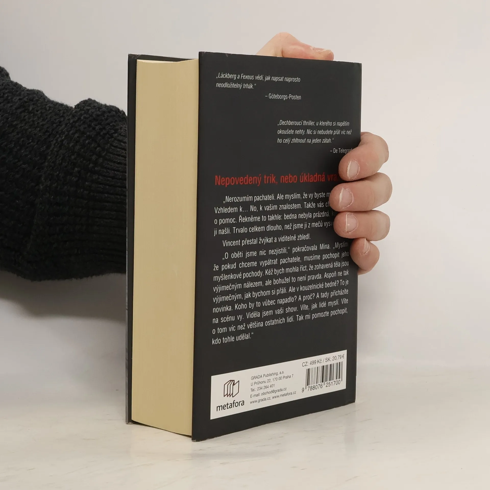 Jediný způsob, jak ho dopadnout, je být o krok před ním Před zábavním parkem ve Stockholmu objeví policie tělo ženy v bedně probodané meči. I když to na první pohled připomíná nepovedený kouzelnický trik, záhy je jasné, že se jedná o mimořádně brutální vraždu. Totožnost oběti však zůstává záhadou a případ se nehýbe z místa. Policistka Mina Dabiriová nakonec nevidí jinou možnost než požádat o pomoc Vincenta Waldera, mentalistu a odborníka na lidskou psychiku i magii. Ačkoli Vincent zpočátku není spoluprací nijak nadšený, probudí se v něm hluboko zasunuté vzpomínky. Spolu s Minou, která rovněž bojuje se svými démony, si během vyšetřování uvědomí, že pronásledují nelítostného sériového vraha. A ten jako by se snažil Vincentovi něco říct. Podaří se jim ho zastavit, než bude obětí víc?