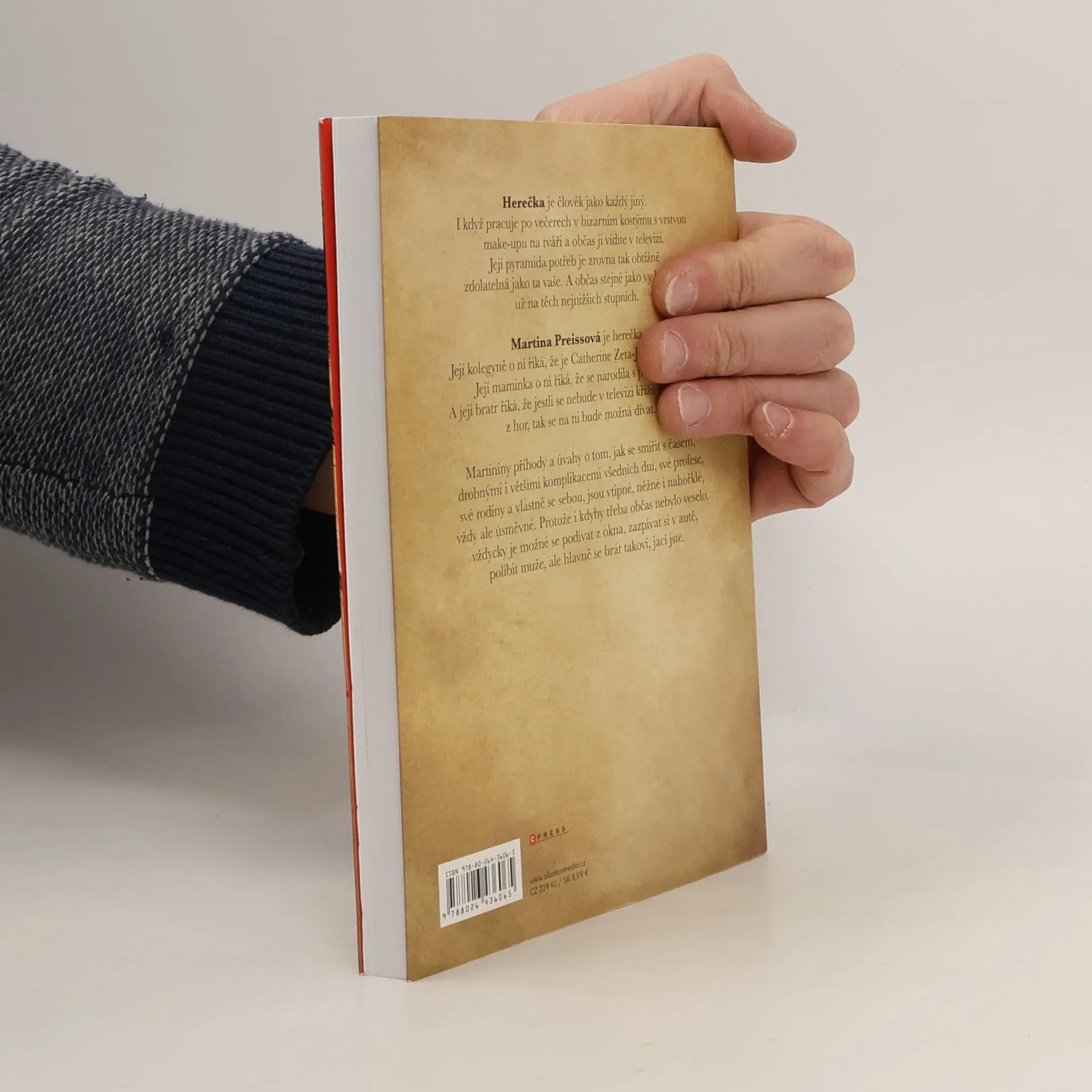 Ste hérečka?! A kerá? Herečka je člověk jako každý jiný. I když pracuje po večerech v bizarním kostýmu s vrstvou make-upu na tváři a občas ji vidíte v televizi. Její pyramida potřeb je zrovna tak obtížně zdolatelná jako ta vaše. A občas stejně jako vy klopýtá už na těch nejnižších stupních. Martina Preissová je herečka. Její kolegyně o ní říká, že je Catherine Zeta Jones pro chudý. Její maminka o ní říká, že se narodila s potleskem. A její bratr jí říká, že jestli se v televizi v osm nebude křížit s Doktorem z hor, tak se na ni bude možná dívat. Martininy příhody a úvahy o tom, jak se smířit s časem, drobnými i většími komplikacemi všedních dní, své profese, své rodiny, a vlastně se sebou, jsou vtipné, něžné i nahořklé, vždy ale úsměvné. Protože i kdyby třeba občas nebylo veselo, vždycky je možné podívat se z okna, zazpívat si v autě, políbit muže, ale hlavně se brát takoví, jací jste.