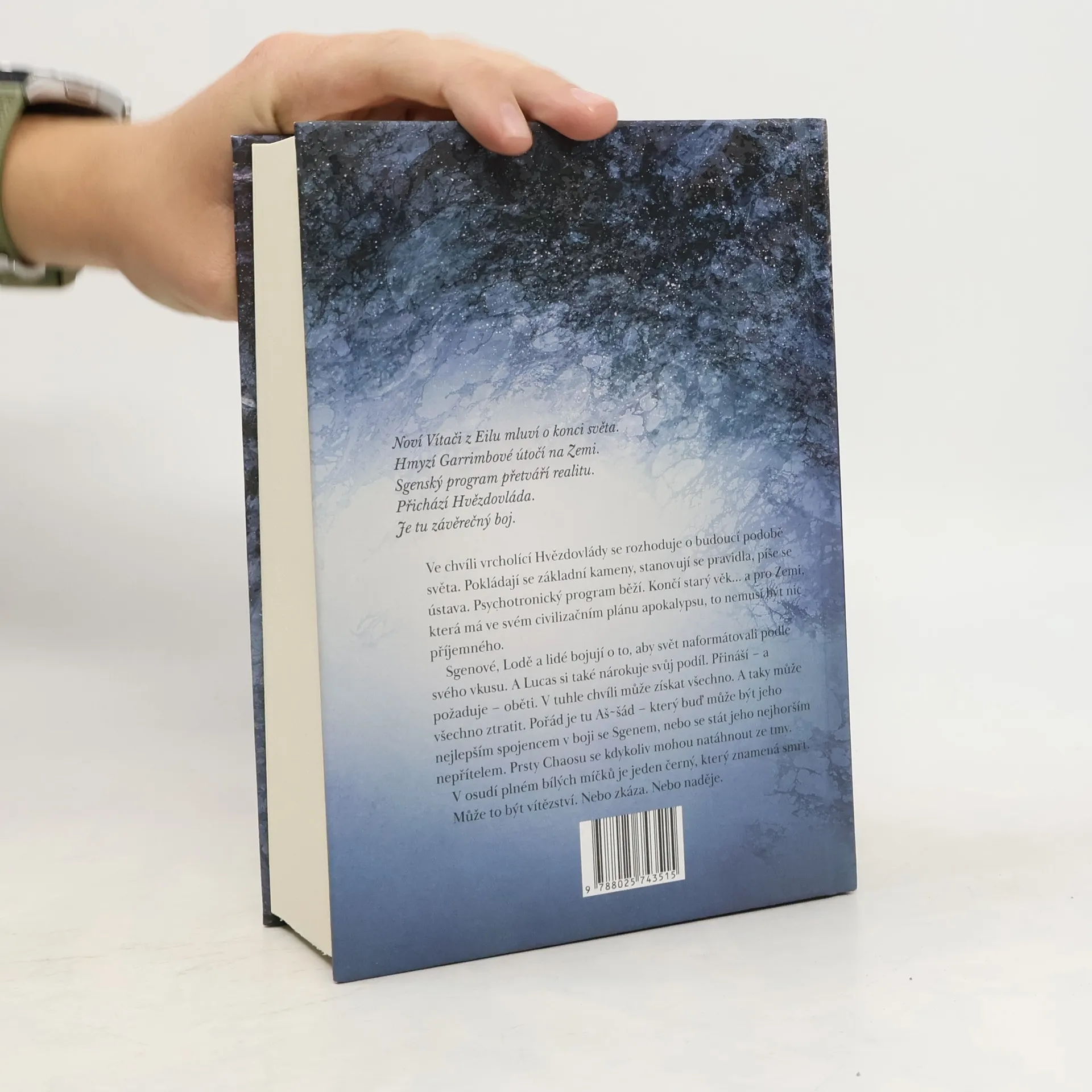Velkolepé vyvrcholení nejobsáhlejší české sci-fi ságy Mycelium je zde. Intriky, psychotronika a krvavé oběti. Všechno míří právě sem. Tohle už je konec. Ve chvíli vrcholící Hvězdovlády se rozhoduje o budoucí podobě světa. Psychotronický program běží. Končí starý věk... a pro Zemi, která má ve svém civilizačním plánu apokalypsu, to nemusí být nic příjemného. Sgenové, Lodě a lidé bojují o to, aby svět naformátovali podle svého vkusu. A Lucas si také nárokuje svůj podíl. Přináší – a požaduje – oběti. V tuhle chvíli může získat všechno. A taky může všechno ztratit. Aš~šád může být jeho nejlepším spojencem v boji se Sgenem, nebo se stát jeho nejhorším nepřítelem. Prsty Chaosu se kdykoliv mohou natáhnout ze tmy. V osudí plném bílých míčků je jeden černý, který znamená smrt. Může to být vítězství. Nebo zkáza. Nebo naděje.