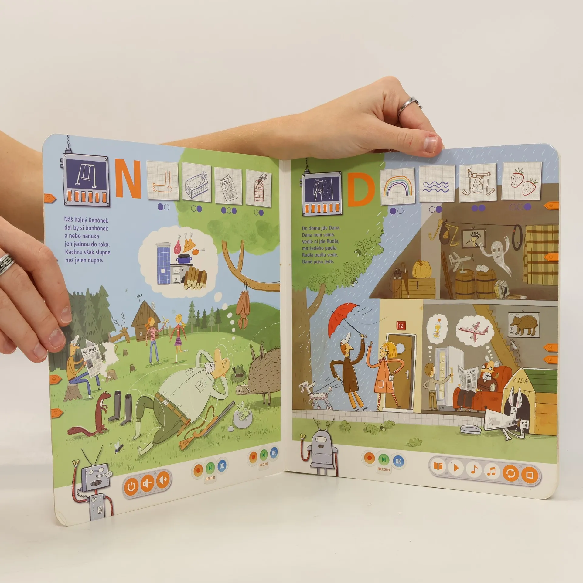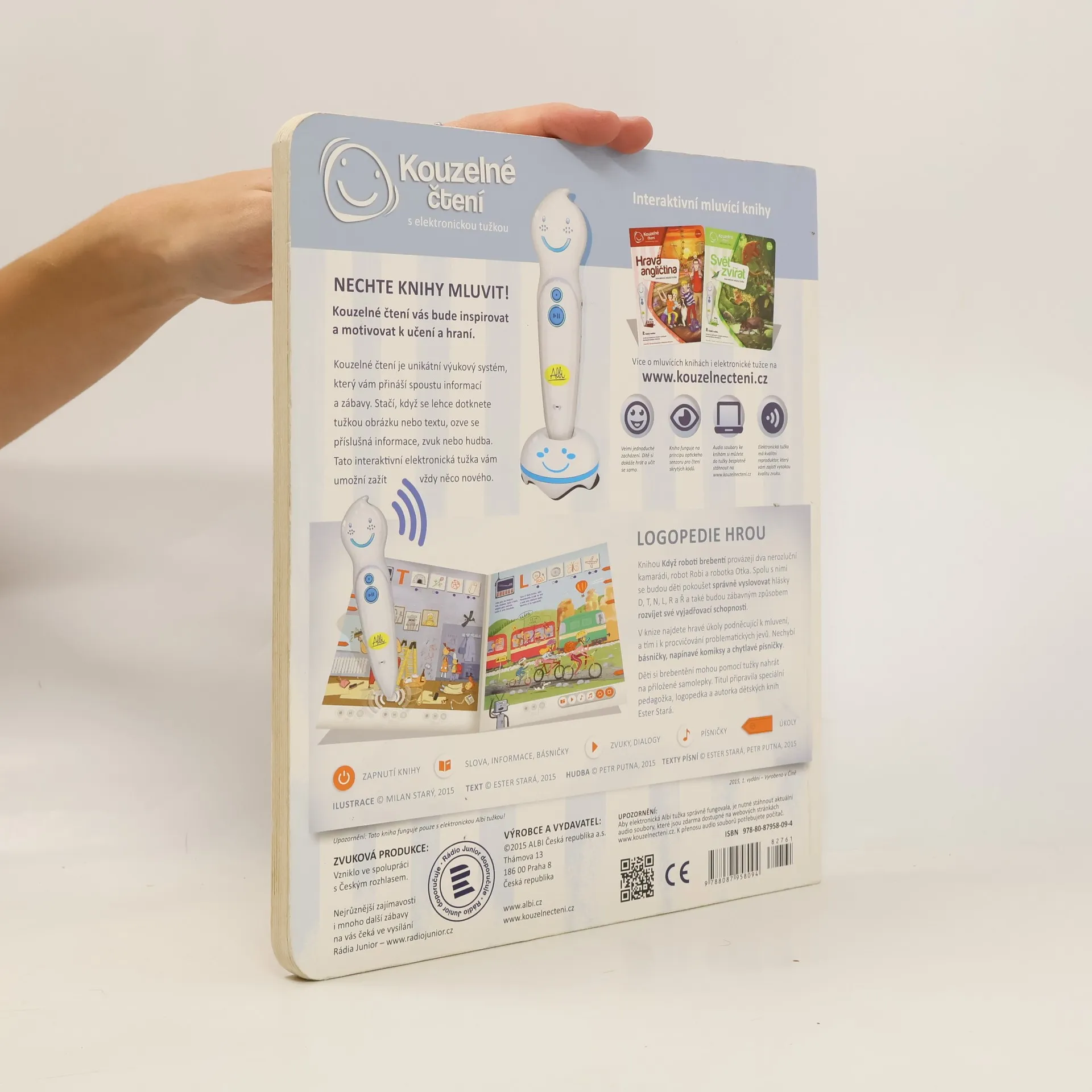 Interaktivní logopedická kniha Knihou děti provází dvě postavičky, robot Robi a robotka Otka, které jim s mluvením pomáhají. Spolu s nimi se děti pokouší správně vyslovovat hlásky D, T, N, L, R a Ř. Kniha obsahuje hravé úkoly podněcující děti k mluvení, a tím i k procvičování problematických jevů. Nechybí ani básničky, písničky a napínavé komiksy. Součástí knihy jsou i kouzelné samolepky, s nimiž si děti mohou svoji výslovnost nahrát a poslechnout. Kniha obsahuje přes 1500 zvuků a textů.