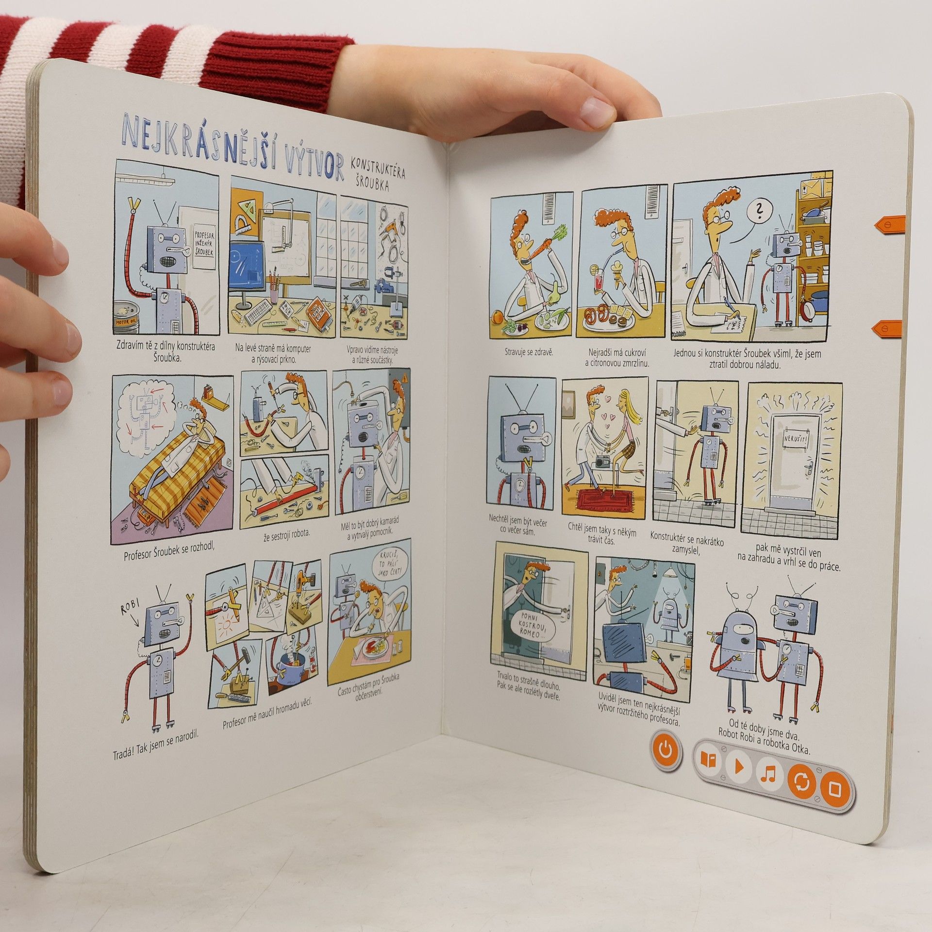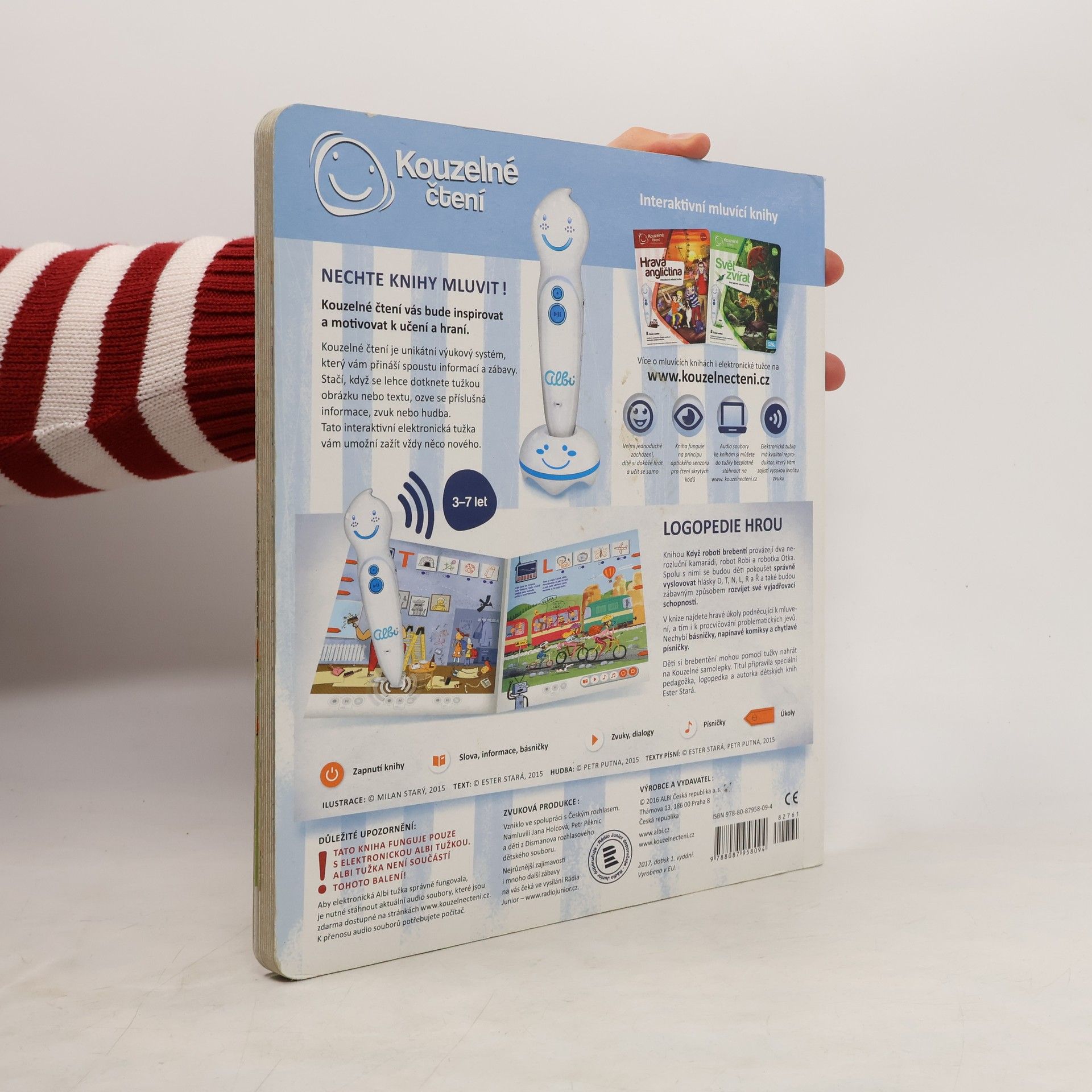 Interaktivní logopedická kniha Knihou děti provází dvě postavičky, robot Robi a robotka Otka, které jim s mluvením pomáhají. Spolu s nimi se děti pokouší správně vyslovovat hlásky D, T, N, L, R a Ř. Kniha obsahuje hravé úkoly podněcující děti k mluvení, a tím i k procvičování problematických jevů. Nechybí ani básničky, písničky a napínavé komiksy. Součástí knihy jsou i kouzelné samolepky, s nimiž si děti mohou svoji výslovnost nahrát a poslechnout. Kniha obsahuje přes 1500 zvuků a textů.