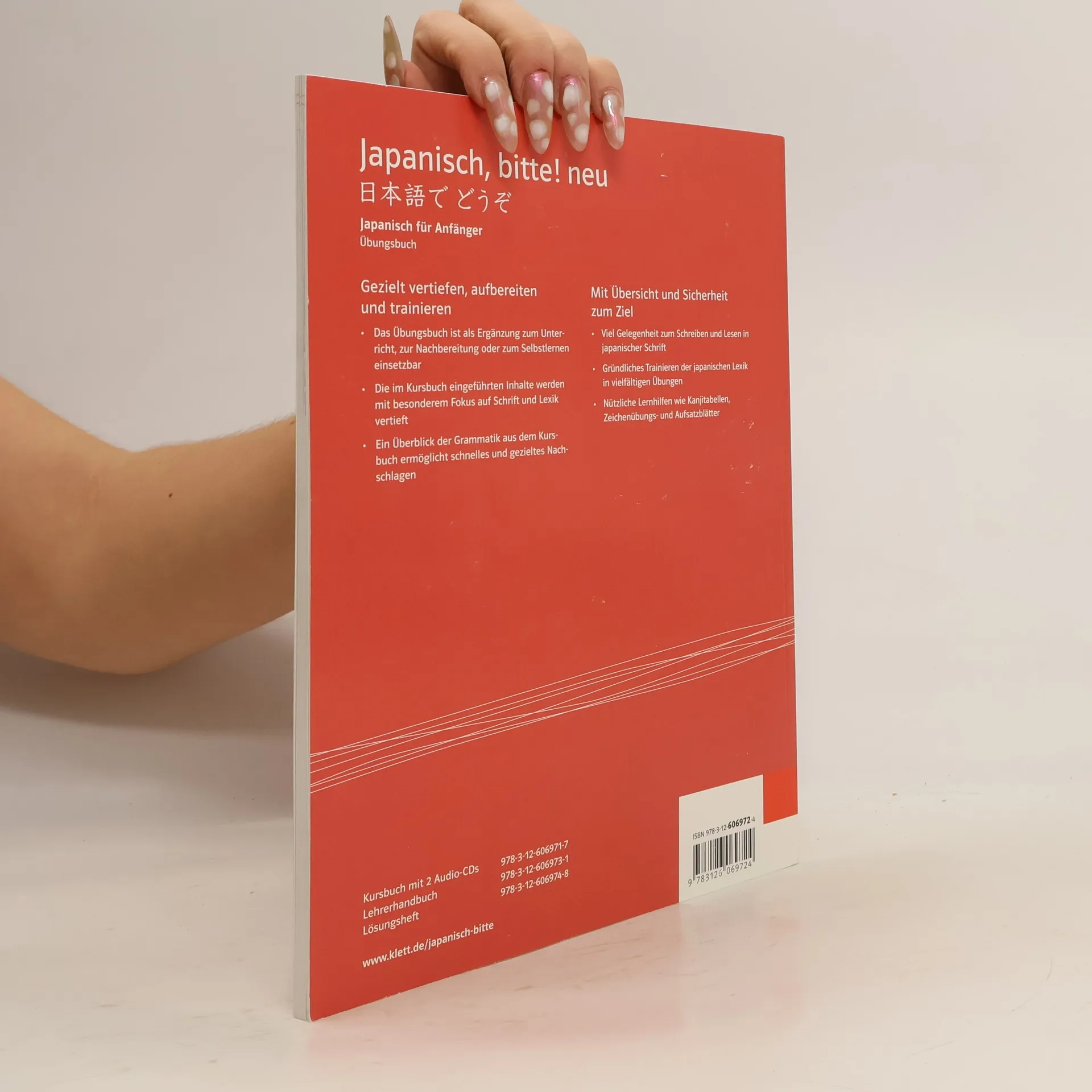 Gezielt vertiefen, aufbereiten und trainieren Das Übungsbuch ist als Ergänzung zum Unterricht, zur Nachbereitung oder zum Selbstlernen einsetzbar Die im Kursbuch eingeführten Inhalte werden mit besonderem Fokus auf Schrift und Lexik vertieft Ein Überblick der Grammatik aus dem Kursbuch ermöglicht schnelles und gezieltes Nachschlagen Mit Übersicht und Sicherheit zum Ziel Viel Gelegenheit zum Schreiben und Lesen in japanischer Schrift Gründliches Trainieren der japanischen Lexik in vielfältigen Übungen Nützliche Lernhilfen wie Kanjitabellen, Zeichenübungs- und Aufsatzblätter
