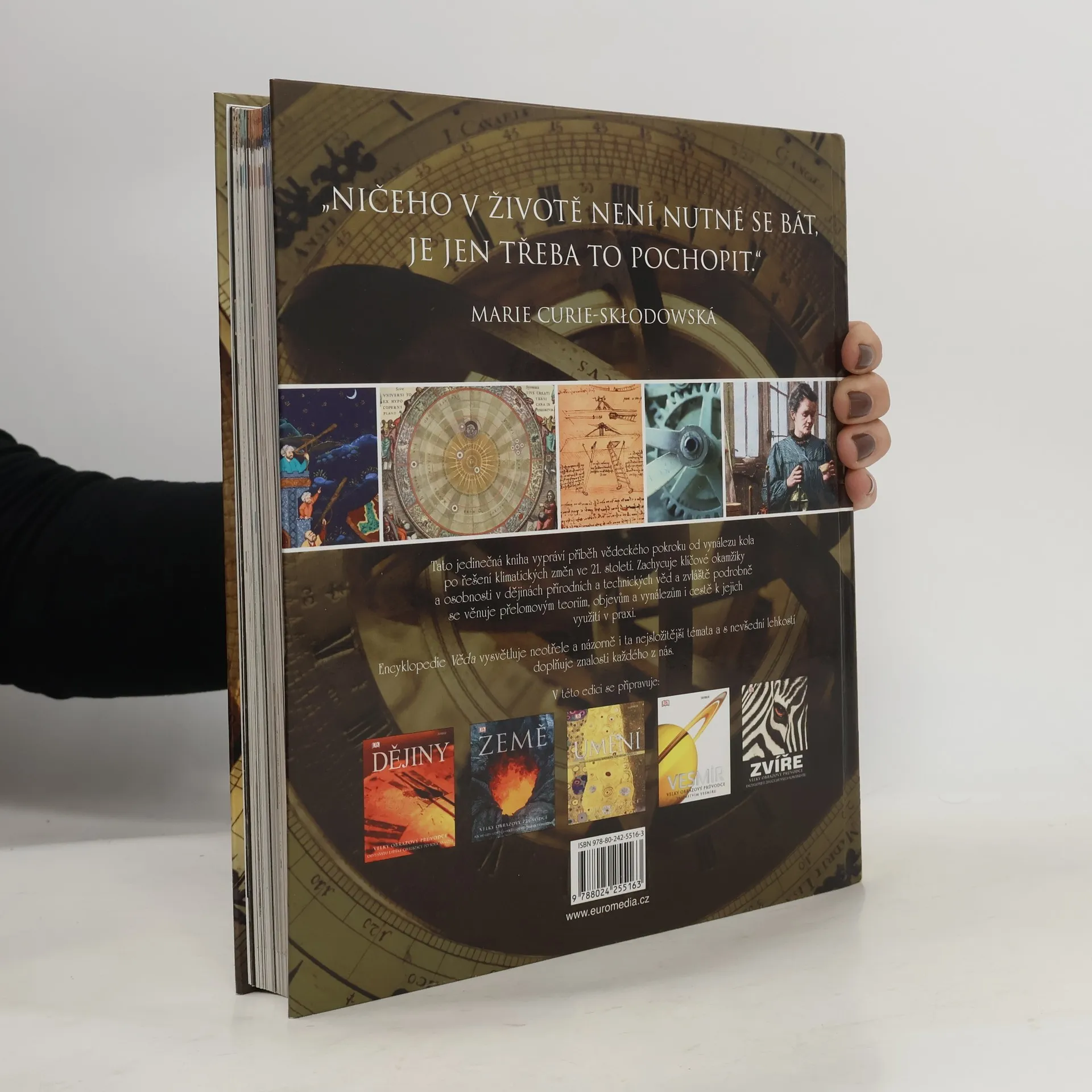 Tato jedinečná kniha vypráví příběh vědeckého pokroku od vynálezu kola až po řešení klimatických změn ve 21. století. Zachycuje všechny klíčové okamžiky nových objevů a ukazuje, jak lidé a jejich myšlenky a vynálezy měnili náš svět. Encyklopedie Věda, vybavená nádhernými fotografiemi a názornými ilustracemi, představuje i ta nejsložitější témata jednoduchým a srozumitelným způsobem, zpřístupňujícím tak lidské vědění čtenářům všech věkových kategorií.