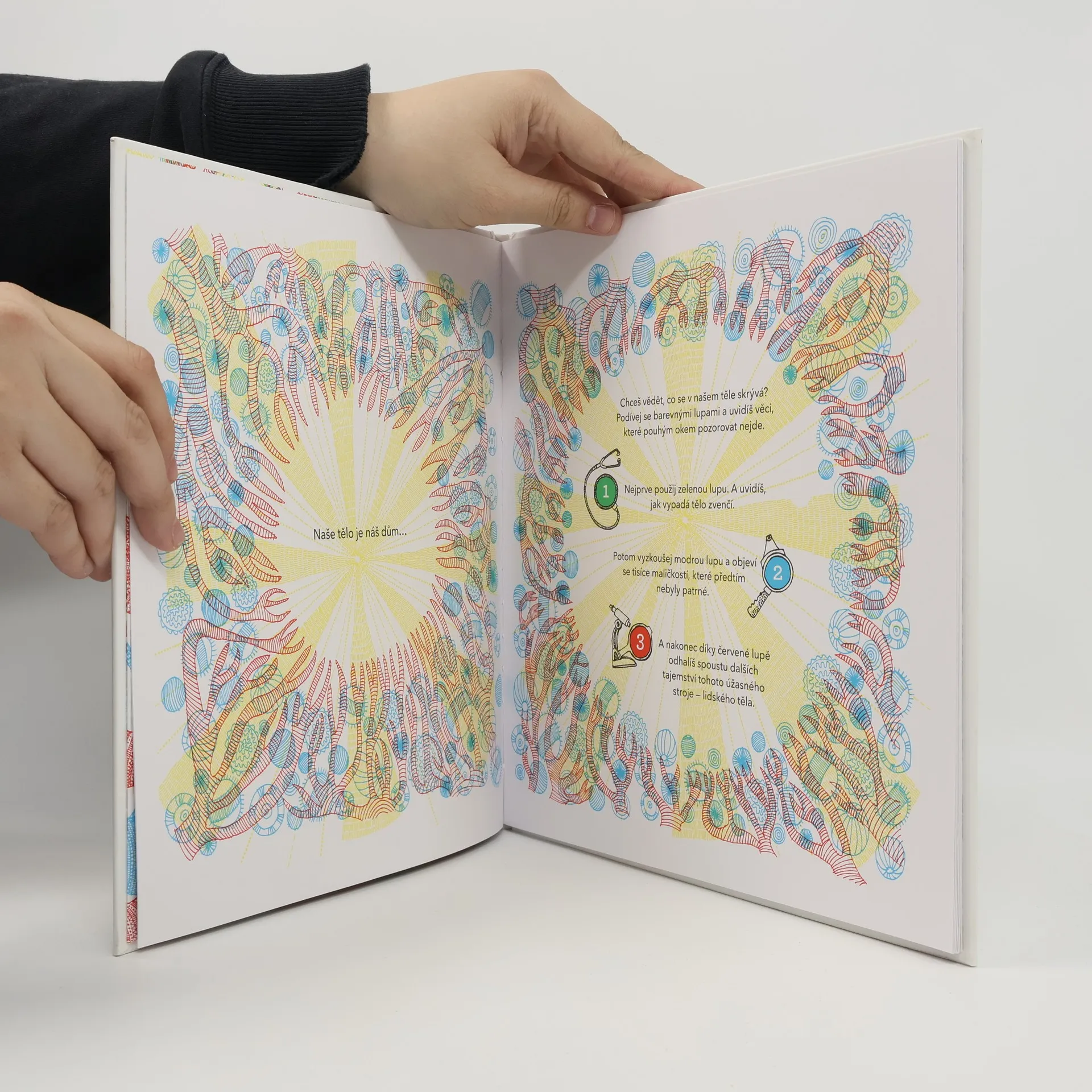 Co se skrývá v našem těle funguje na principu prohlížení obrázků přes barevné lupy (jsou ke knize přibaleny), které Vám odkrývají skryté kresby.