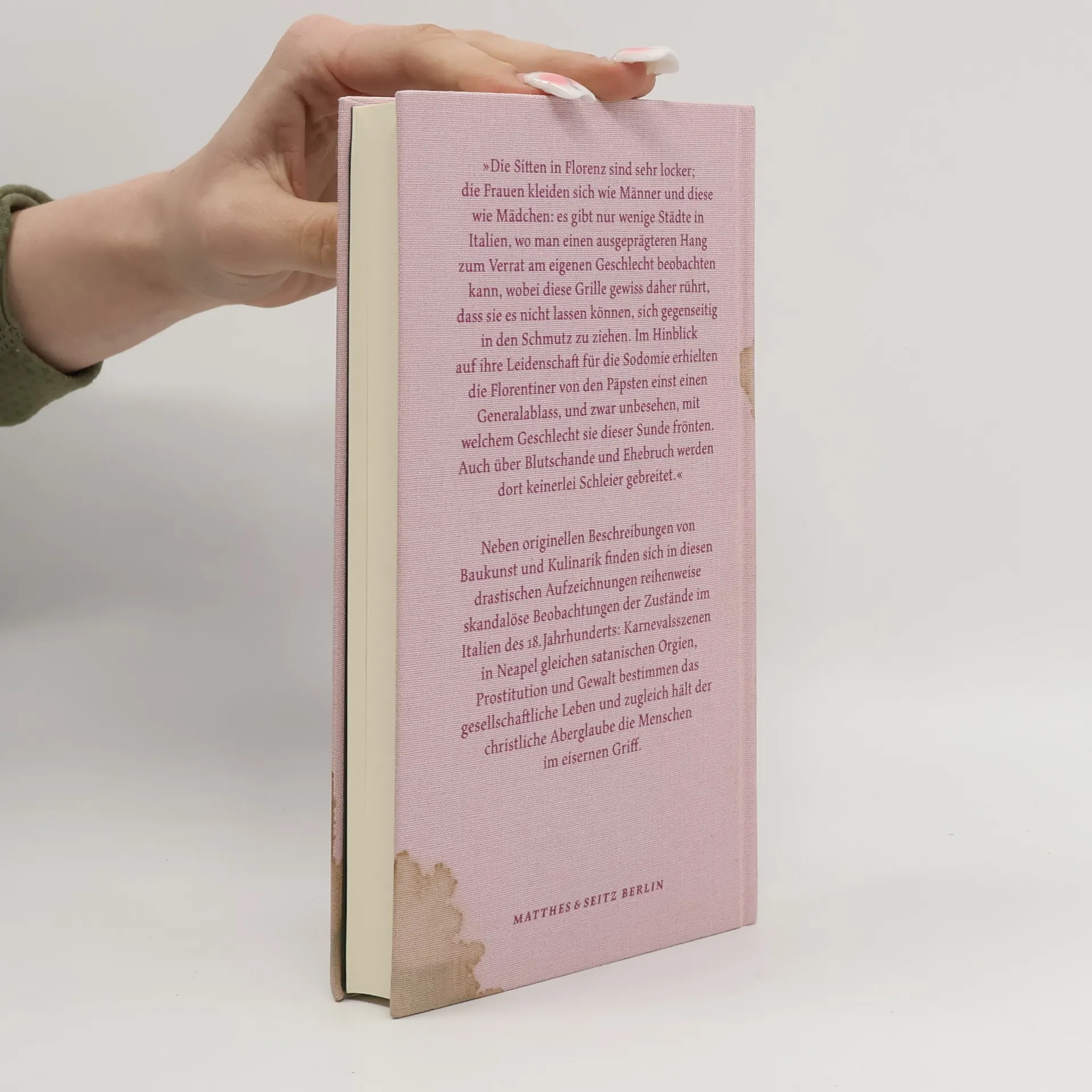 Nach einem außer Kontrolle geratenen Stelldichein mit vier Prostituierten in Marseille wird de Sade 1771 per königlichem Haftbefehl gesucht, doch der Marquis ist längst über alle Berge – gemeinsam mit der schönen Anne-Prospère, der jüngeren Schwester seiner Ehefrau Renée. In Italien durchlebt er mit seiner jungen Geliebten eine Amour fou und macht, seiner Leidenschaft für das Enzyklopädische folgend, in seinen Notizen Inventur der italienischen Kultur. Neben Beschreibungen von Baukunst und Kulinarik finden sich in den Aufzeichnungen skandalöse Beobachtungen: Karnevalsszenen in Neapel gleichen satanischen Orgien, Prostitution und Gewalt bestimmen das gesellschaftliche Leben und zugleich hält der christliche Aberglaube die Menschen im eisernen Griff. Die Reise endet mit de Sades Verhaftung. In Gefangenschaft versucht er zunächst, seinen drastischen Bericht zu einem Reiseführer für die feine Gesellschaft umzuarbeiten, verwirft diese Idee aber bald zugunsten der alle christlichen Werte infrage stellenden Monumentalromane Justine und Juliette. Stefan Zweifel zeigt kenntnisreich anhand ausgewählter Szenen aus de Sades Werk, wie die Italienreise als Folie durch sein Schaffen scheint und übersetzt gemeinsam mit Michael Pfister erstmals Auszüge aus den Reisenotizen ins Deutsche.