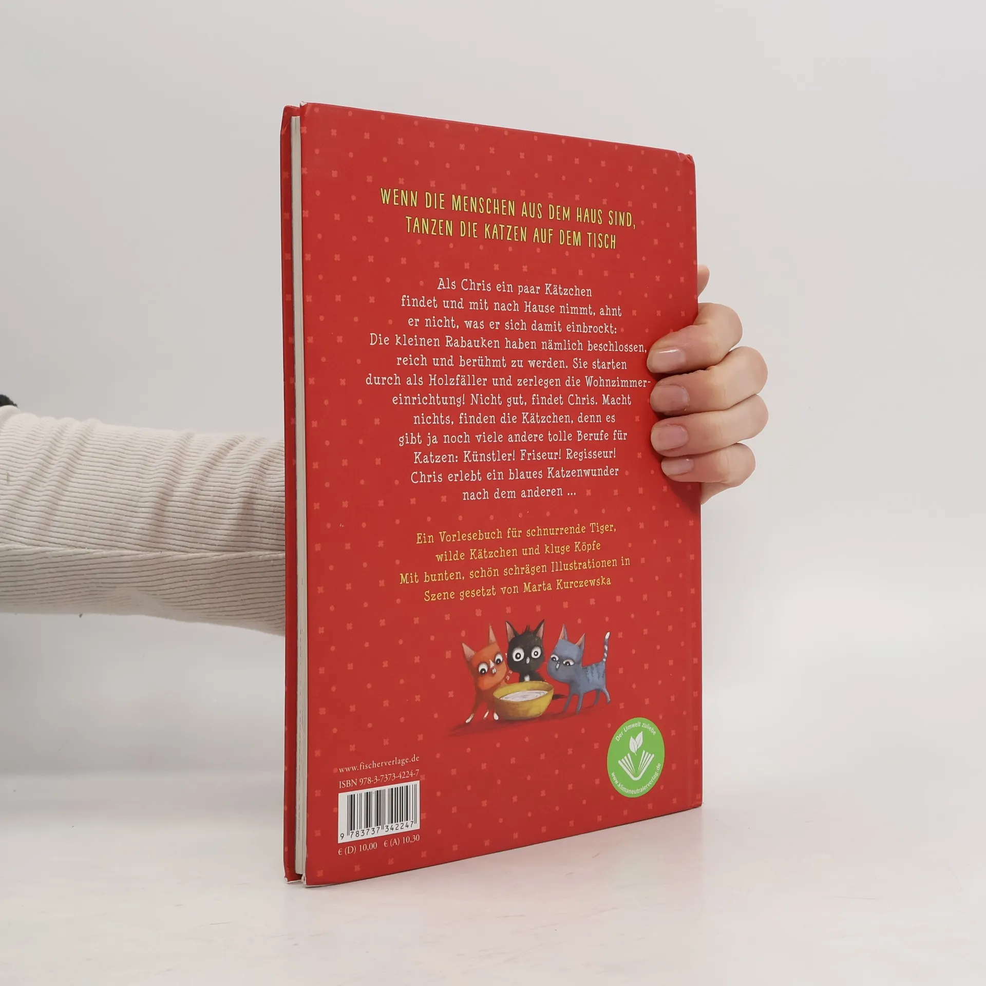 Sind die Menschen aus dem Haus, tanzen die Katzen auf den Tischen ... Als Chris ein paar Kätzchen findet und mit nach Hause nimmt, ahnt er nicht, was er sich damit einbrockt: Die kleinen Rabauken haben nämlich beschlossen, reich und berühmt zu werden. Sie starten durch als Holzfäller und zerlegen die Wohnzimmereinrichtung! Nicht gut, findet Chris. Macht nichts, finden die Kätzchen, denn es gibt ja noch viele andere tolle Berufe für Katzen: Künstler! Friseur! Regisseur! Chris erlebt ein blaues Katzenwunder nach dem anderen ... Ein Vorlesebuch für schnurrende Tiger, wilde Kätzchen und kluge Köpfe. Mit bunten, schön-schrägen Illustrationen in Szene gesetzt von Marta Kurczewska.