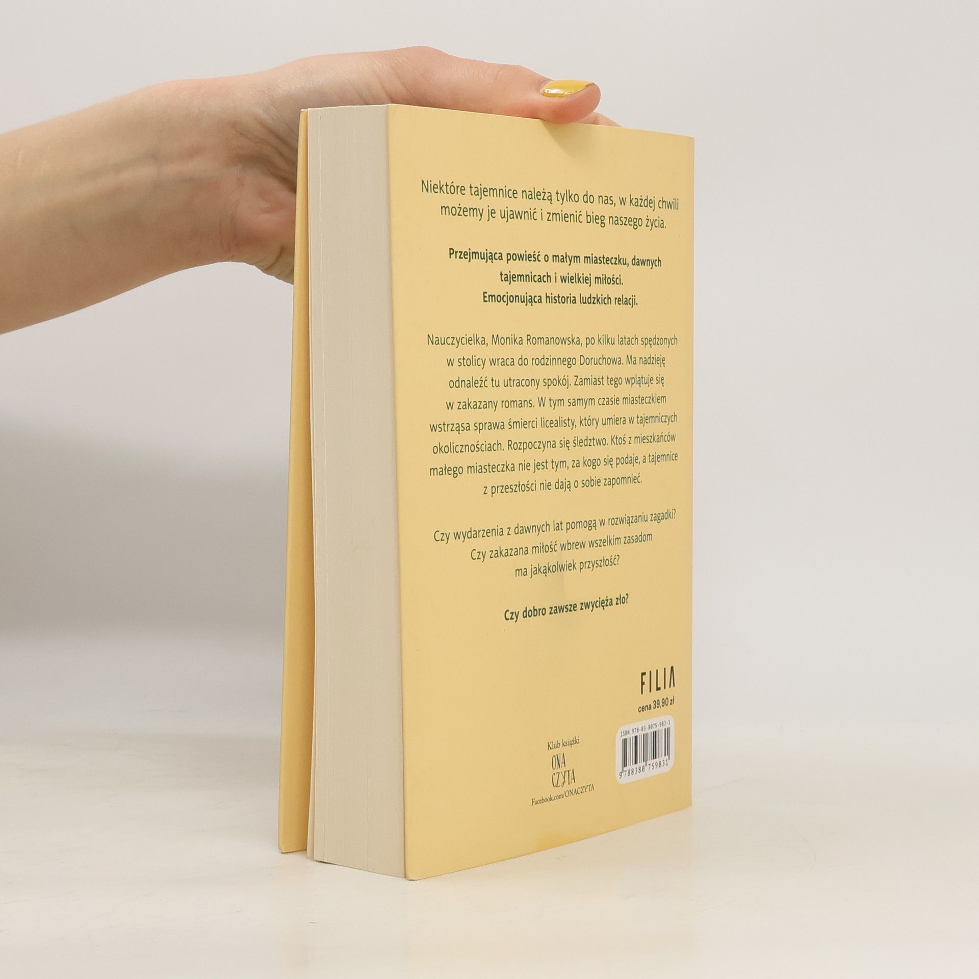 Niektóre tajemnice należą tylko do nas, w każdej chwili możemy je ujawnić i zmienić bieg naszego życia.Przejmująca powieść o małym miasteczku, dawnych tajemnicach i wielkiej miłości. Emocjonująca historia ludzkich relacji.Nauczycielka, Monika Romanowska, po kilku latach spędzonych w stolicy wraca do rodzinnego Doruchowa. Ma nadzieję odnaleźć tu utracony spokój. Zamiast tego wplątuje się w zakazany romans. W tym samym czasie miasteczkiem wstrząsa sprawa śmierci licealisty, który umiera w tajemniczych okolicznościach. Rozpoczyna się śledztwo. Ktoś z mieszkańców małego miasteczka nie jest tym, za kogo się podaje, a tajemnice z przeszłości nie dają o sobie zapomnieć.Liceum, niepokorni uczniowie, nauczycielka, zakazana miłość i zbrodnia – to wszystko w wyjątkowej powieści, która łączy elementy obyczajowe i psychologiczne.Czy wydarzenia z dawnych lat pomogą w rozwiązaniu zagadki? Czy zakazana miłość wbrew wszelkim zasadom ma jakąkolwiek przyszłość? Czy dobro zawsze zwycięża zło?