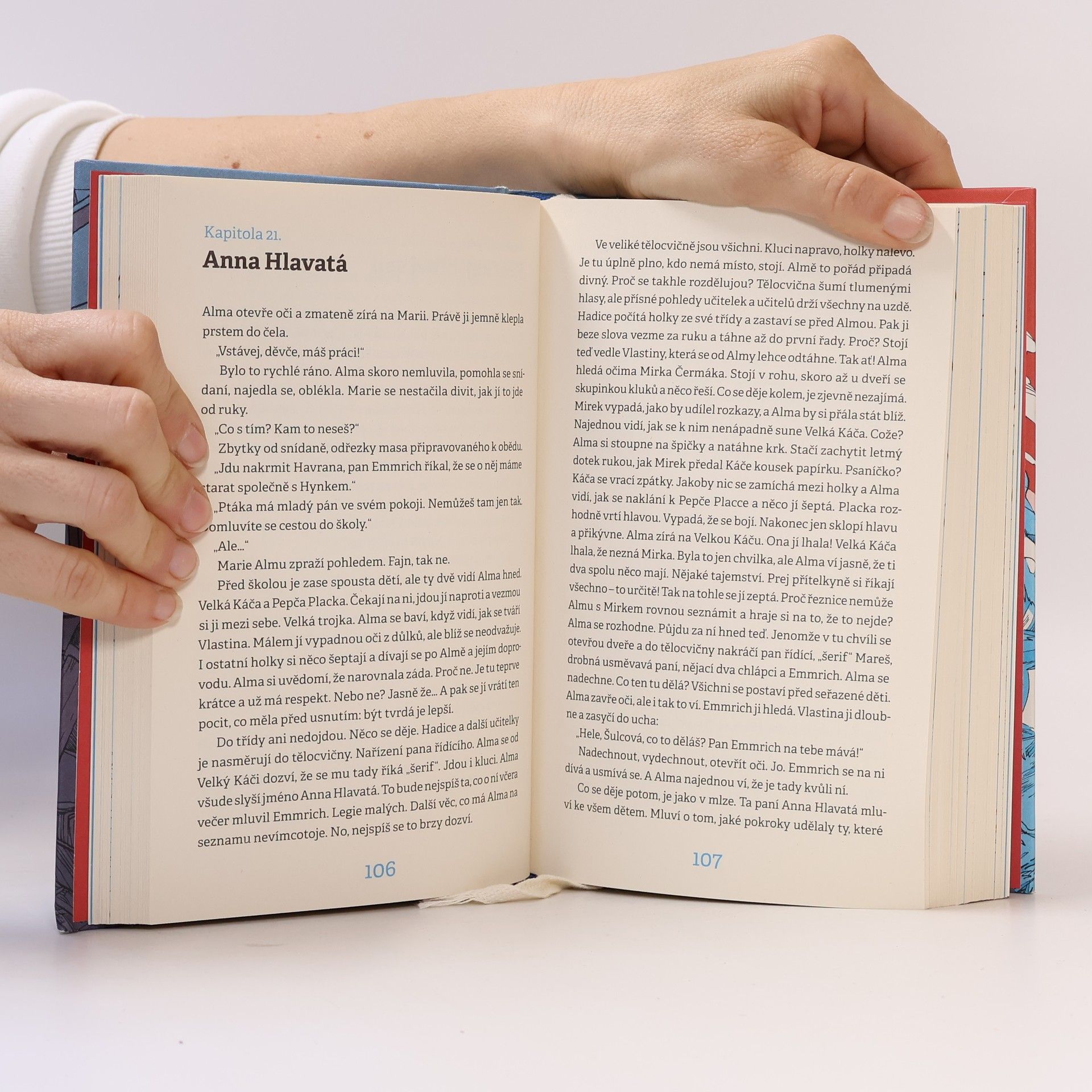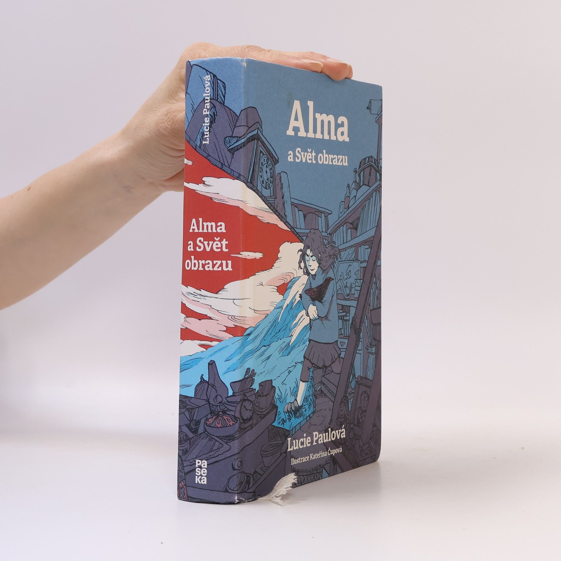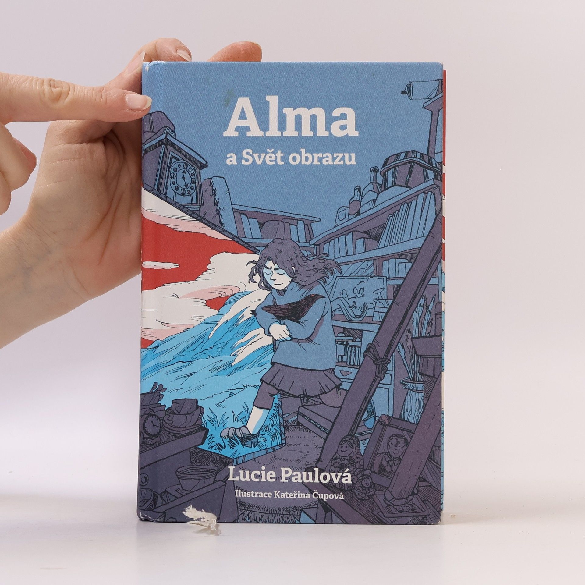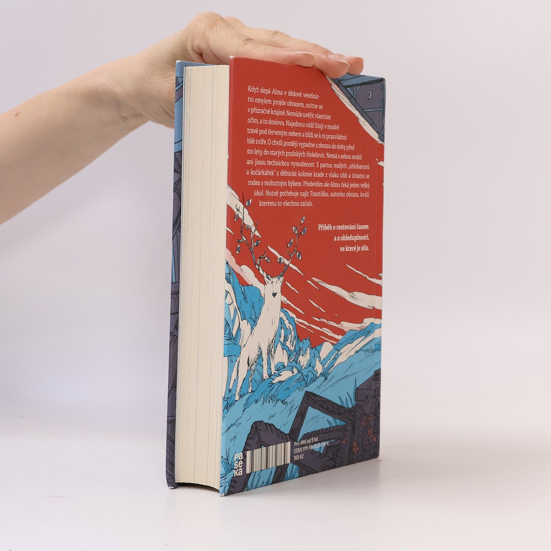 Když slepá Alma v dědově vetešnictví omylem projde obrazem, ocitne se v přízračné krajině. Nemůže uvěřit vlastním očím, a to doslova. Najednou vidí! Stojí v modré trávě pod červeným nebem a blíží se k ní prazvláštní bílé zvíře. Není to sen a není to ani místo, kde může zůstat. O chvíli později vypadne z obrazu do doby před sto lety. Všechno tu vypadá úplně jinak, než je Alma zvyklá. Problém jí dělá i obléknout si šaty se spoustou mrňavých knoflíčků, nakoupit na trhu nebo obstát ve třídě plné neznámých holek. Především ale Almu čeká jeden velký úkol. Nutně potřebuje najít Františku, autorku obrazu, kvůli kterému to všechno začalo. Pátrání po Františce je plné nečekaných zvratů a krkolomných dobrodružství. Alma si sice najde kamarády, ale pochopí, že dát věci do pořádku a udělat zásadní rozhodnutí musí jen ona sama.