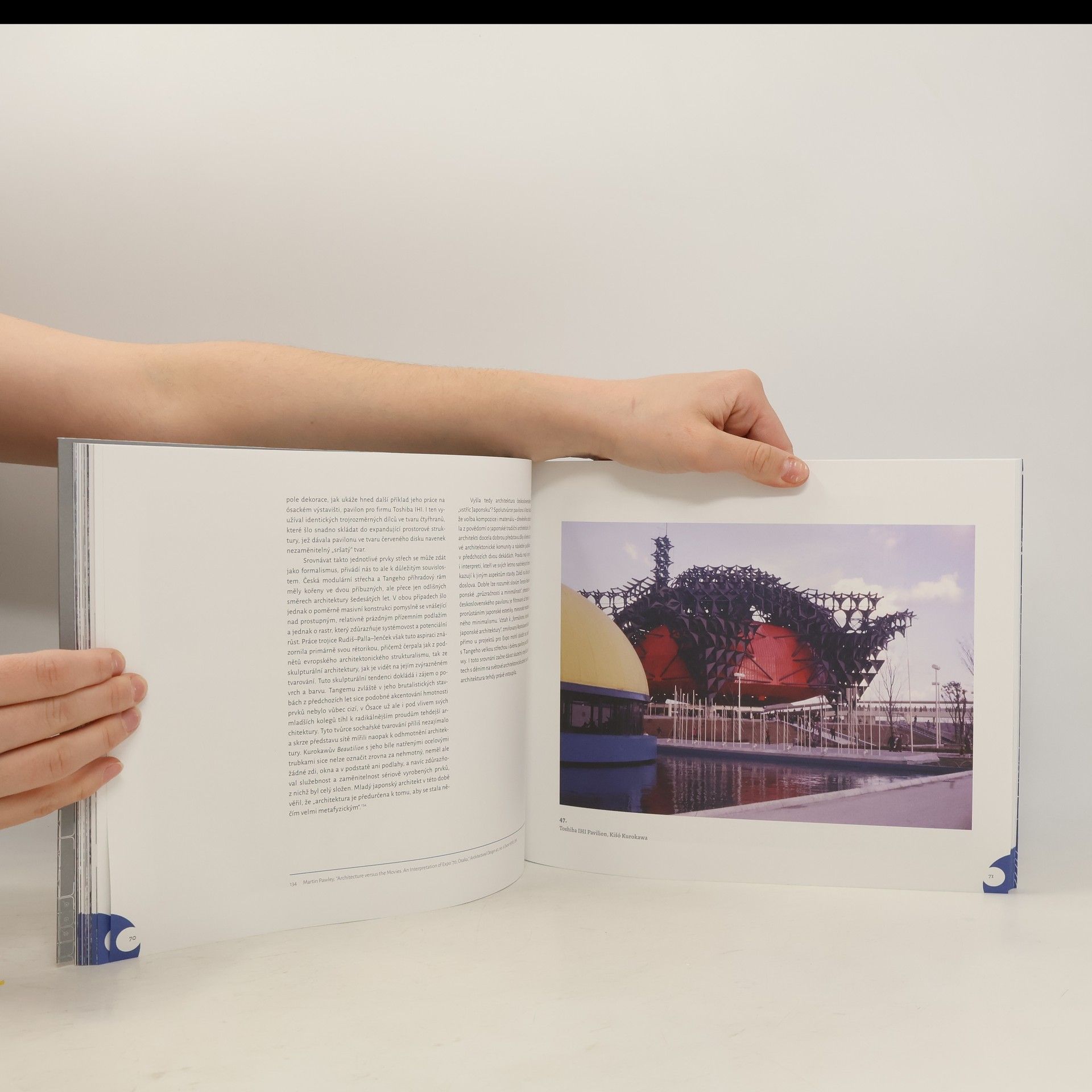 Kniha se zaměřuje na architektonické dění na Světové výstavě (Expo) v Ósace v roce 1970. Přináší novou interpretaci československého pavilonu, díla architektonického tria Rudiš, Palla a Jenček společně s týmem výtvarníků. Přibližuje nejprve proces poznávání japonské architektury a urbanismu očima zahraničních návštěvníků a ambivalentní status tehdejšího Japonska jako „země budoucnosti“. Architektura na výstavě a československý pavilon jsou poté konfrontovány z různých perspektiv: z pohledu architektonických forem, ideových koncepcí výstav i myšlenkových tendencí té doby. Právě ty na výstavě ve zhuštěné podobě předjímaly nadcházející vývoj architektury, urbanismu i celé civilizace. Text zúročuje široce založený výzkum českých a zahraničních zdrojů a čerpá z dobových dokumentů, svědectví tvůrců i dobové kritiky.