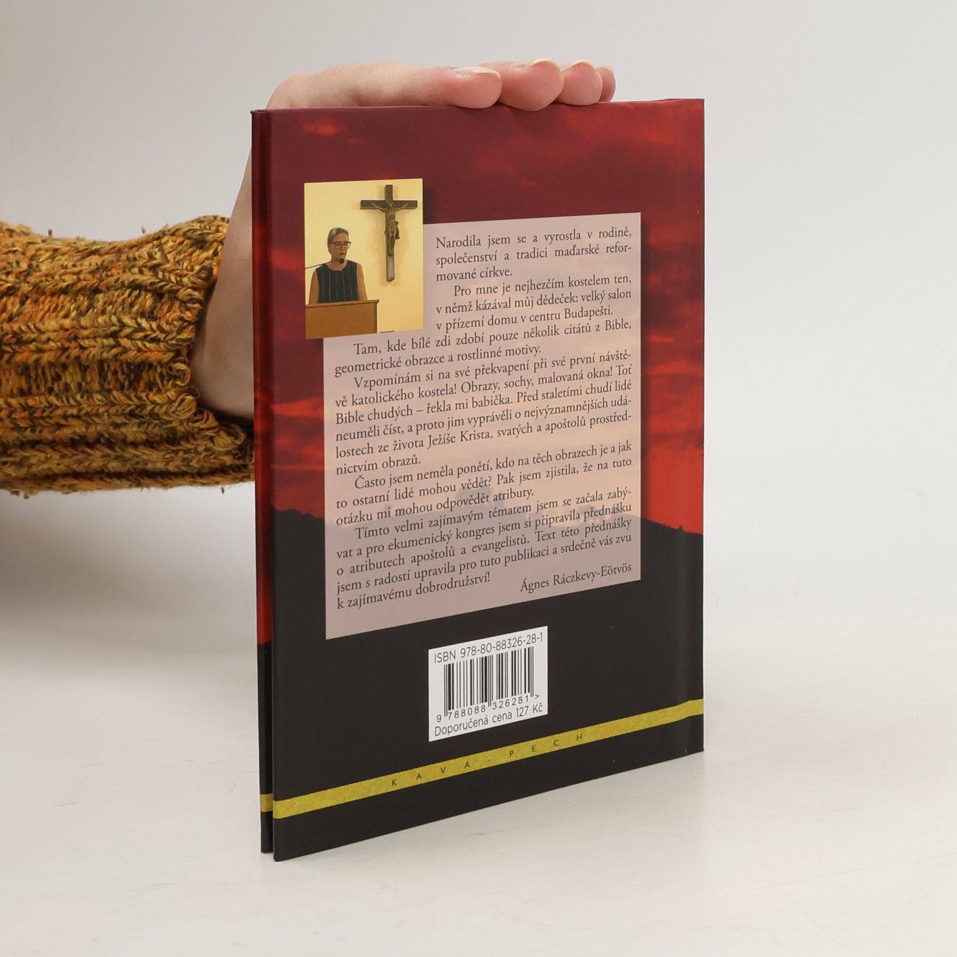 Podrobný popis atributů jednotlivých apoštolů a evangelistů doplněný mnohými ilustracemi. Nezbytná pomůcka nejen každého návštěvníka kostelů, ale i zvídavého turisty, často stojícího před sochou či obrazem některého svatého, netuše o koho se jedná. Takto to popisuje autorka: Narodila jsem se a vyrostla v rodině, společenství a tradici maďarské reformované církve. Pro mne je nejhezčím kostelem ten, v němž kázával můj dědeček: velký salon v přízemí domu v centru Budapešti. Tam, kde bílé zdi zdobí pouze několik citátů z Bible, geometrické obrazce a rostlinné motivy. Vzpomínám si na své překvapení při své první návštěvě katolického kostela! Obrazy, sochy, malovaná okna! Toť Bible chudých - řekla mi babička. Před staletími chudí lidé neuměli číst, a proto jim vyprávěli o nejvýznamnějších událostech ze života Ježíše Krista, svatých a apoštolů prostřednictvím obrazů. Často jsem neměla ponětí, kdo na těch obrazech je a jak to ostatní lidé mohou vědět? Pak jsem zjistila, že na tuto otázku mi mohou odpovědět atributy. Tímto velmi zajímavým tématem jsem se začala zabývat a pro ekumenický kongres jsem si připravila přednášku o atributech apoštolů a evangelistů. Text této přednášky jsem s radostí upravila pro tuto publikaci a srdečně vás zvu k zajímavému dobrodružství! Ágnes Ráczkevy-Eötvös