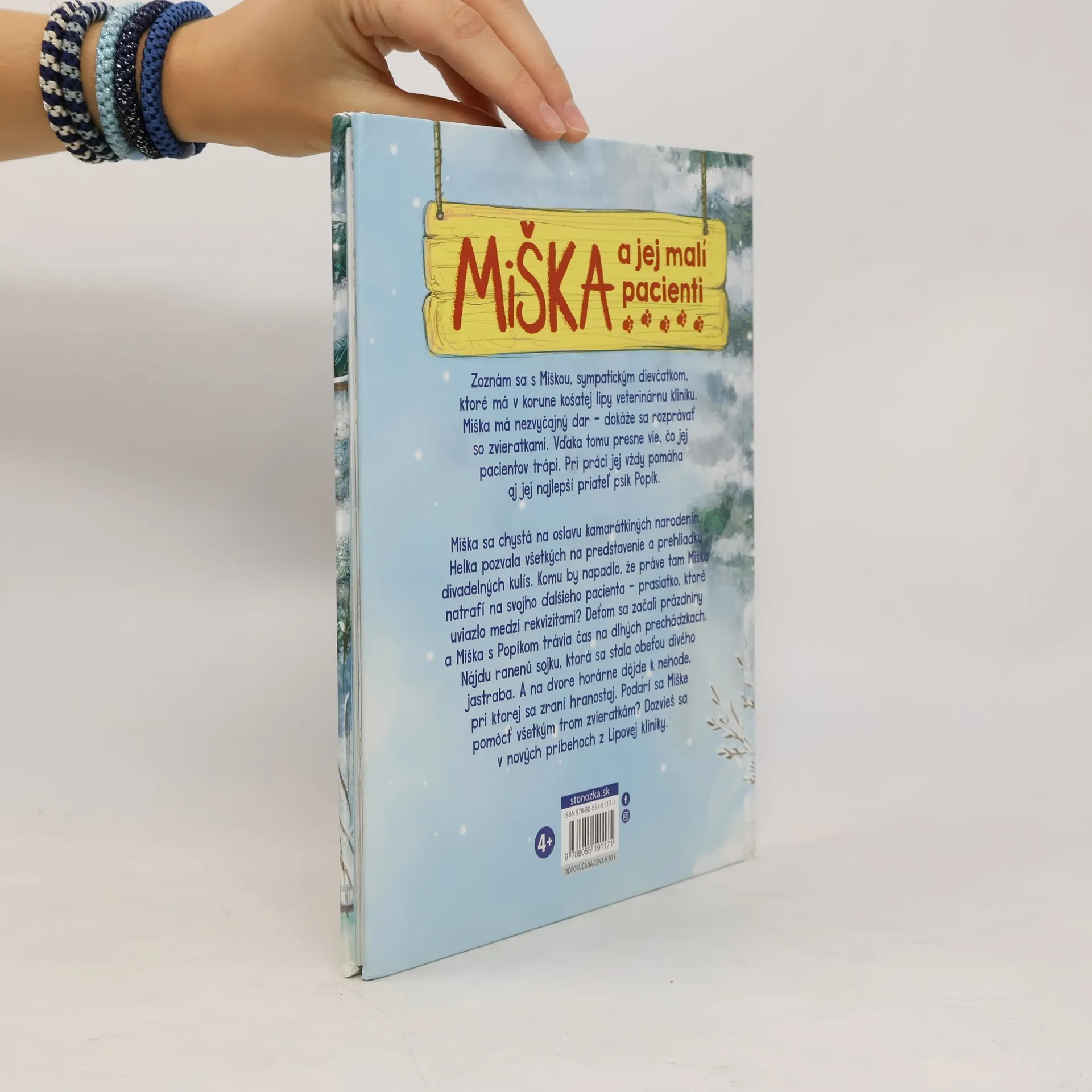 Zoznám sa so sympatickou Miškou, ktorá má v korune košatej lipy veterinárnu kliniku. Miška má nezvyčajný dar – dokáže sa rozprávať so zvieratkami. Vďaka tomu presne vie, čo jej pacientov trápi. Pri práci jej vždy pomáha aj jej najlepší priateľ psík Popík. Miška sa chystá na oslavu kamarátkiných narodenín. Helka pozvala všetkých na predstavenie a prehliadku divadelných kulís. Komu by napadlo, že práve tam Miška natrafí na svojho ďalšieho pacienta – prasiatko, ktoré uviazlo medzi rekvizitami? Deťom sa začali prázdniny a Miška s Popíkom trávia čas na dlhých prechádzkach. Nájdu ranenú sojku, ktorá sa stala obeťou divého jastraba. A na dvore horárne dôjde k nehode, pri ktorej sa zraní hranostaj. Podarí sa Miške pomôcť všetkým trom zvieratkám? Dozvieš sa v nových príbehoch z Lipovej kliniky. Pre deti od 4 rokov Z poľského originálu preložila Silvia Kaščáková.