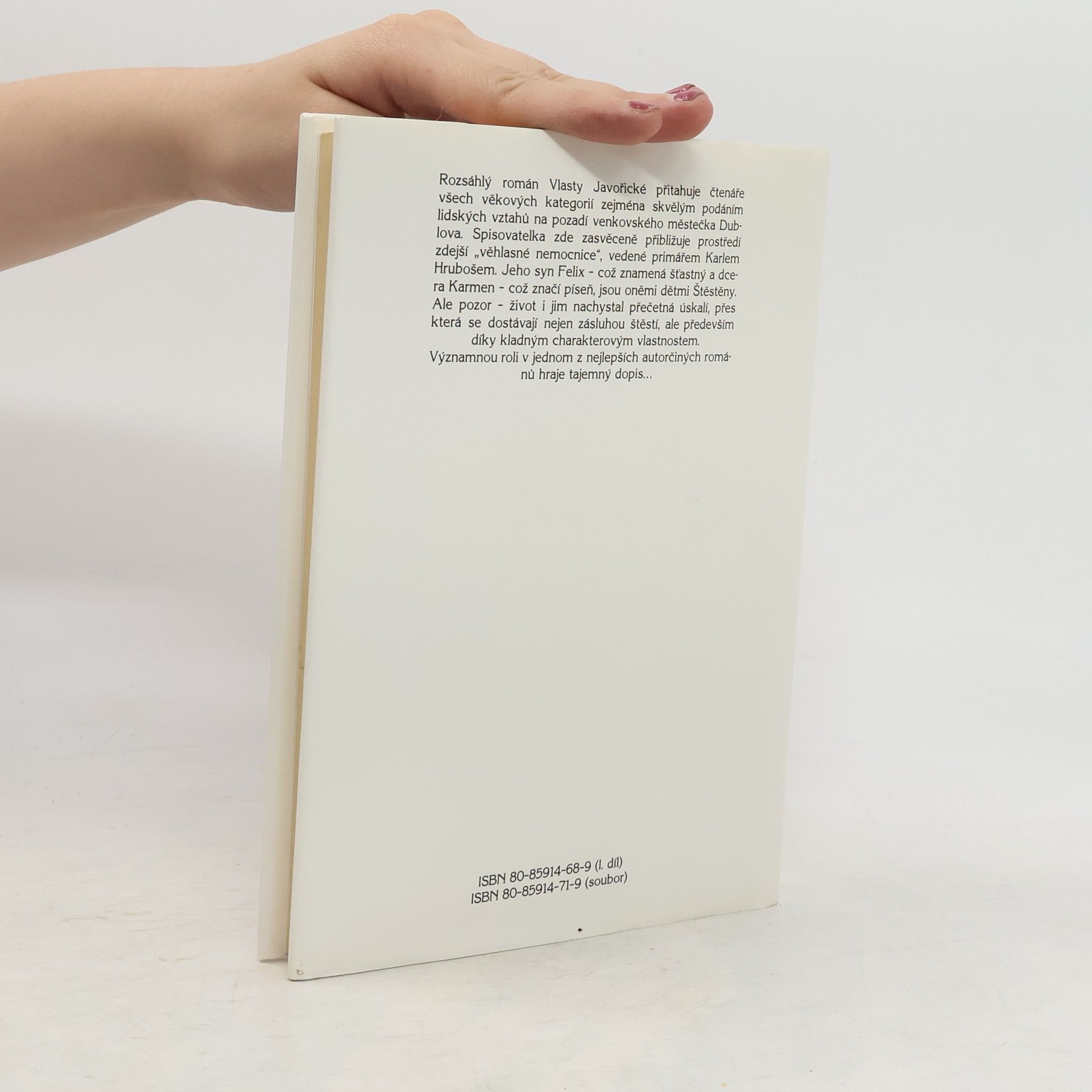 Rozsáhlý román Vlasty Javořické přitahuje čtenáře všech věkových kategorií zejména skvělým podáním lidských vztahů na pozadí venkovského městečka Dublova. Spisovatelka zde zasvěceně přibližuje prostředí zdejší věhlasné nemocnice, vedené primářem Karlem Hrubošem. Jeho syn Felix - což znamená šťastný - a dcera Karmen - což značí píseň, jsou oněmi dětmi Štěstěny. Ale pozor - i jim život nachystal přečetná úskalí, přes která se dostávají nejen zásluhou štěstí, ale především díky kladným charakterovým vlastnostem. Významnou roli v jednom z nejlepších autorčiných románů hraje tajemný dopis méně textu