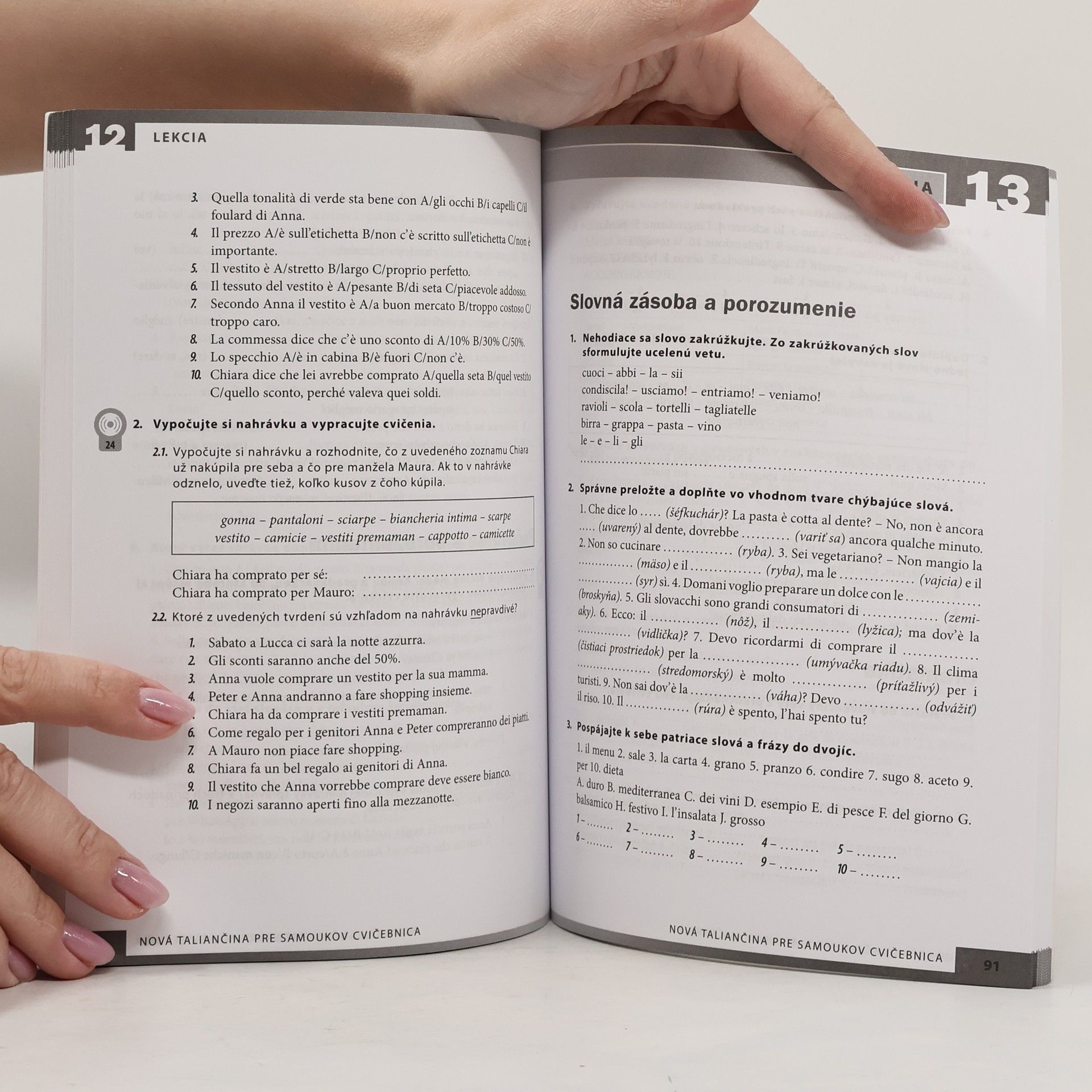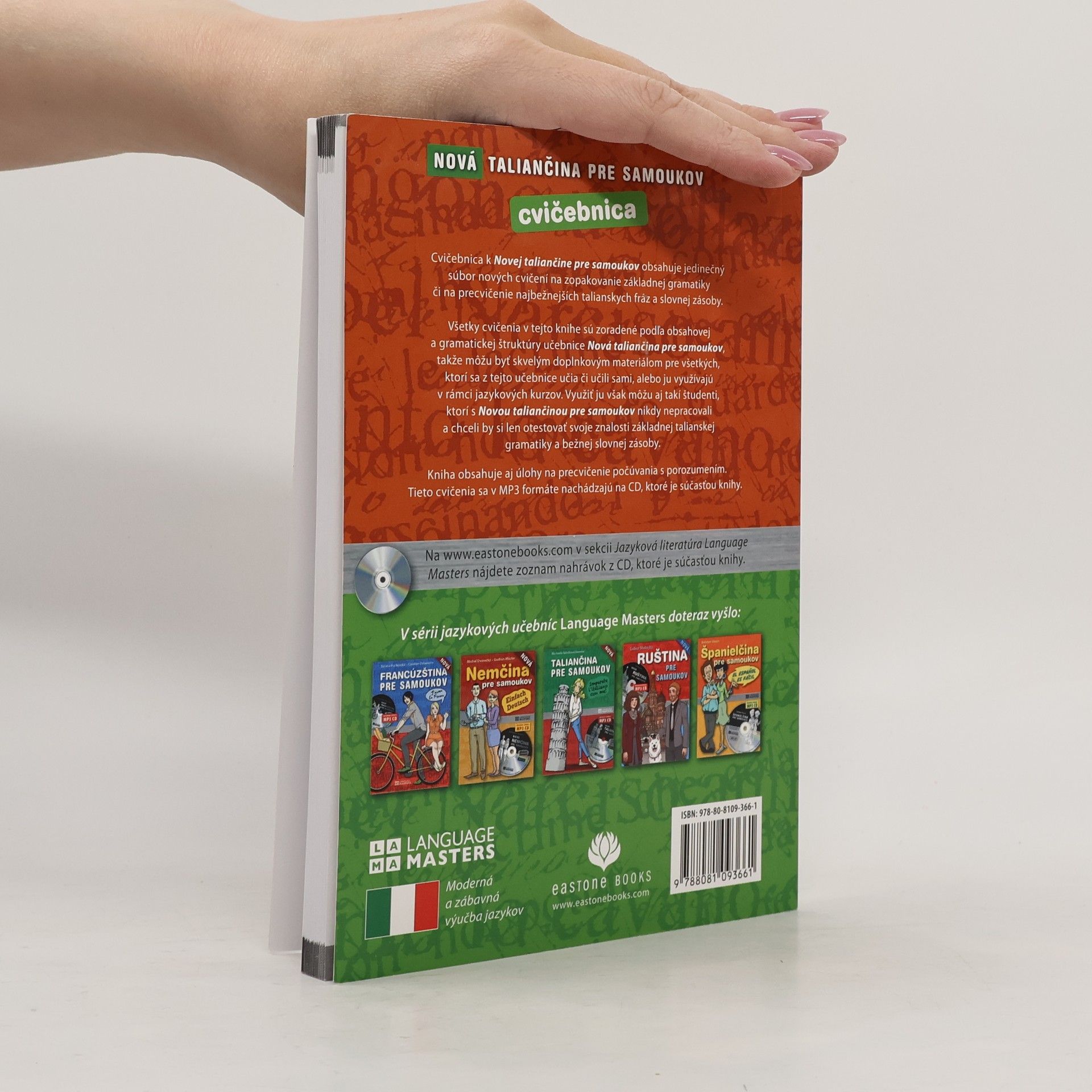 Cvičebnica k Novej taliančine pre samoukov obsahuje nové cvičenia na zopakovanie základnej gramatiky či na precvičenie najbežnejších talianskych fráz a slovnej zásoby. Všetky cvičenia v tejto knihe sú zoradené podľa obsahovej a gramatickej štruktúry učebnice Nová taliančina pre samoukov, takže môžu byť skvelým doplnkovým materiálom pre všetkých, ktorí sa z tejto učebnice učia či učili sami, alebo ju využívajú v rámci jazykových kurzov. Využiť ju však môžu aj takí študenti, ktorí s Novou taliančinou pre samoukov nikdy nepracovali a chceli by si len otestovať svoje znalosti základnej talianskej gramatiky a bežnej slovnej zásoby. Kniha obsahuje aj úlohy na precvičenie počúvania s porozumením. Úroveň cvičení v tejto knihe je od A1 po B1 podľa Spoločného európskeho referenčného rámca pre jazykové znalosti.