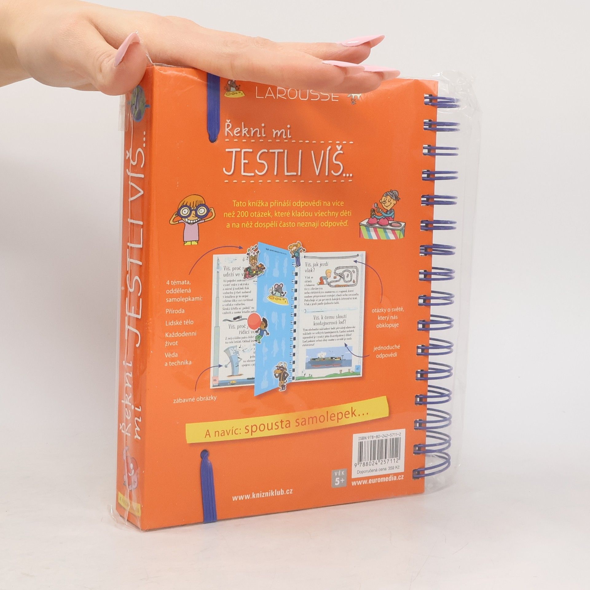 Další z oblíbených encyklopedií pro zvídavé děti z edice „Řekni mi“ se věnuje světu, který nás obklopuje, ve čtyřech tematických oddílech – Příroda, Lidské tělo, Každodenní život a Věda a technika. Odpovídá na více než 200 přemýšlivých otázek typu co je to zemská atmosféra, jak vznikne modřina, jak vzniká zvuk klavíru či jak se tiskne poštovní známka… Knížka s praktickou spirálovou vazbou jako obvykle nabízí půvabné a vtipné ilustrace a nechybí ani tři listy se samolepkami.
